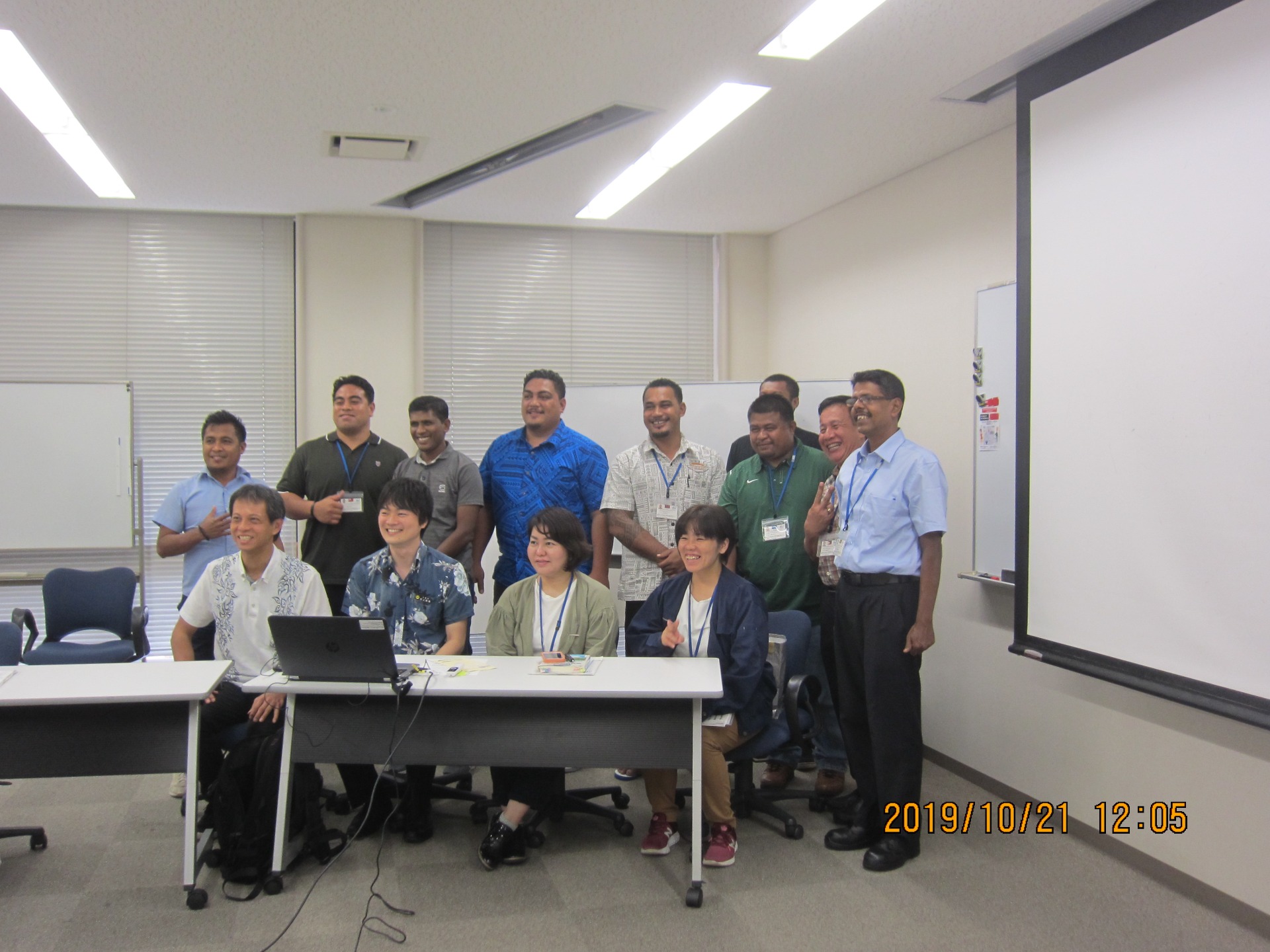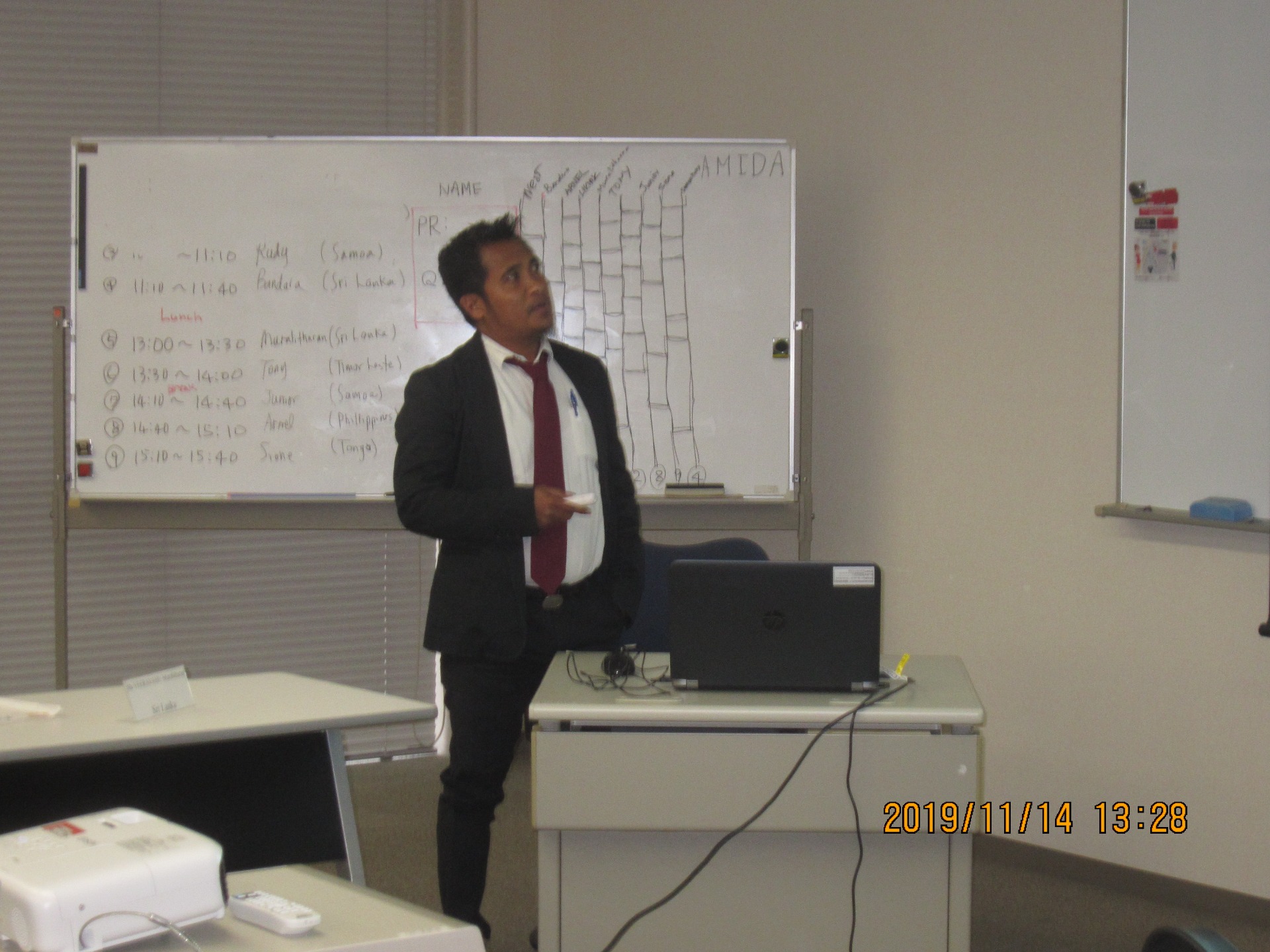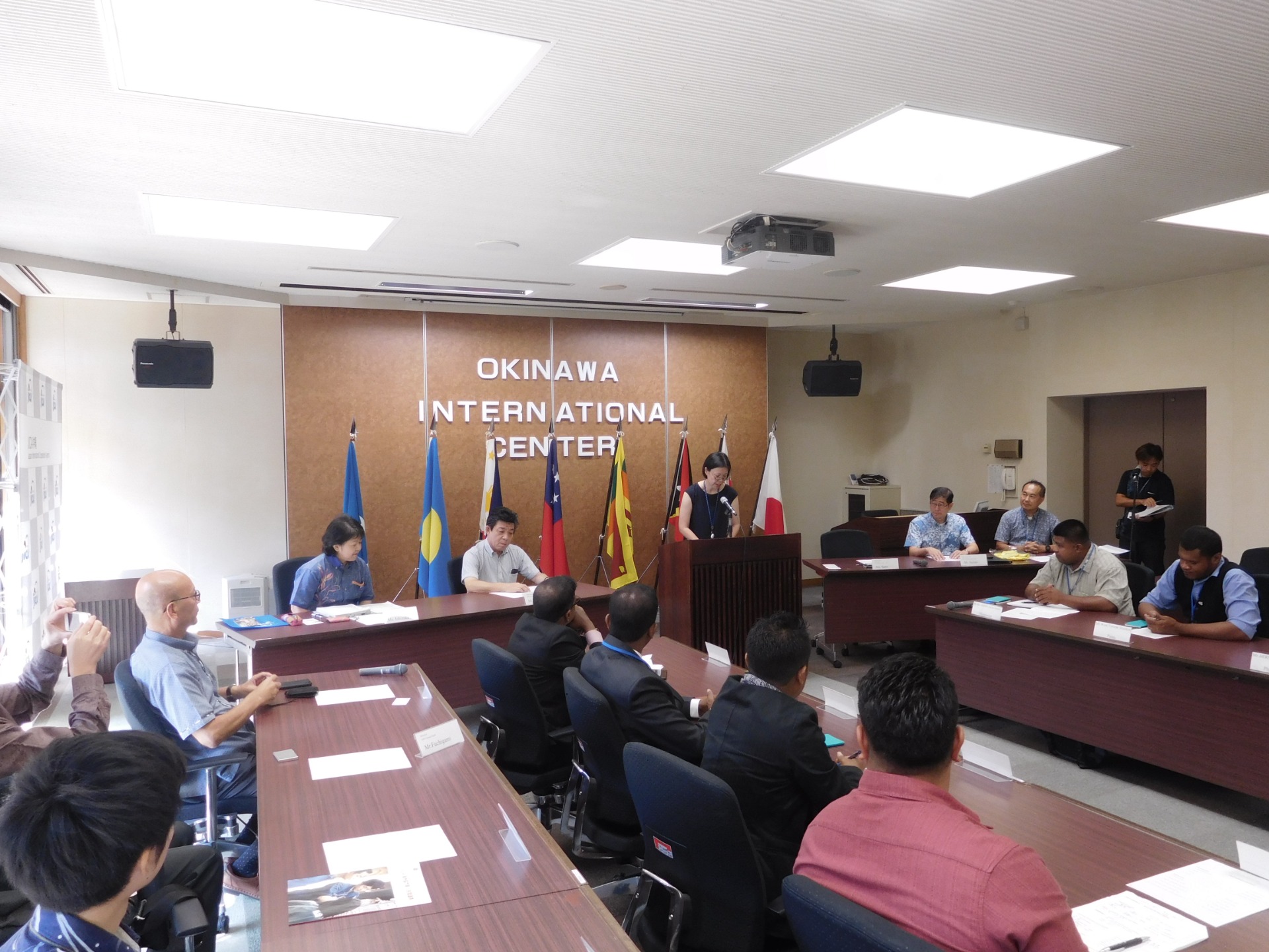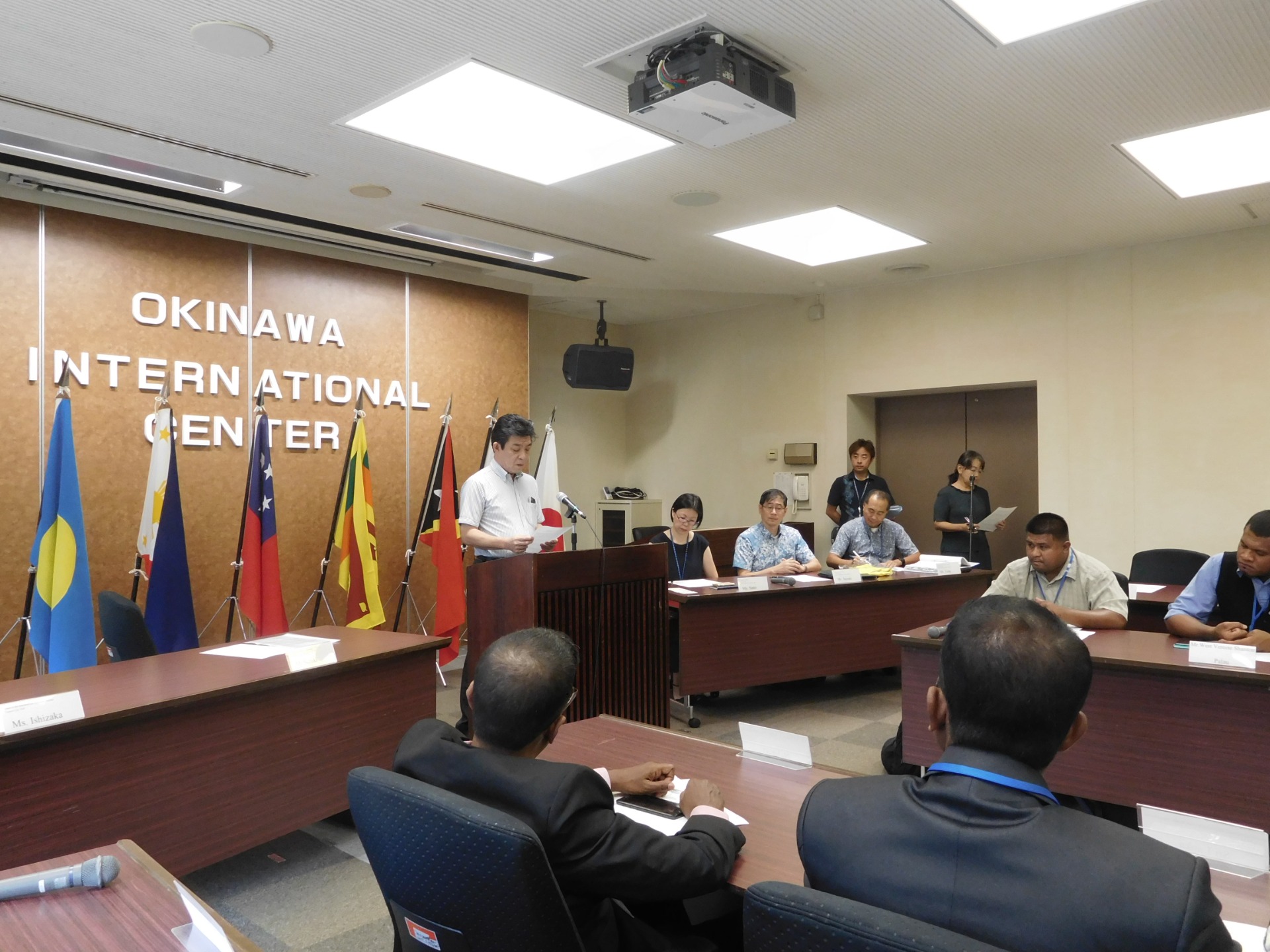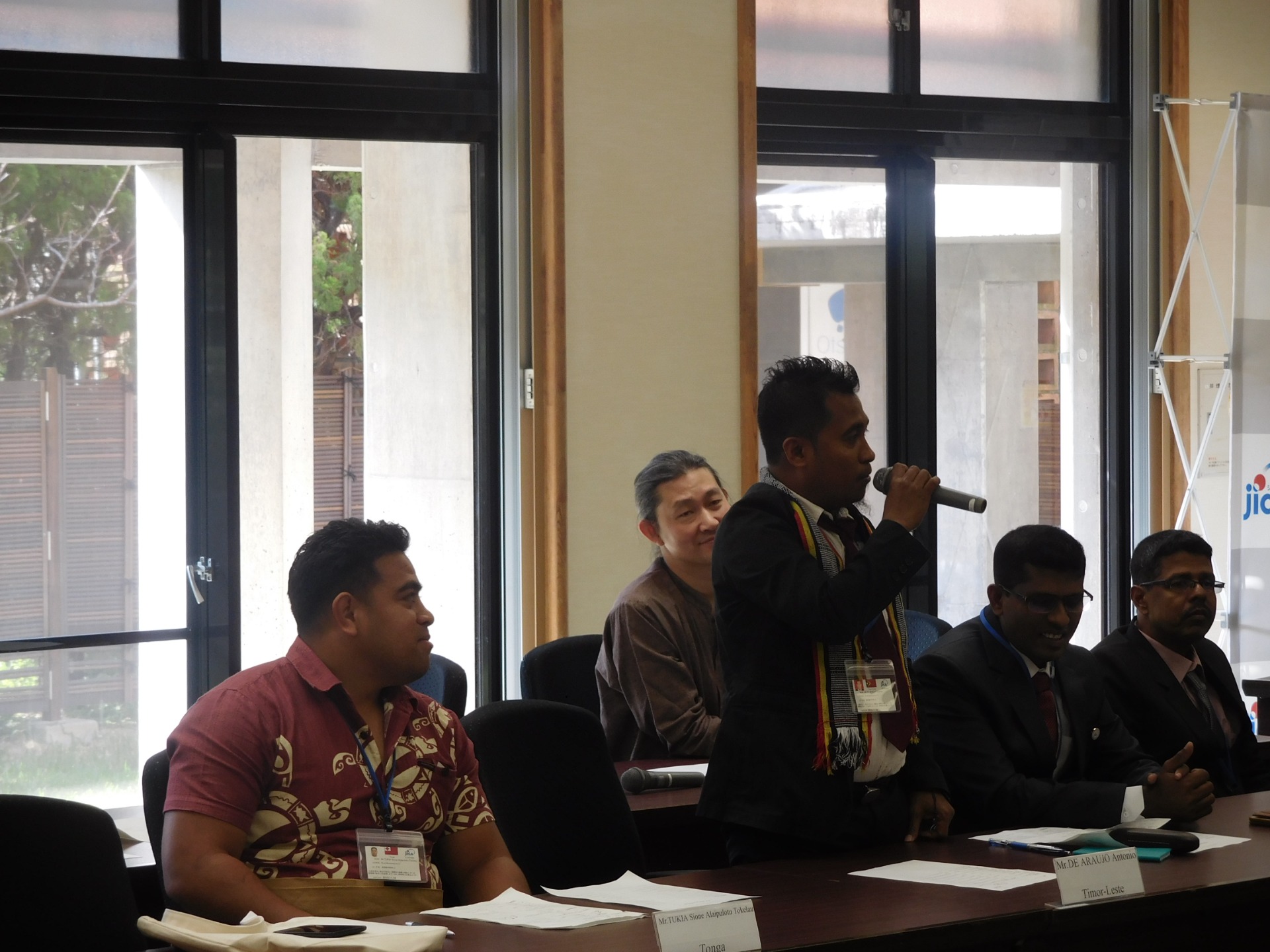 本日は研修生の「サマリーレポート発表会」でした。今回の研修で学んだことを自国の課題等にどのように役立てられるのか等をレポートに纏め、研修生一人一人が発表しました。発表時間はひとり30分(発表15分、質疑応答等15分)でした。コメンテーターとして矢吹先生(琉球大学)、下地さん(沖縄総合事務局)、前村さん(沖縄県)、及び松田さん(しまたて協会)に出席して頂きました。各コメンテーターと各研修生の質疑応答、また適切なコメンテーターからのアドバイス等を頂きました。研修生各国の課題解決に向けて、前向きな議論、アドバイス等があり、今後の取組が待たれます。