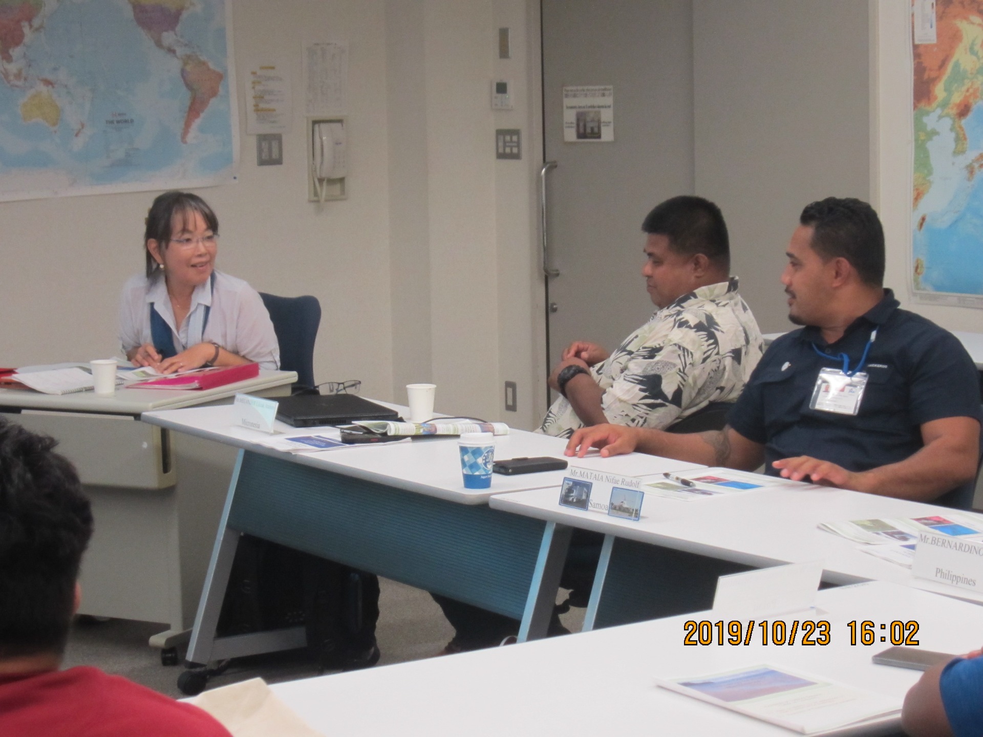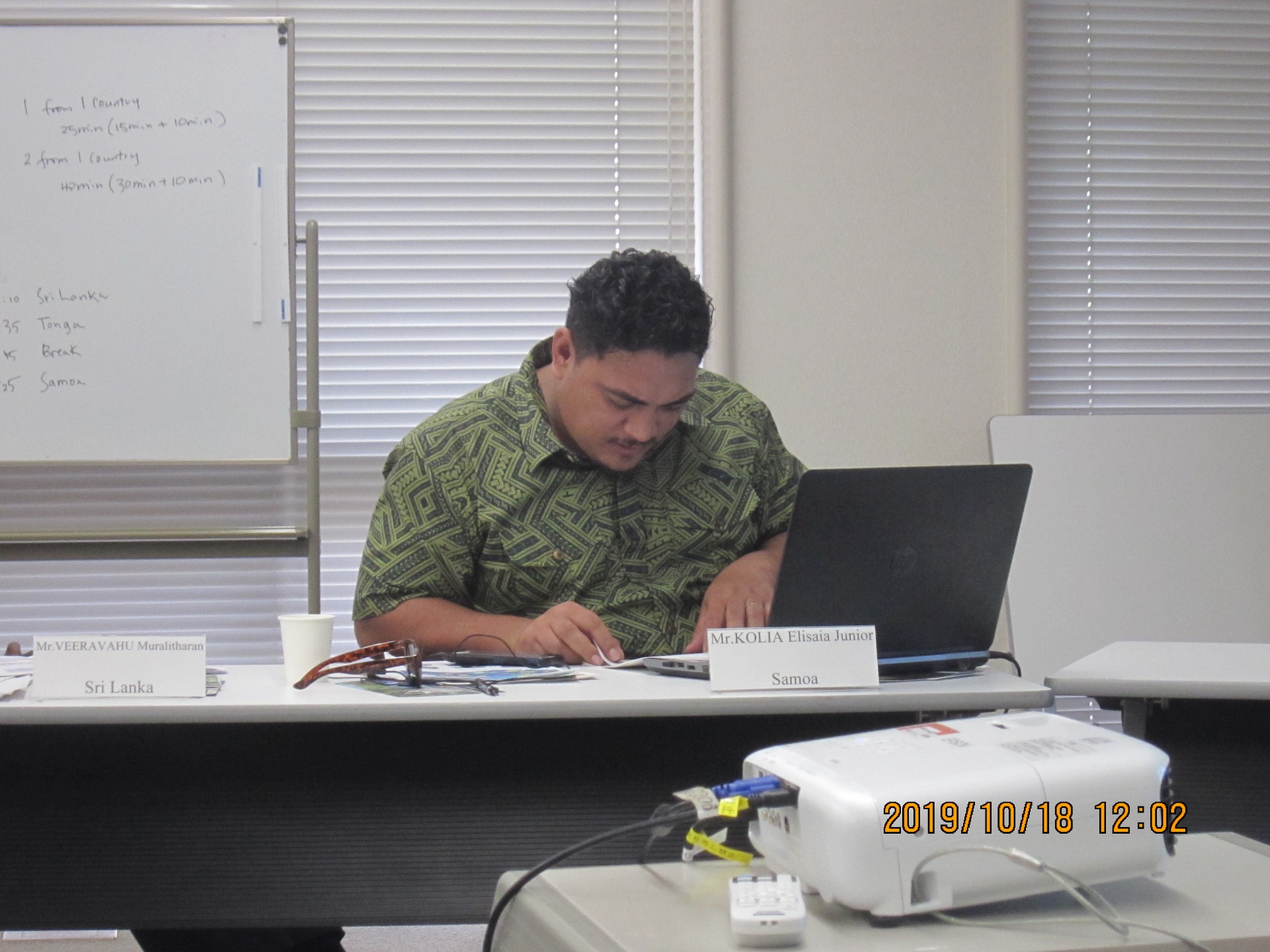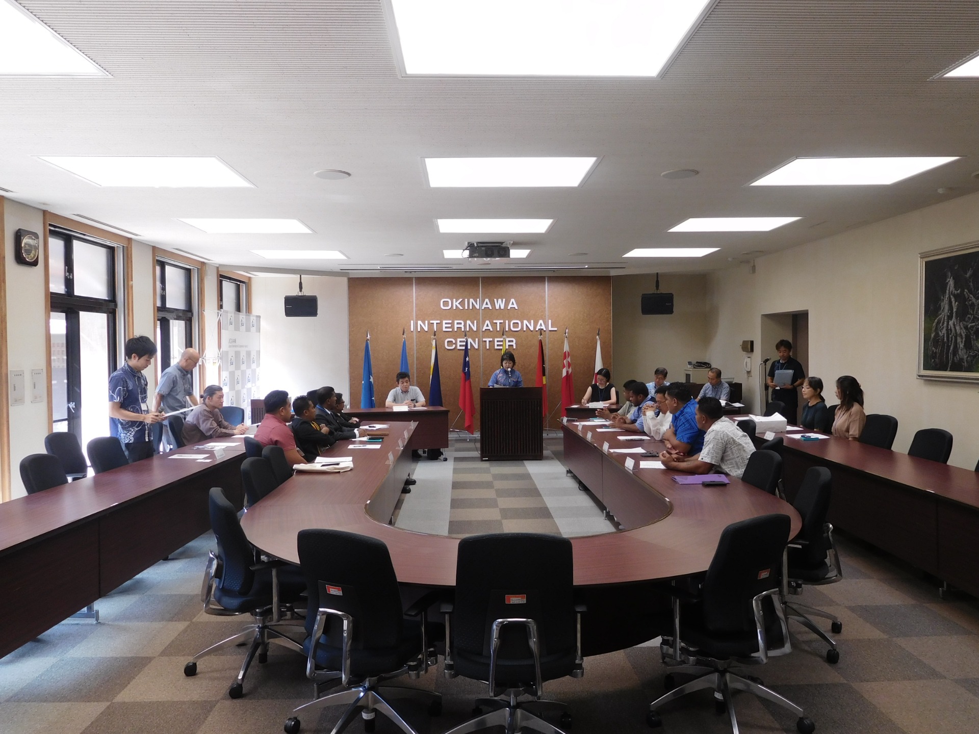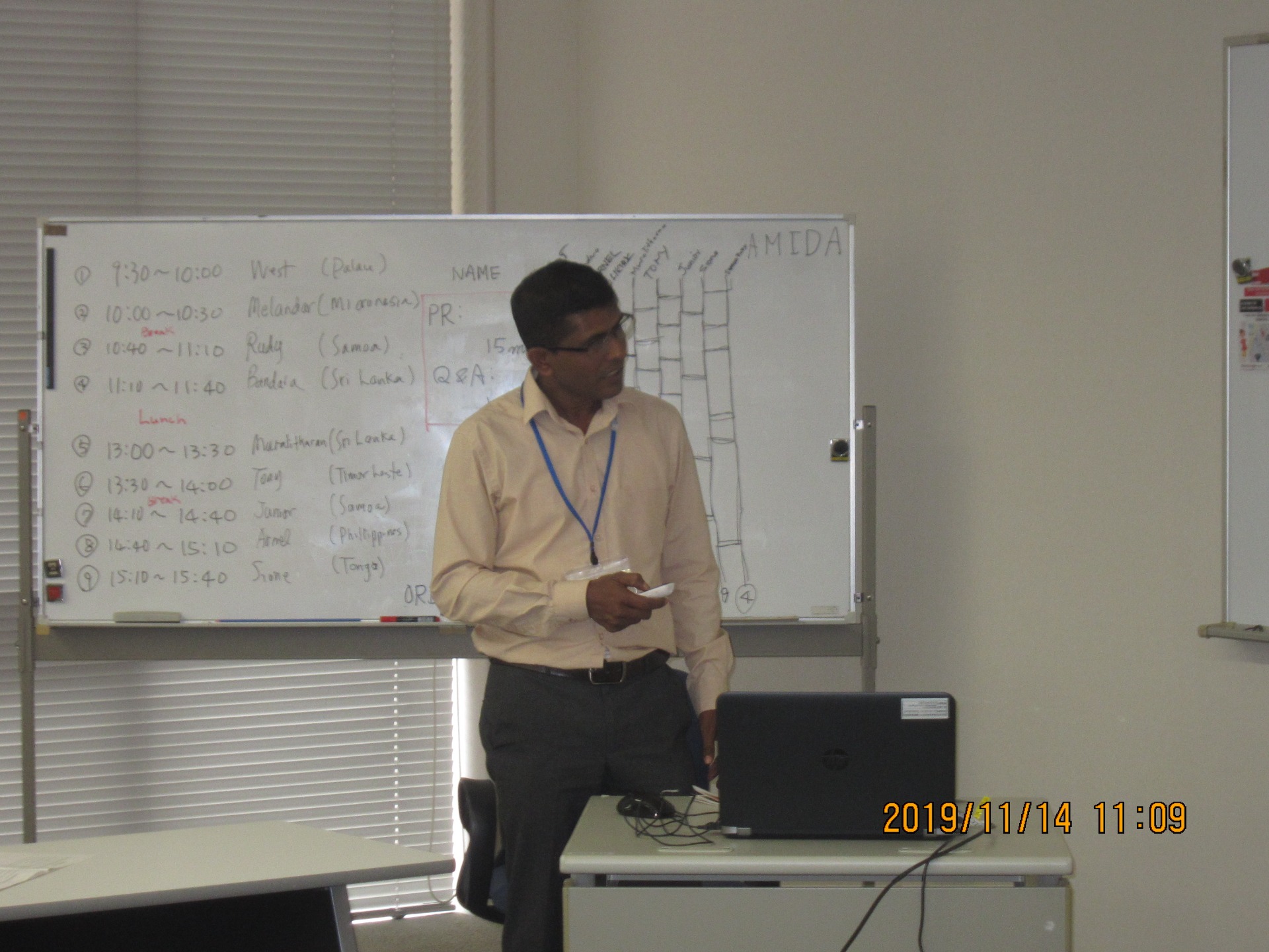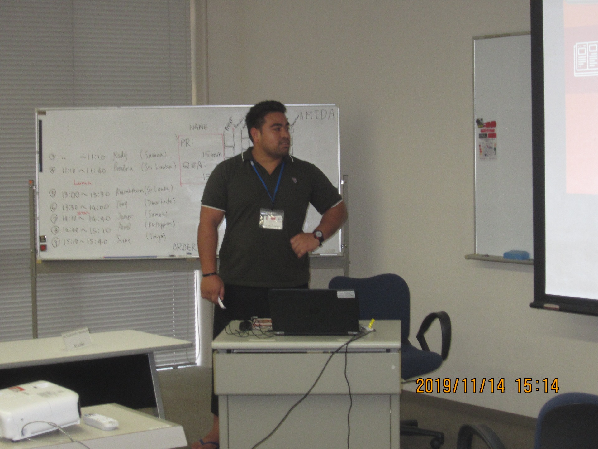 本日は研修生の「サマリーレポート発表会」でした。今回の研修で学んだことを自国の課題等にどのように役立てられるのか等をレポートに纏め、研修生一人一人が発表しました。発表時間はひとり30分(発表15分、質疑応答等15分)でした。コメンテーターとして矢吹先生(琉球大学)、下地さん(沖縄総合事務局)、前村さん(沖縄県)、及び松田さん(しまたて協会)に出席して頂きました。各コメンテーターと各研修生の質疑応答、また適切なコメンテーターからのアドバイス等を頂きました。研修生各国の課題解決に向けて、前向きな議論、アドバイス等があり、今後の取組が待たれます。