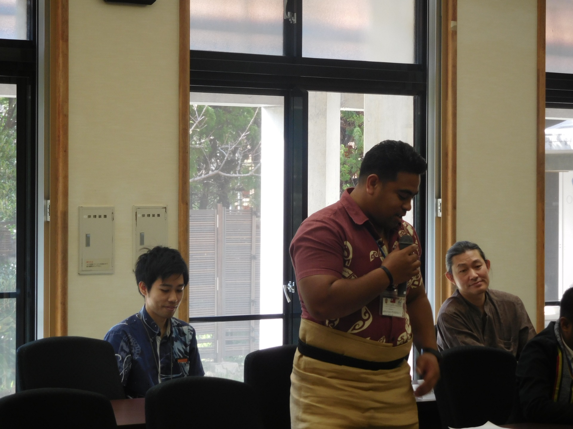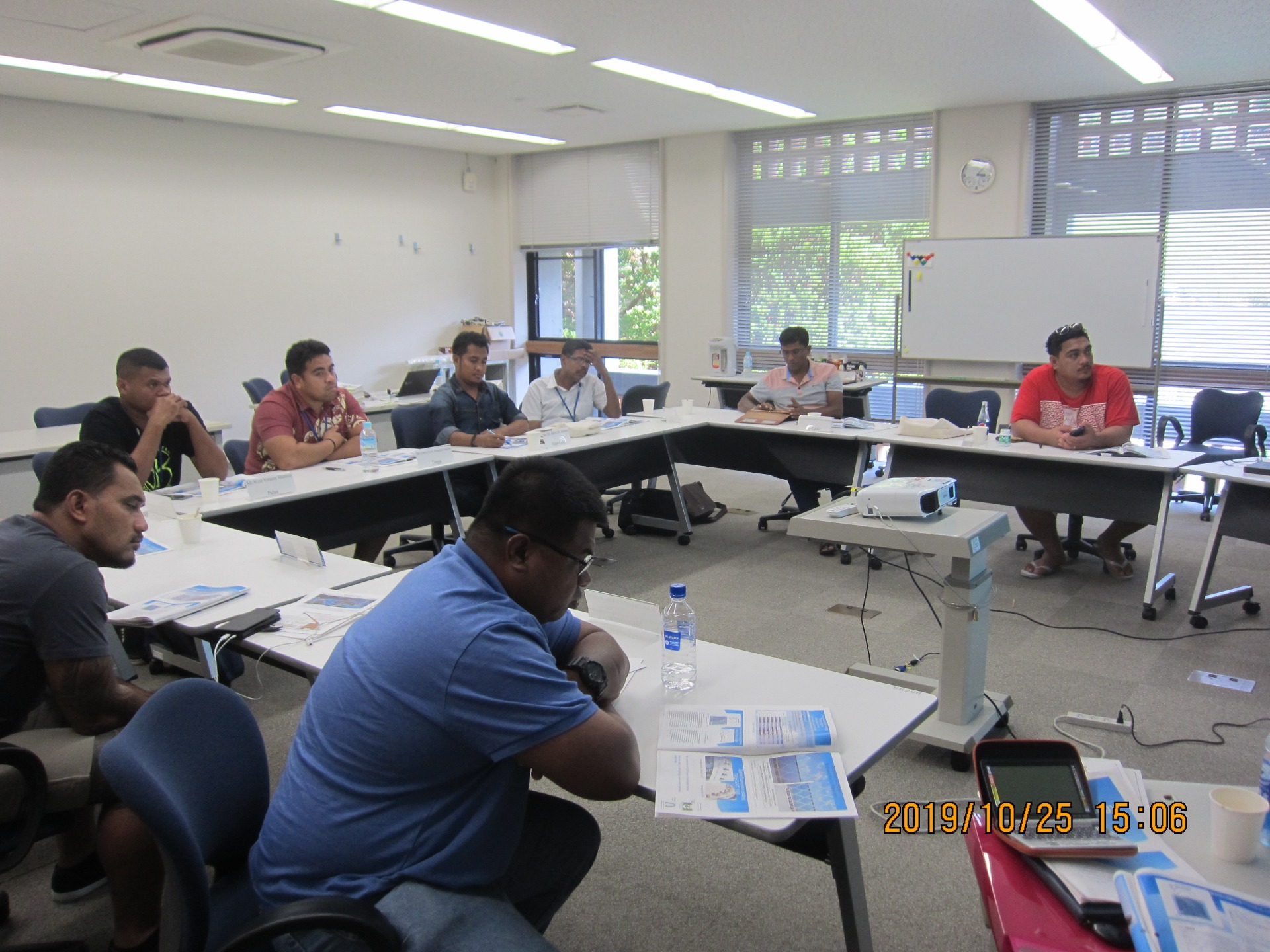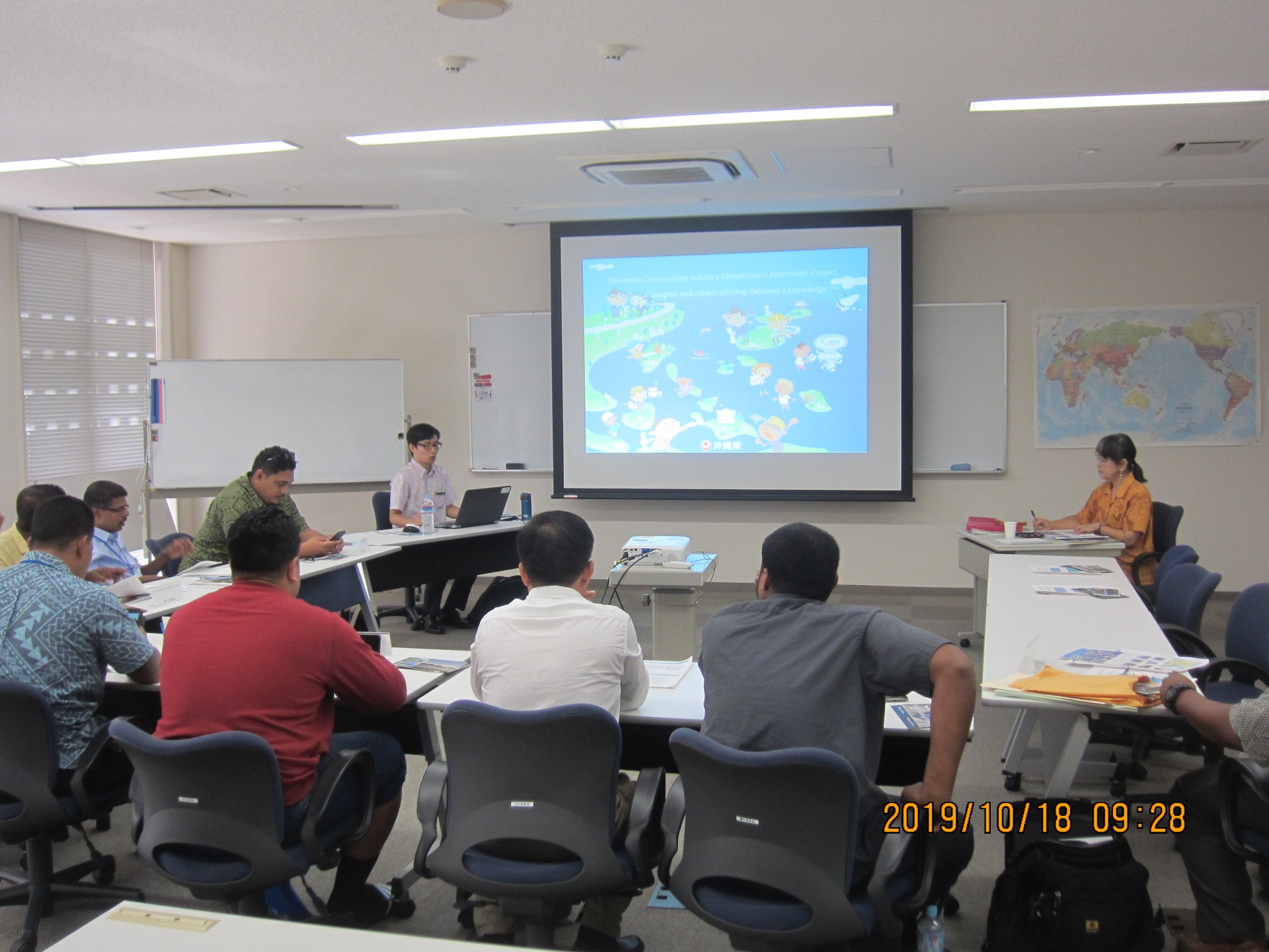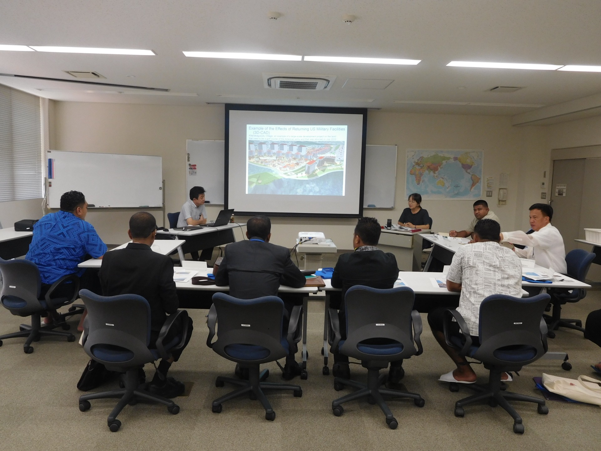 本日は研修生の「サマリーレポート発表会」でした。今回の研修で学んだことを自国の課題等にどのように役立てられるのか等をレポートに纏め、研修生一人一人が発表しました。発表時間はひとり30分(発表15分、質疑応答等15分)でした。コメンテーターとして矢吹先生(琉球大学)、下地さん(沖縄総合事務局)、前村さん(沖縄県)、及び松田さん(しまたて協会)に出席して頂きました。各コメンテーターと各研修生の質疑応答、また適切なコメンテーターからのアドバイス等を頂きました。研修生各国の課題解決に向けて、前向きな議論、アドバイス等があり、今後の取組が待たれます。