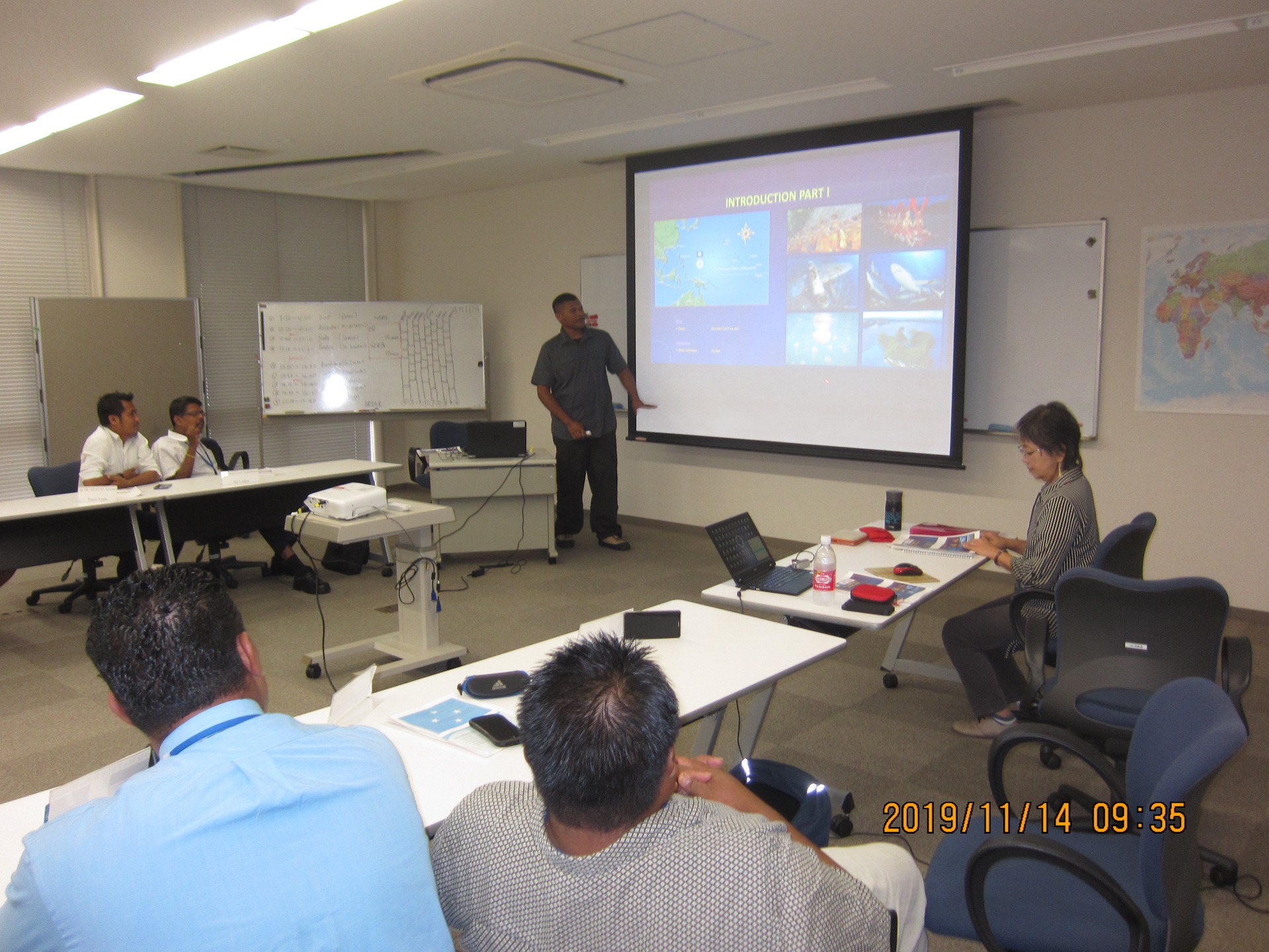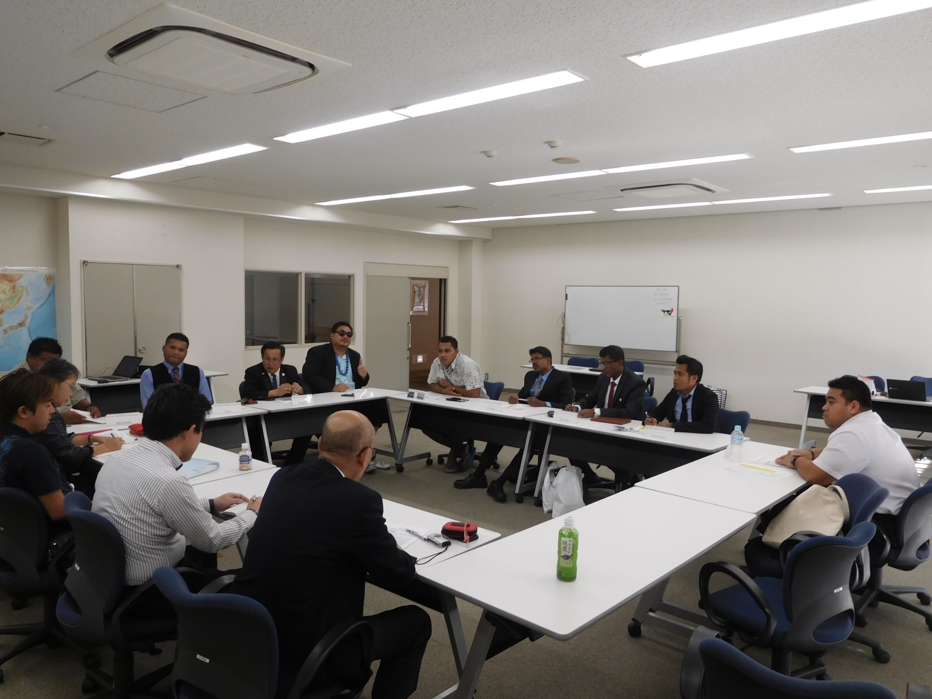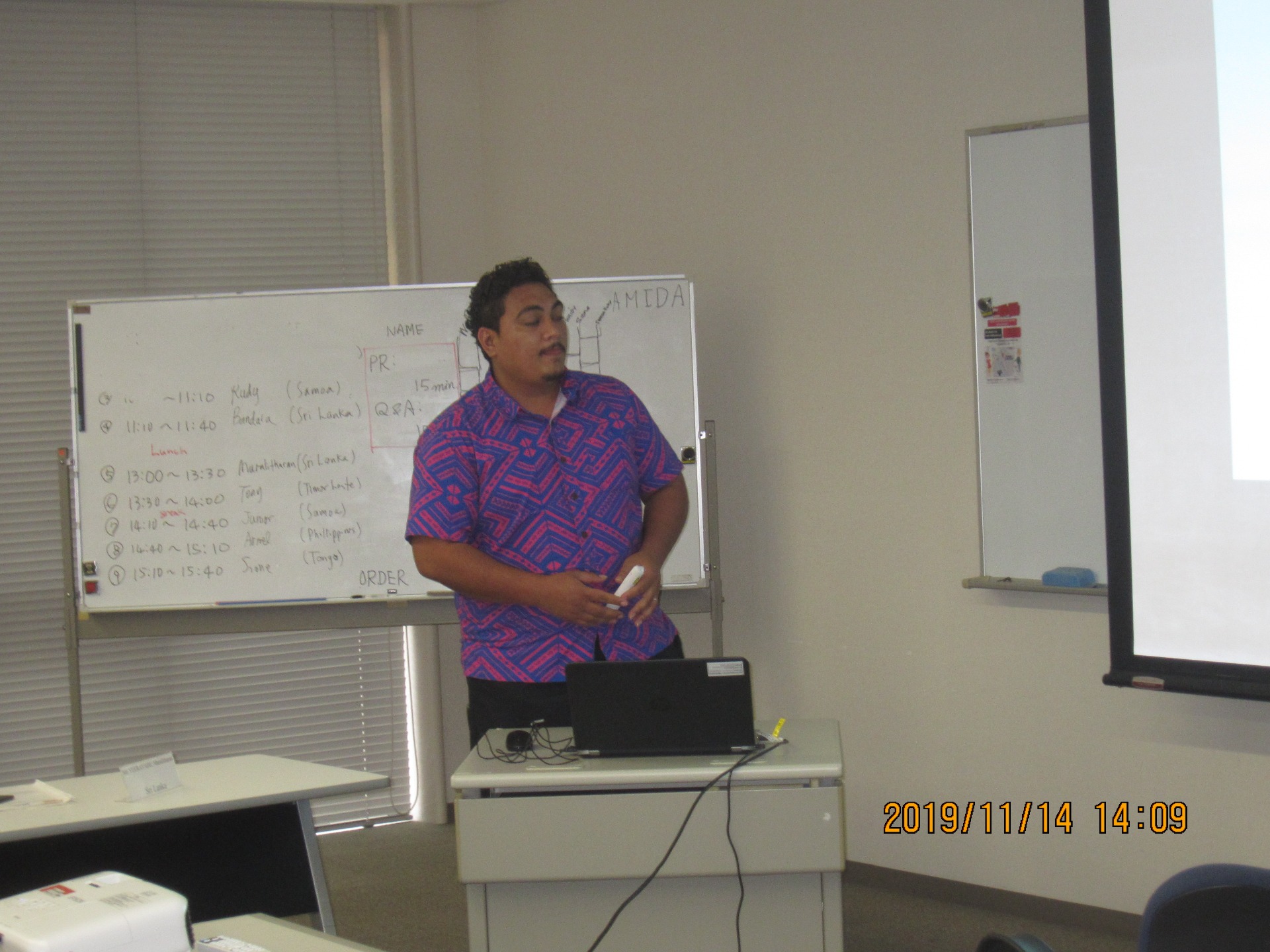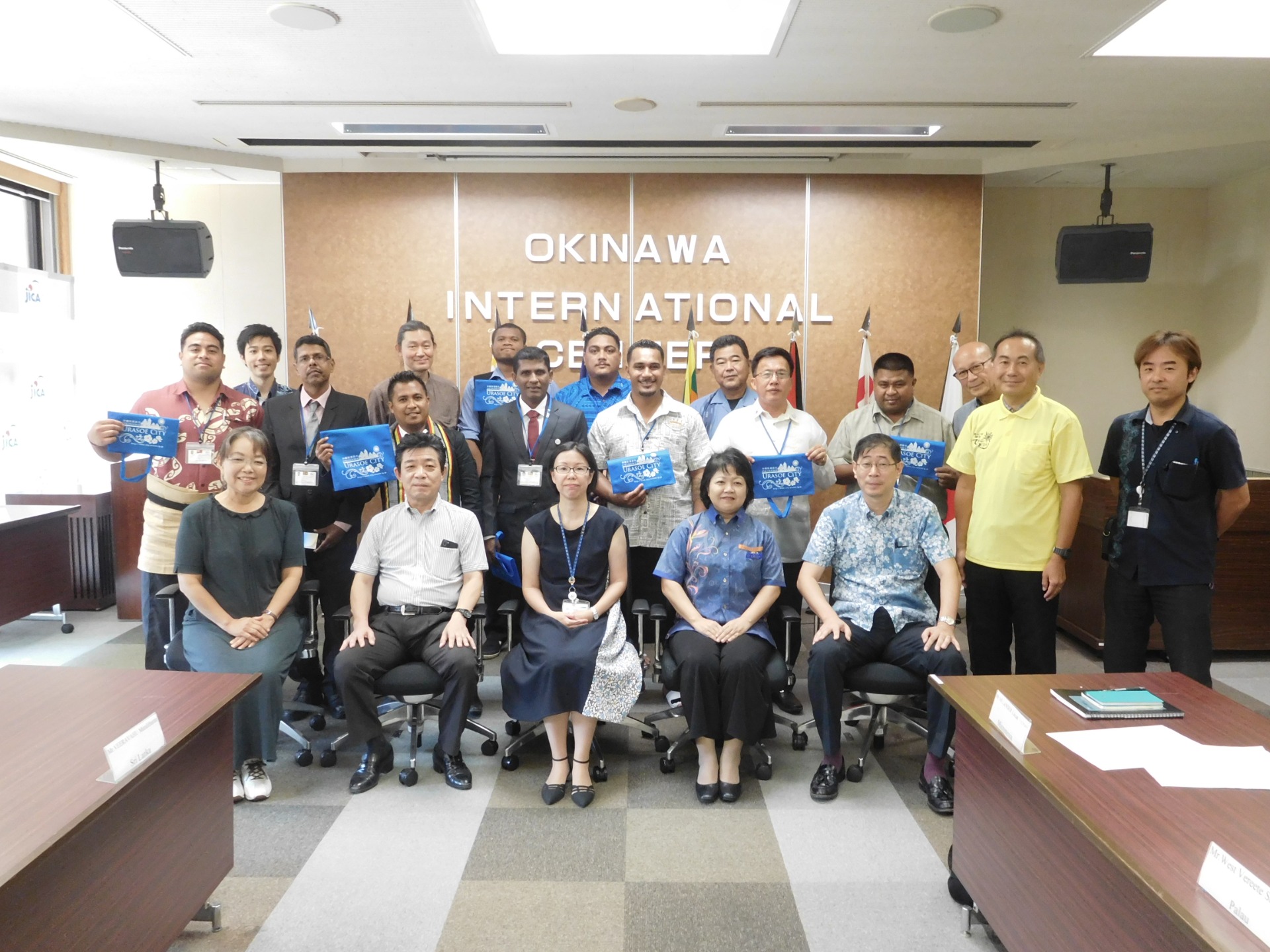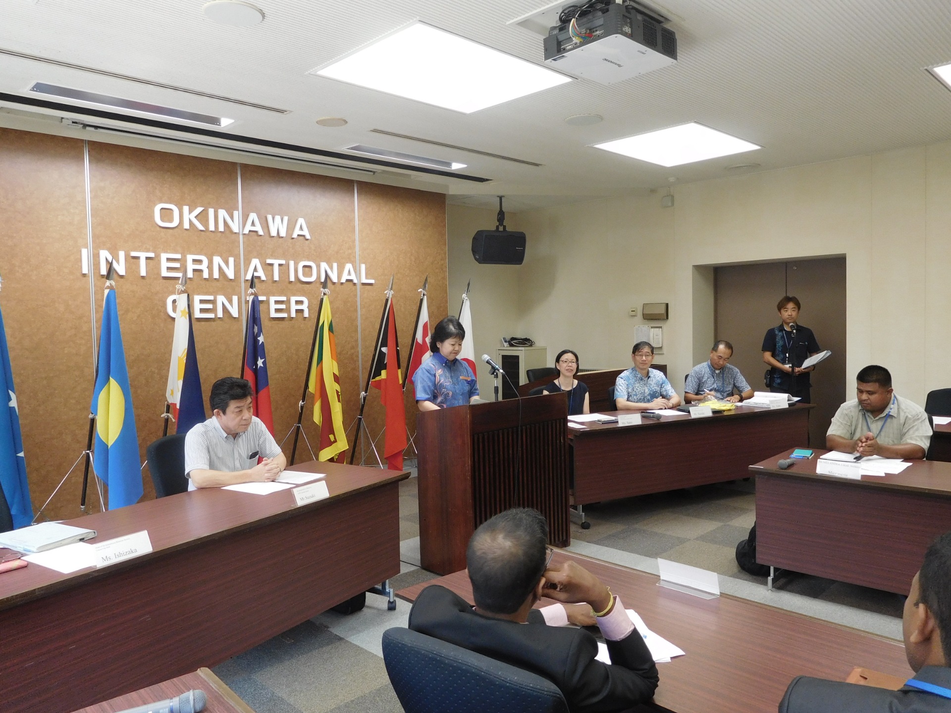 本日は研修生の「サマリーレポート発表会」でした。今回の研修で学んだことを自国の課題等にどのように役立てられるのか等をレポートに纏め、研修生一人一人が発表しました。発表時間はひとり30分(発表15分、質疑応答等15分)でした。コメンテーターとして矢吹先生(琉球大学)、下地さん(沖縄総合事務局)、前村さん(沖縄県)、及び松田さん(しまたて協会)に出席して頂きました。各コメンテーターと各研修生の質疑応答、また適切なコメンテーターからのアドバイス等を頂きました。研修生各国の課題解決に向けて、前向きな議論、アドバイス等があり、今後の取組が待たれます。