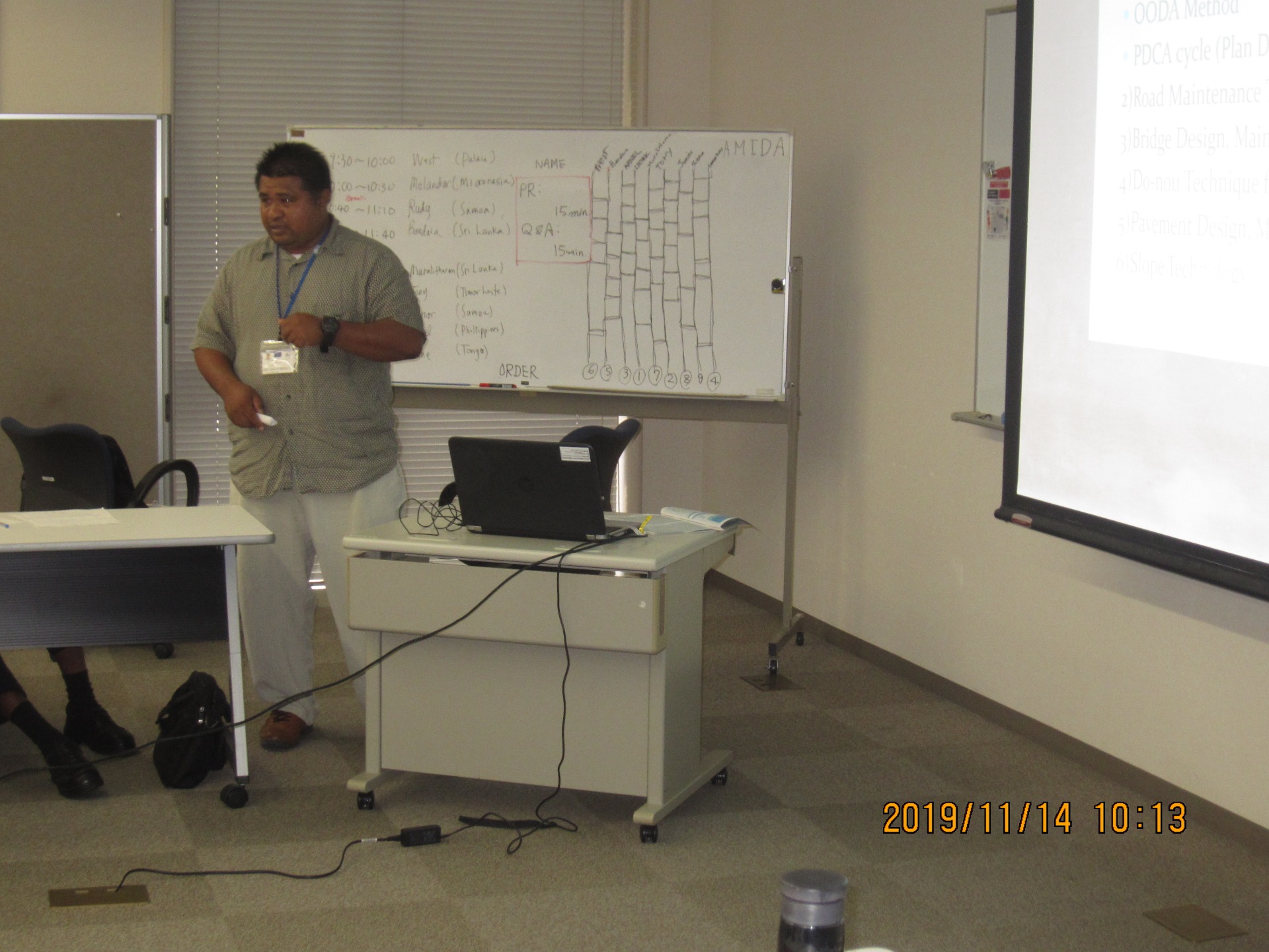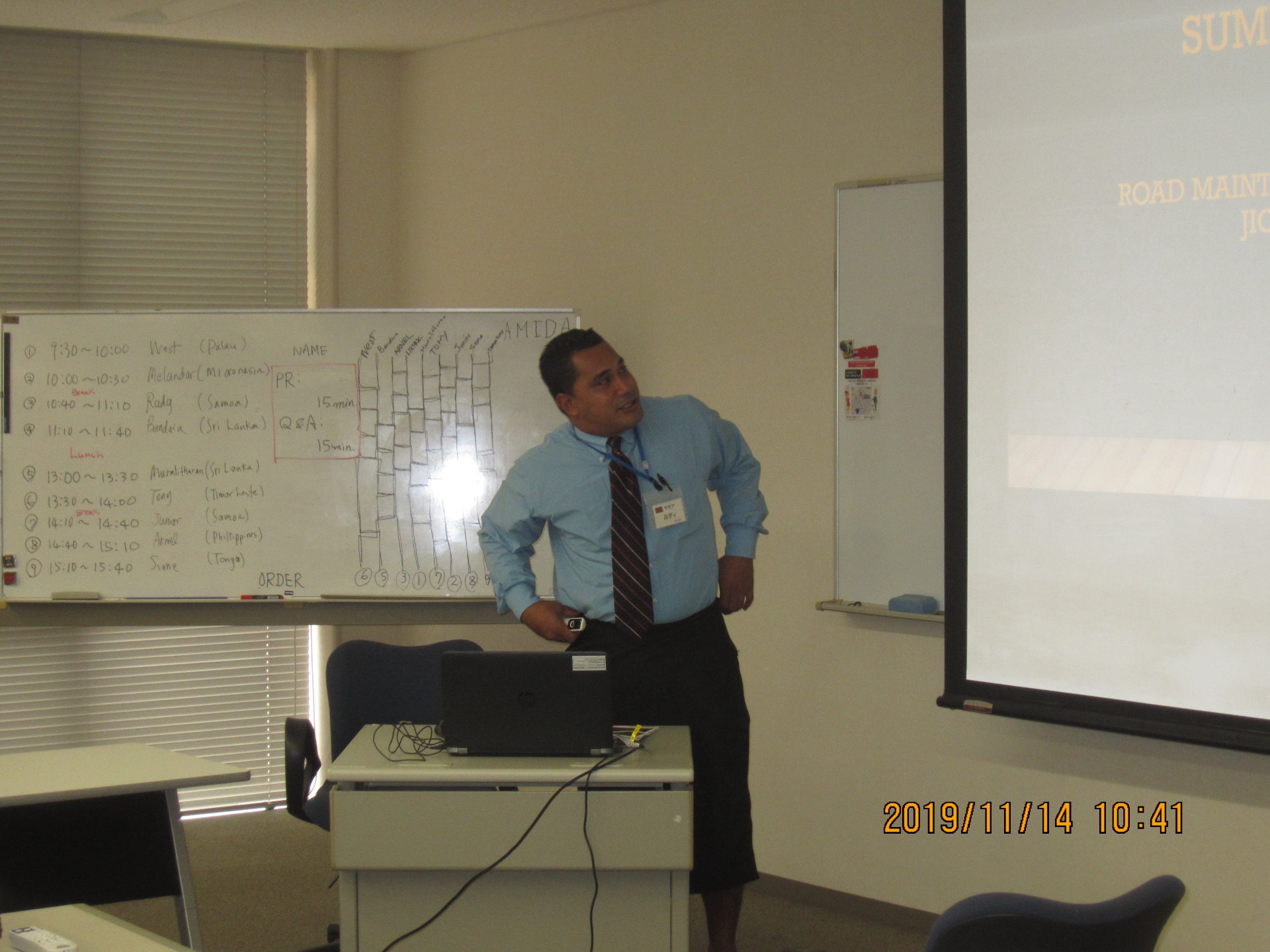 その後、研修生から自国の紹介を国別にしてもらいました。それぞれの国の概要、観光資源と道路事情をパワーポイントでの説明でした。各国独自の道路維持の問題点、対応を説明し、機械や技術者に対する問題点が多いことが分かりました。そして、「予算確保」が今後の共通の課題でした。