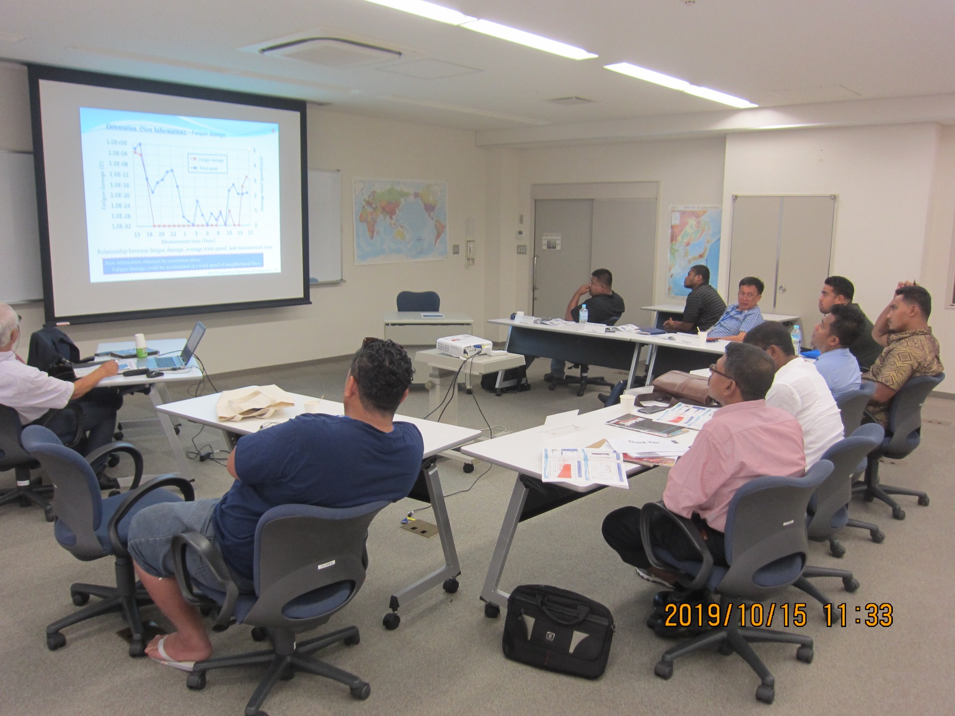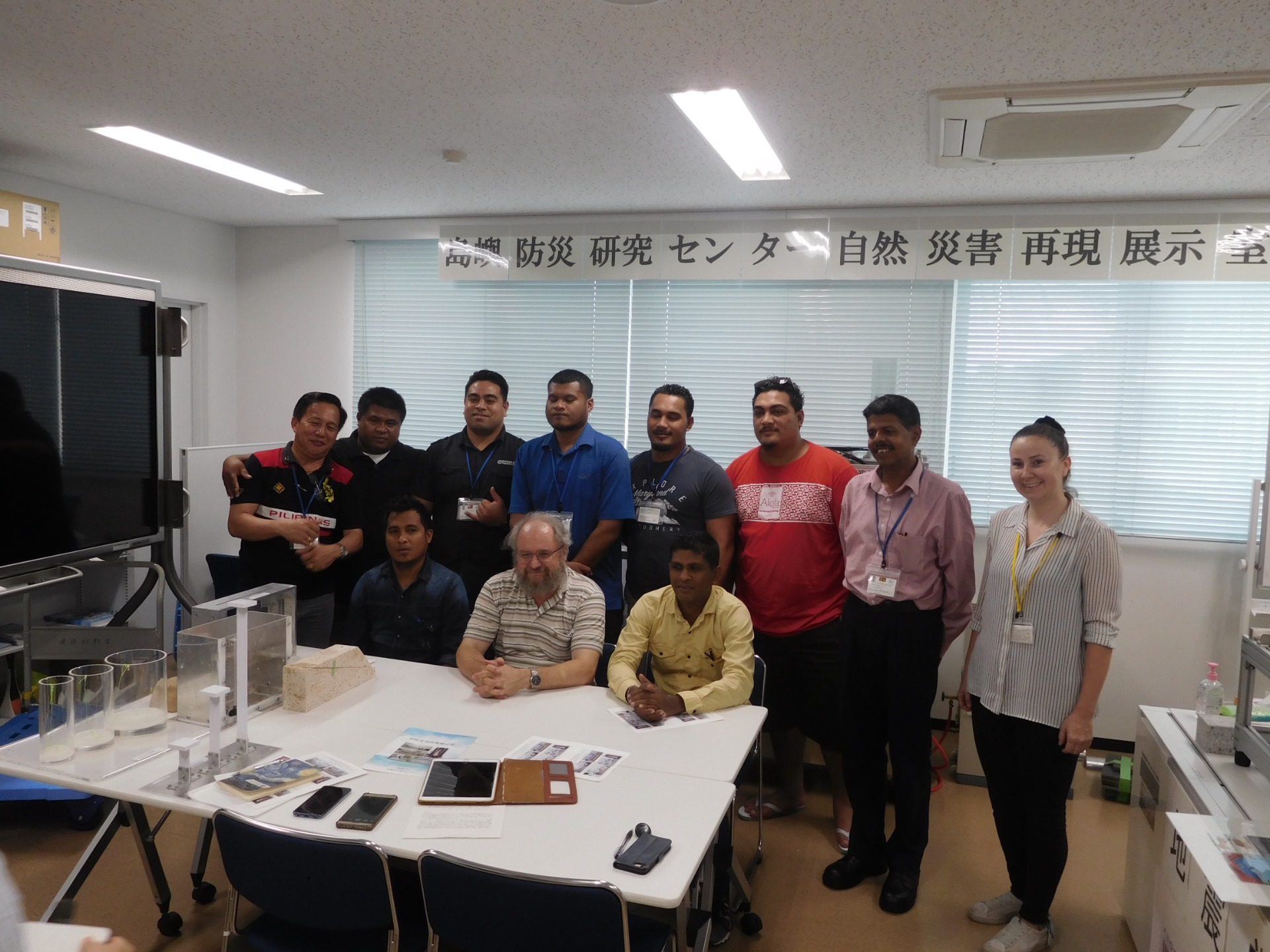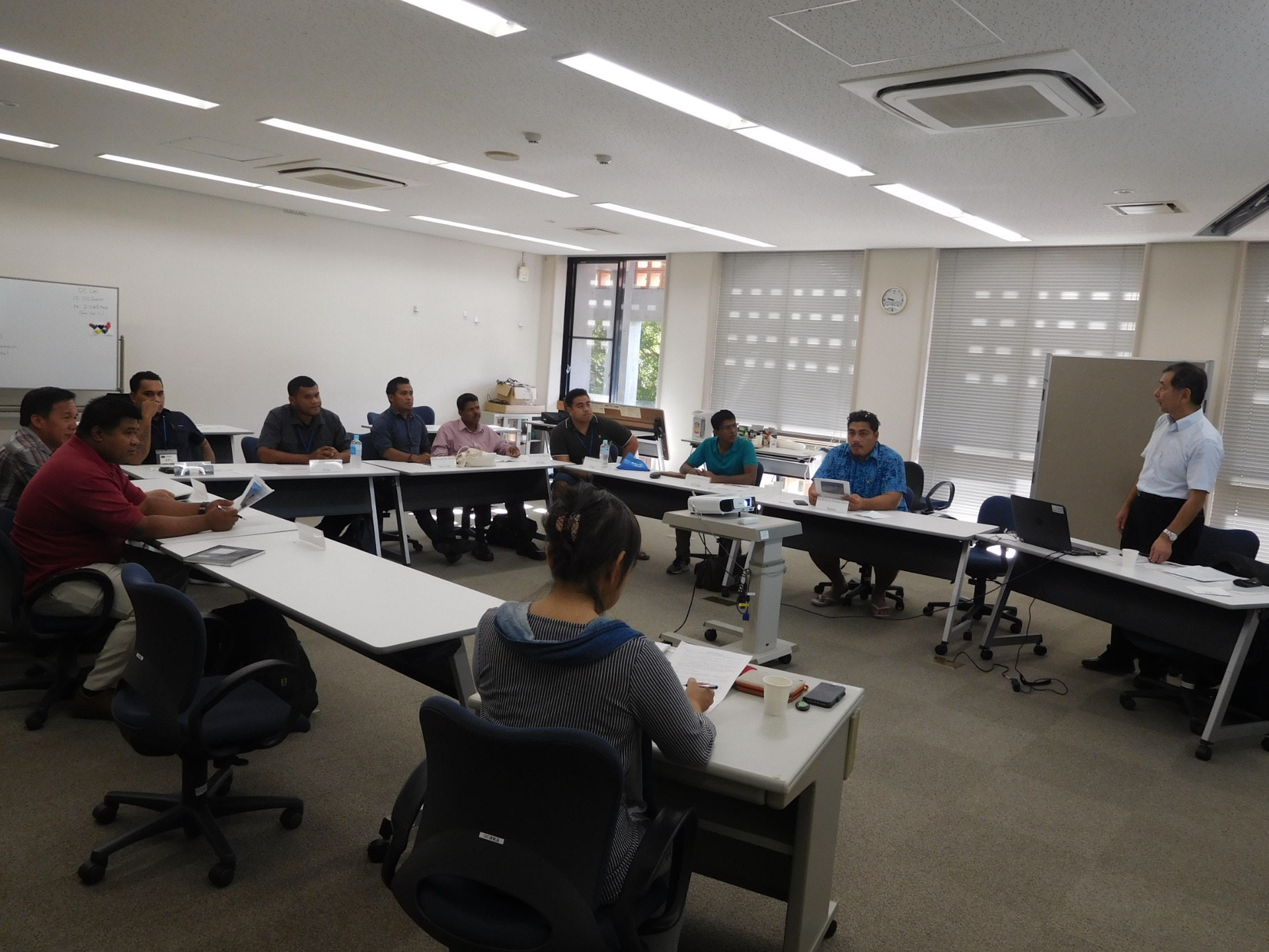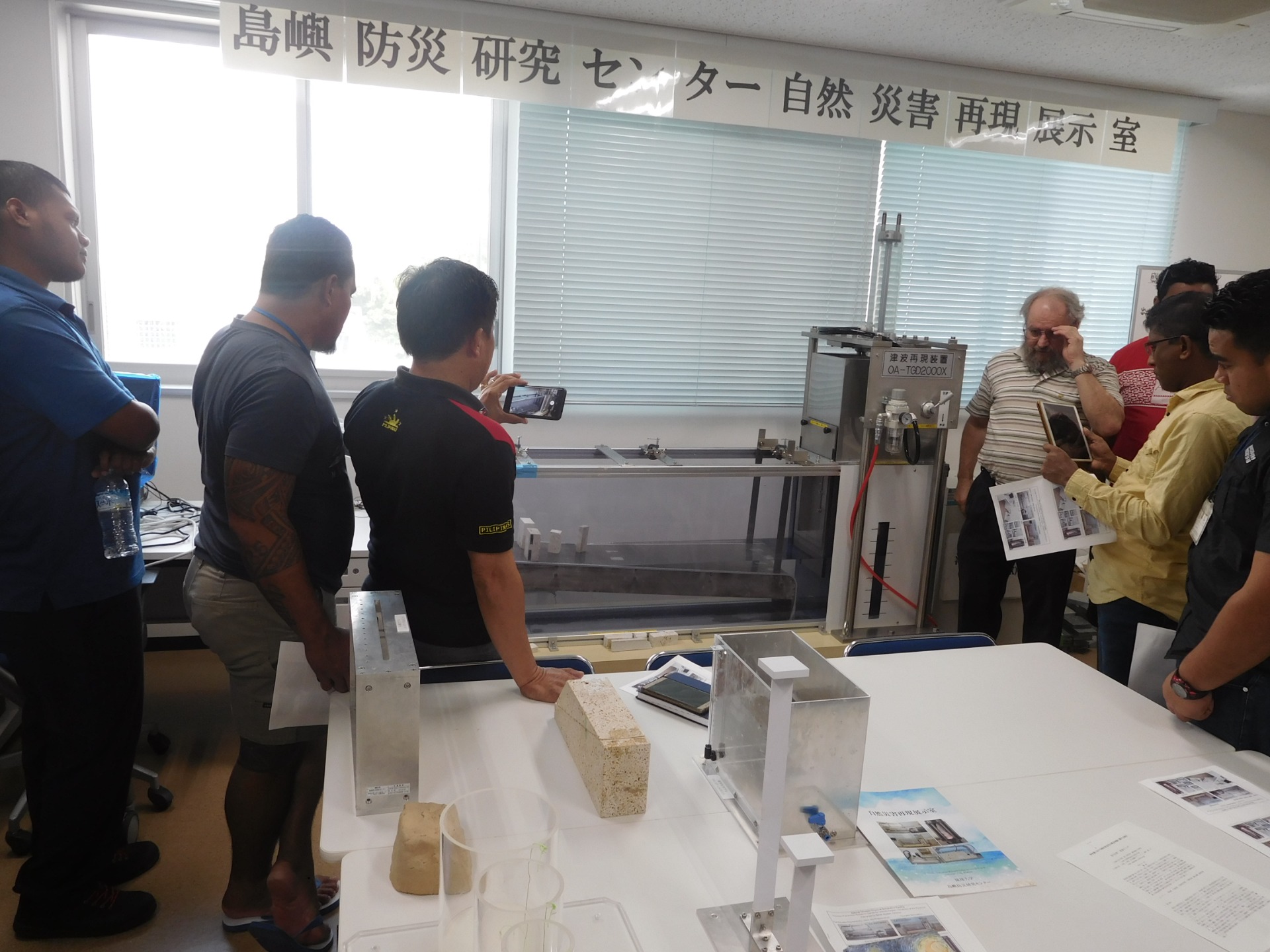 琉球大学工学部において、午前は藍檀教授による地盤工学に関する講義と、島嶼防災研究センターの自然災害再現展示室の研究装置見学でした。研修員からは最先端の津波再現装置等に興味を示していました。