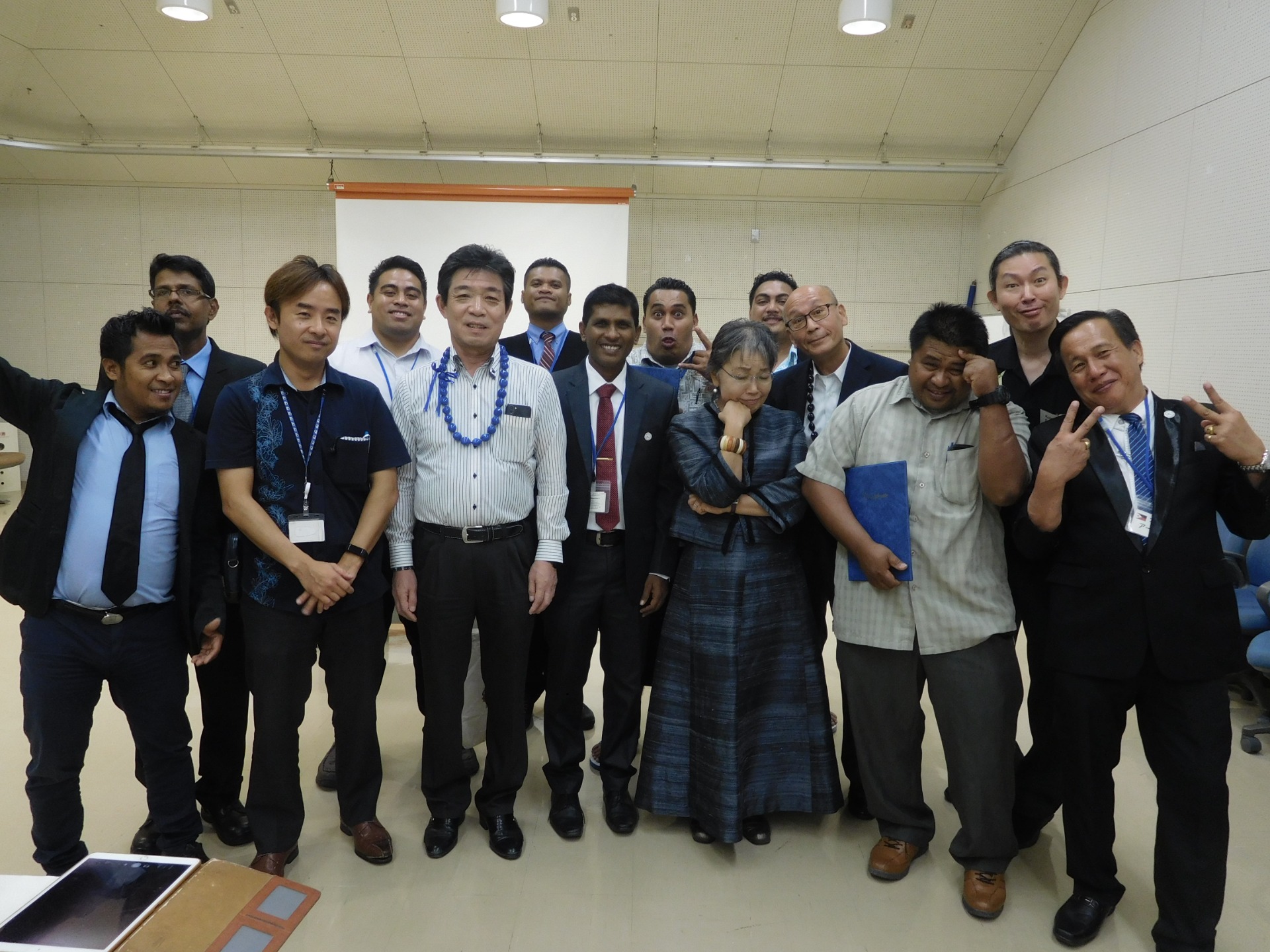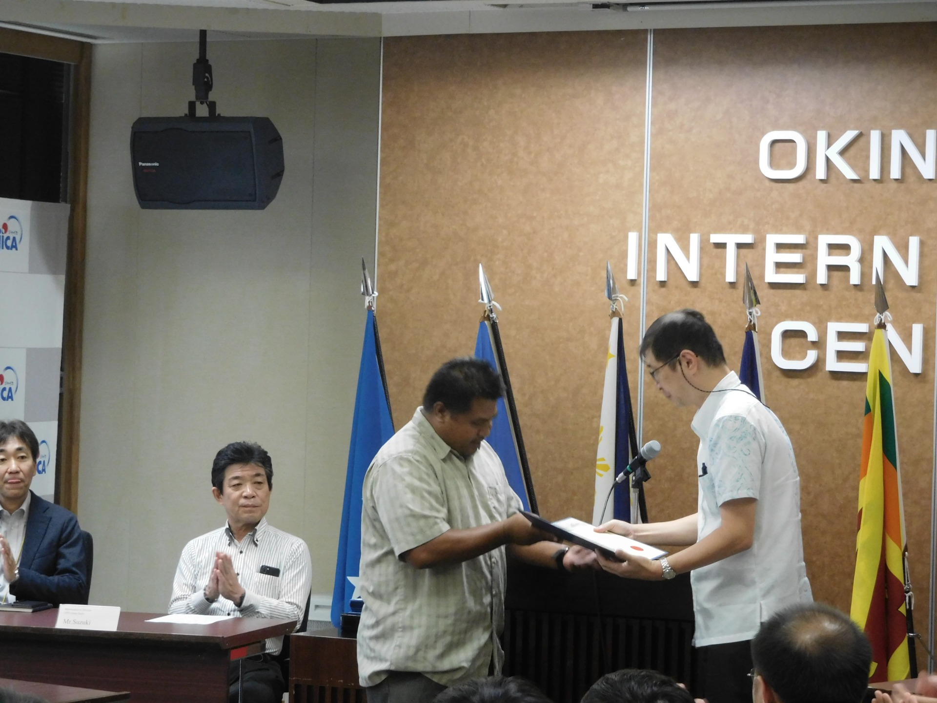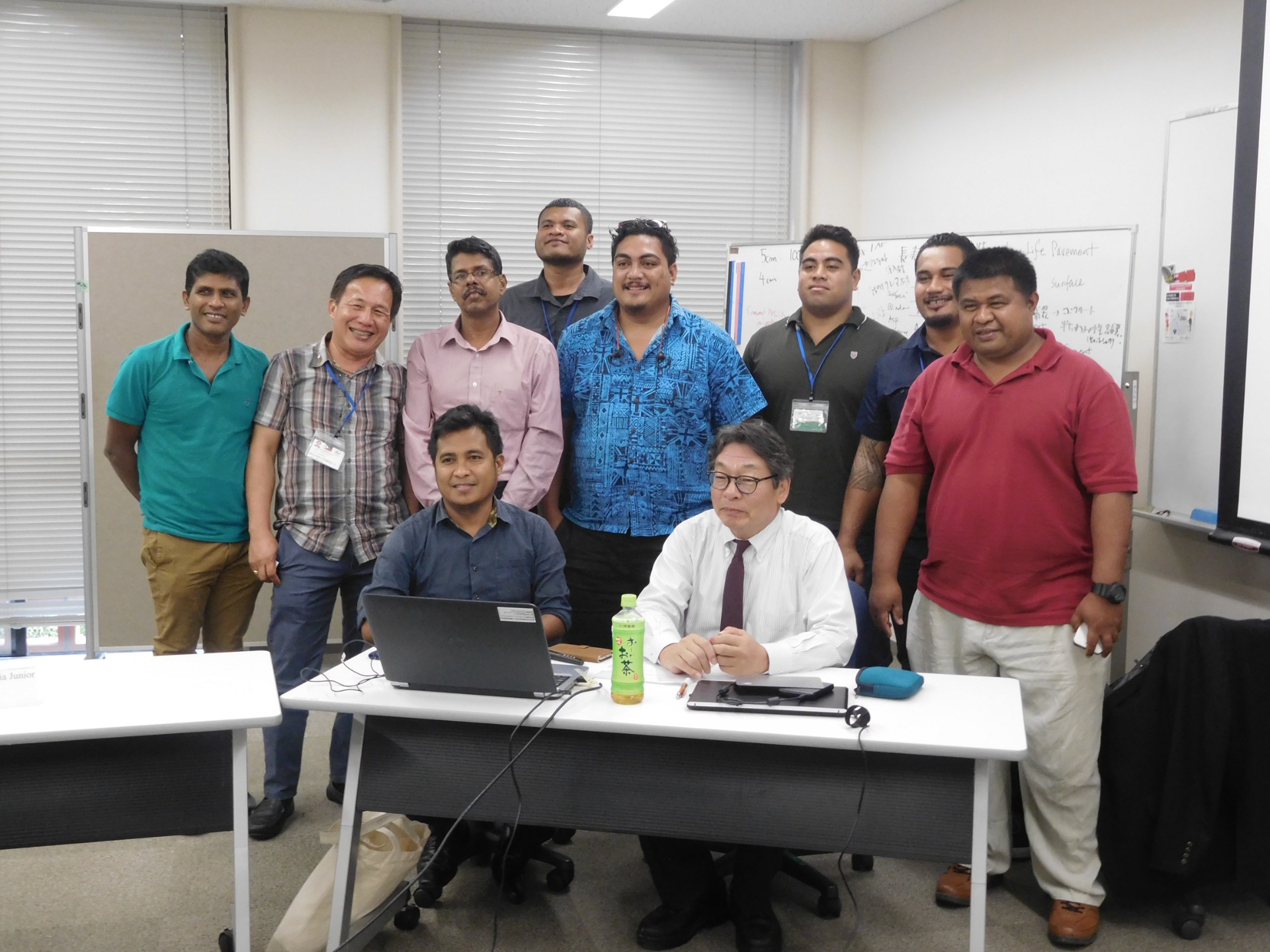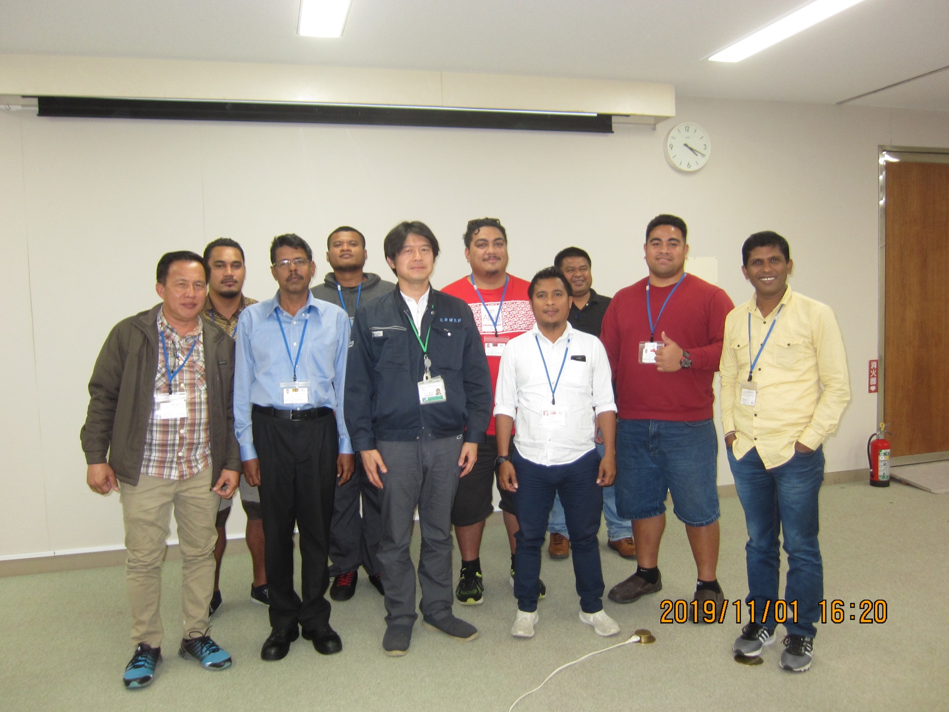 We held Final Evaluation Meeting, convened by Road Maintenance © course participants and JICA officer, starting at 10:00am. Based on the answers in JICA questionnaire submitted a week ago, each participant was asked to speak on his/her impression and thought on this program. In general, they seemed satisfied with the training (lecture, site visit, mainland program, OIC life, etc.). This event was followed by Closing Ceremony at 11:15am held in a room on 1st floor, in which all participants received a certificate. Then, all concerted staff and participants joined the Farewell Party.