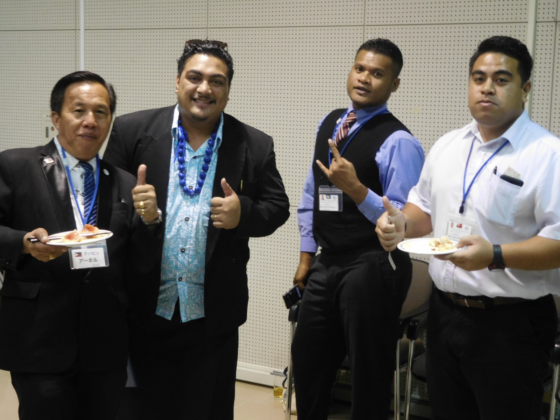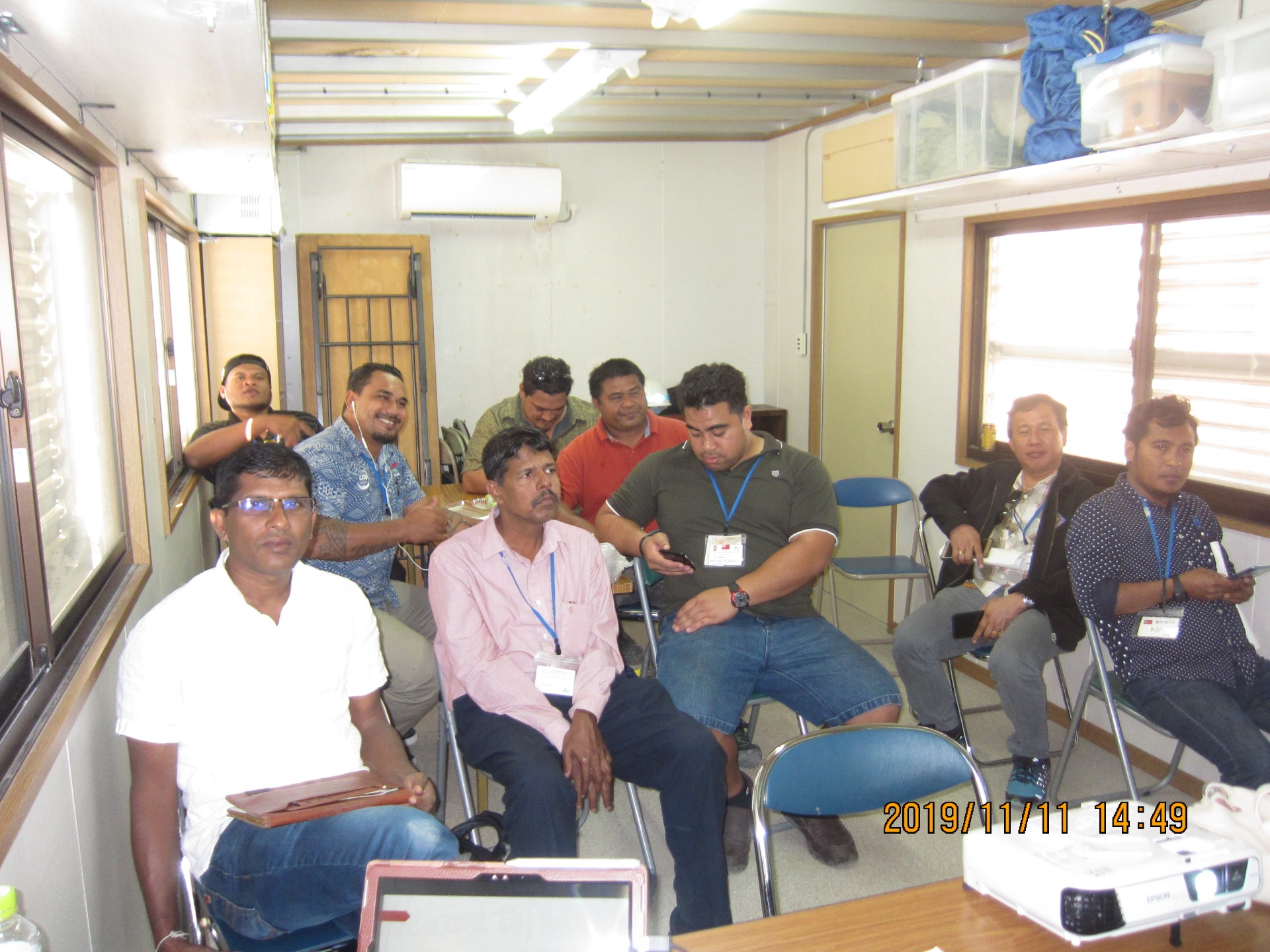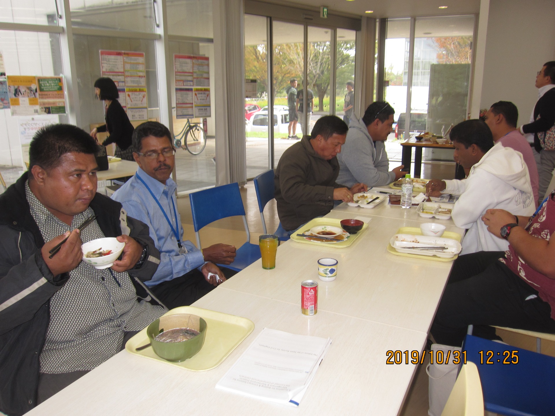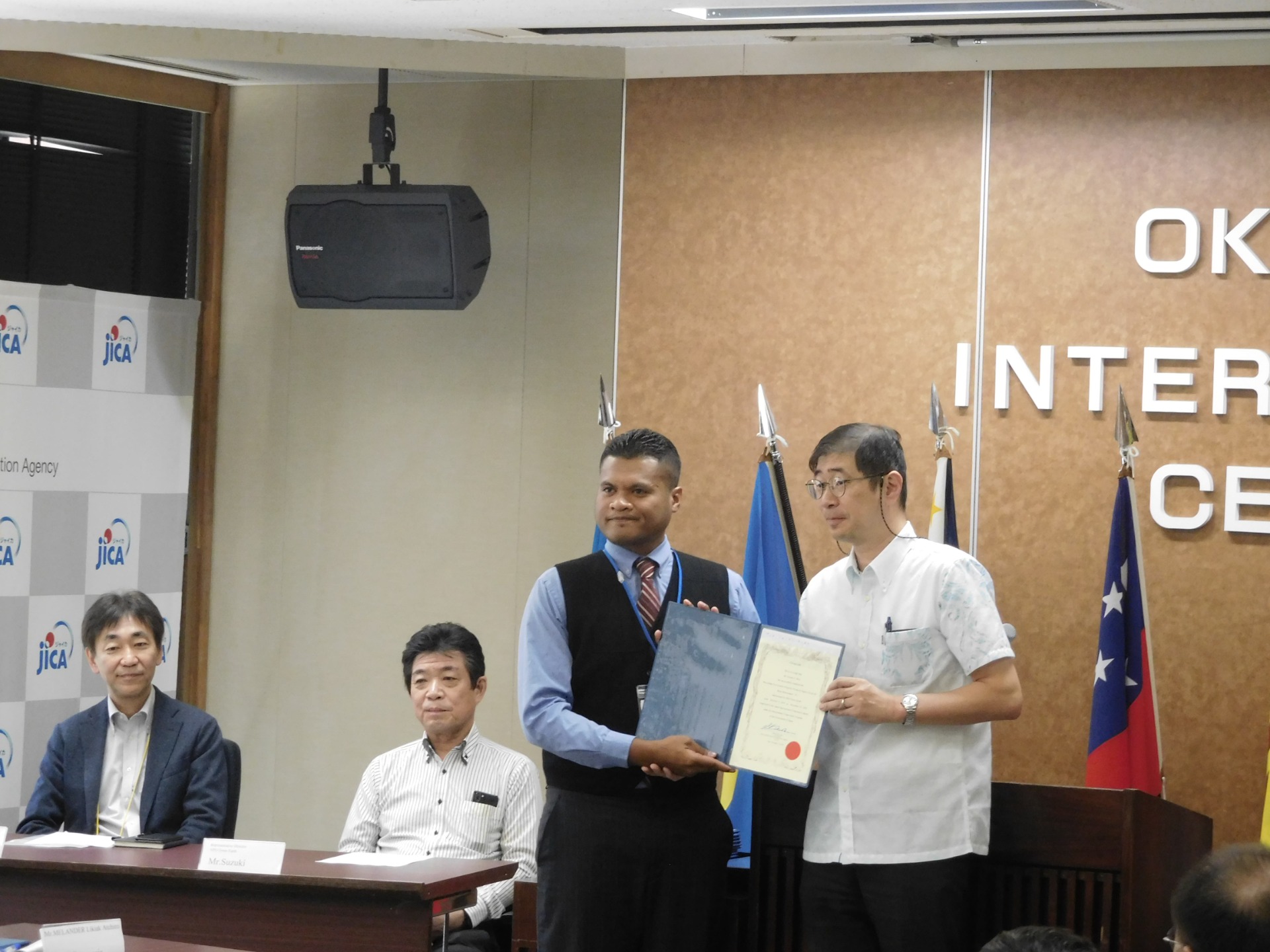 We held Final Evaluation Meeting, convened by Road Maintenance © course participants and JICA officer, starting at 10:00am. Based on the answers in JICA questionnaire submitted a week ago, each participant was asked to speak on his/her impression and thought on this program. In general, they seemed satisfied with the training (lecture, site visit, mainland program, OIC life, etc.). This event was followed by Closing Ceremony at 11:15am held in a room on 1st floor, in which all participants received a certificate. Then, all concerted staff and participants joined the Farewell Party.