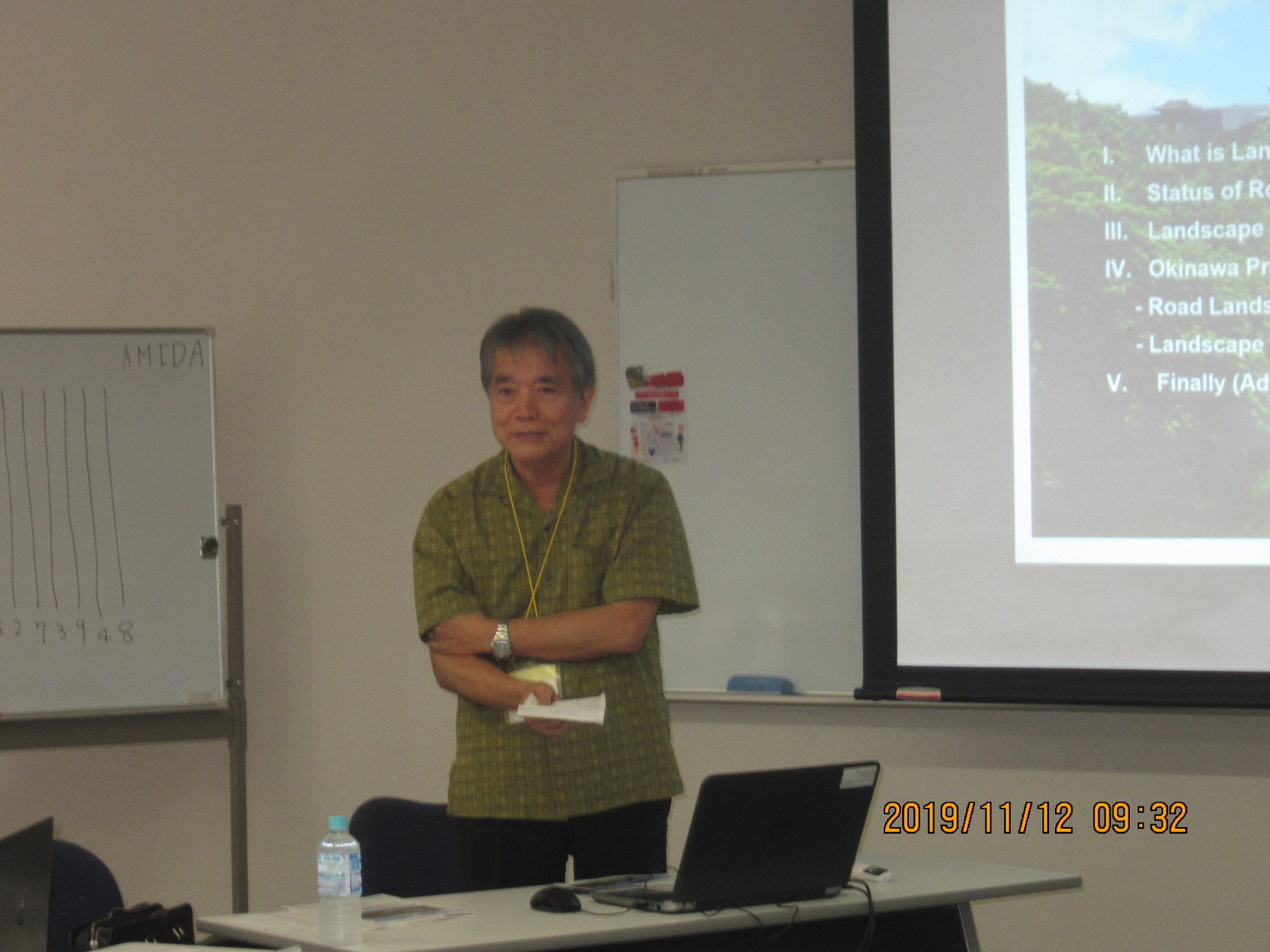 本日の午前で講義は全て終了しました。「沖縄の道路景観」をテーマに朝日建設コンサルタント古波蔵技術顧問の講義でした。前半は、研修生それぞれの国の代表的な道路状況をグーグルで見ながら、道路景観等について様々な視点から議論しました。国それぞれの違いがあっても、景観に配慮したものが多々見受けられました。後半は、「沖縄県景観形成ガイドライン」の目的や役割・使い方等、そして、視点場の種類等の景観に関する基本的な内容を説明した後、県内の具体的な道路景観事例を挙げながら、ポイントを解説して頂きました。