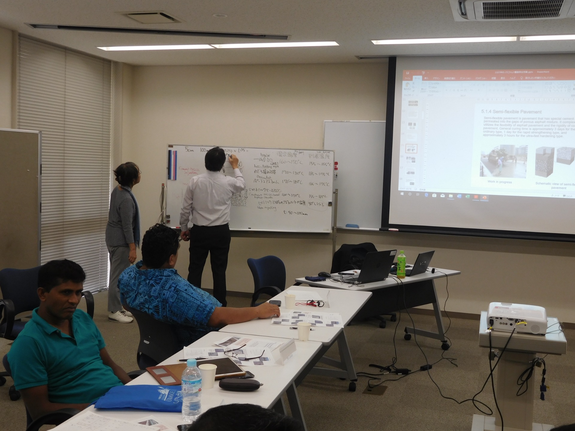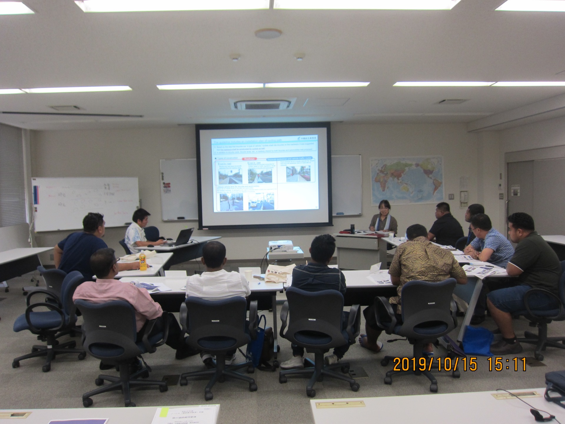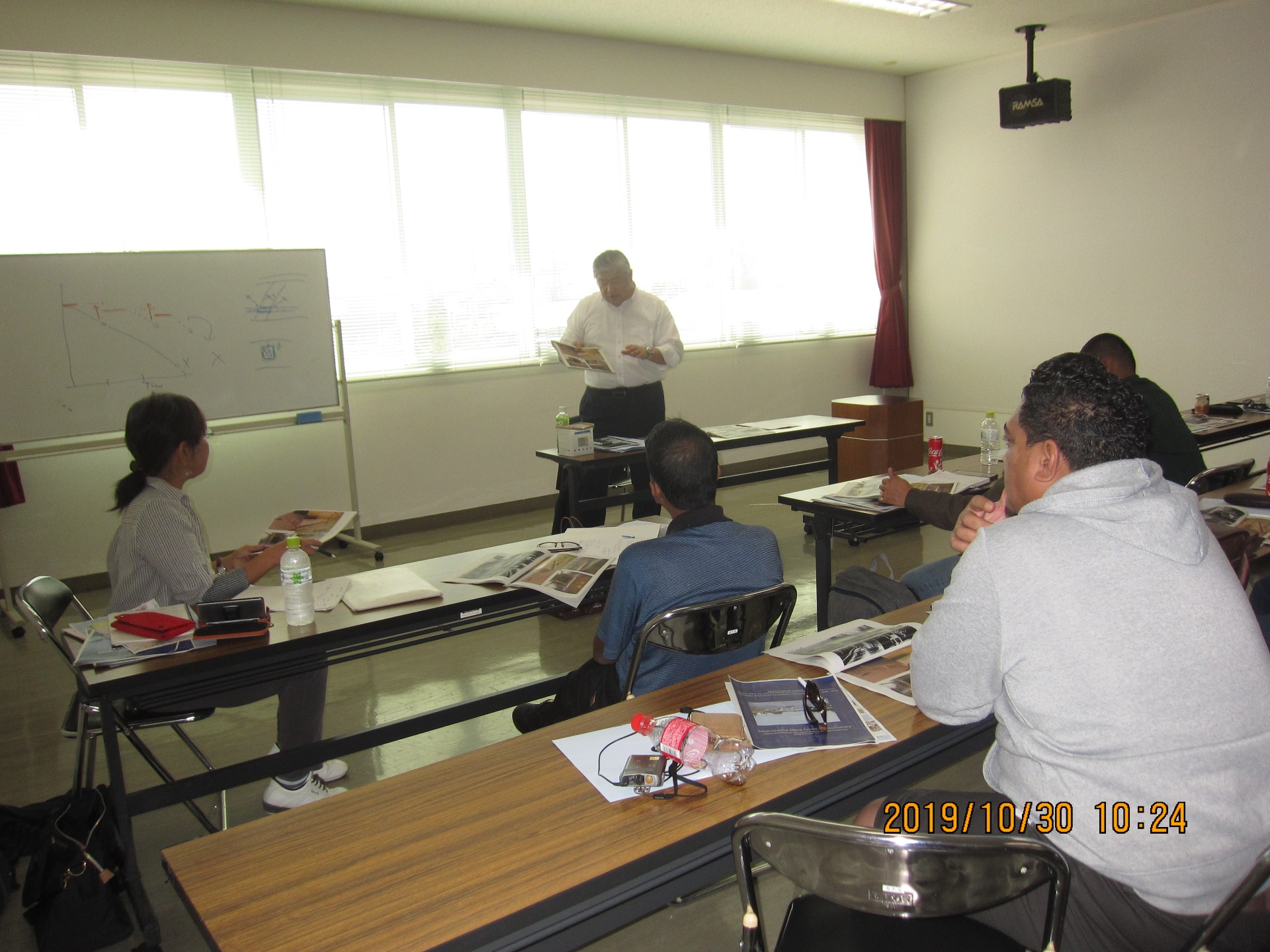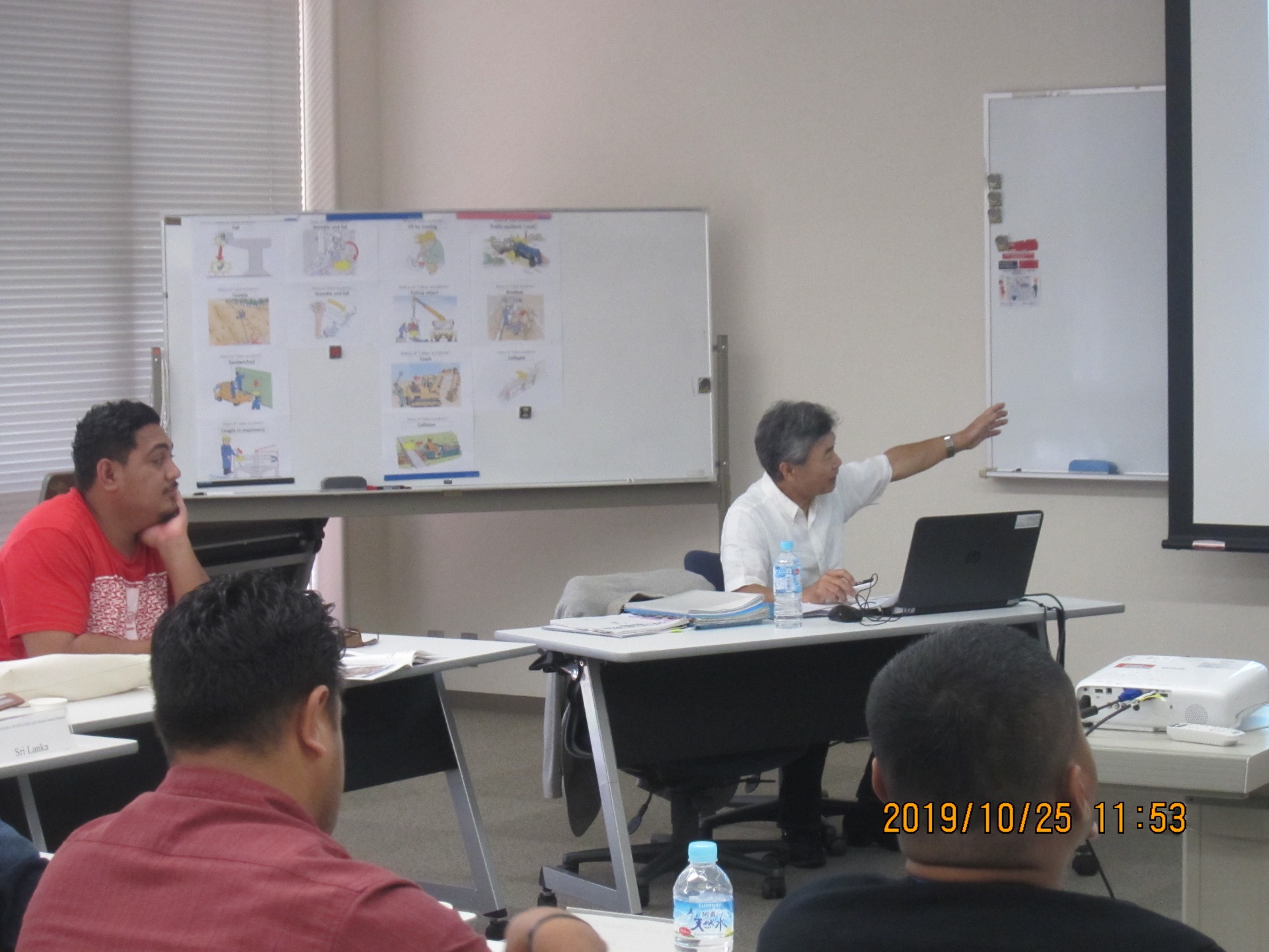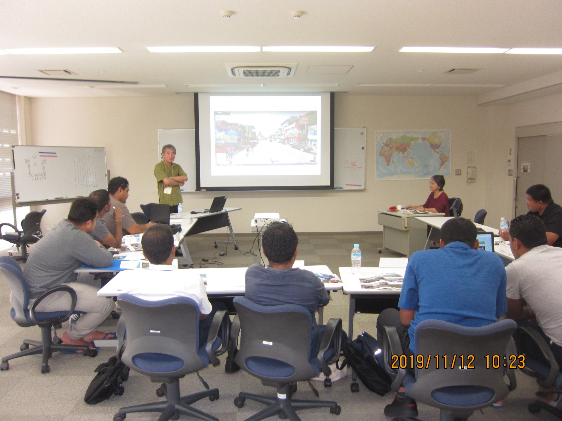 午前は「社会基盤整備概論」のテーマで琉球大学矢吹名誉教授の講義がありました。沖縄の事例(伊良部大橋)やスカイツリーの事例等を取り入れながら、インフラの意義を様々な視点から解説されました。研修生は、その都度、熱心に質問をしていました。最後に研修生らとディスカッションを行いました。