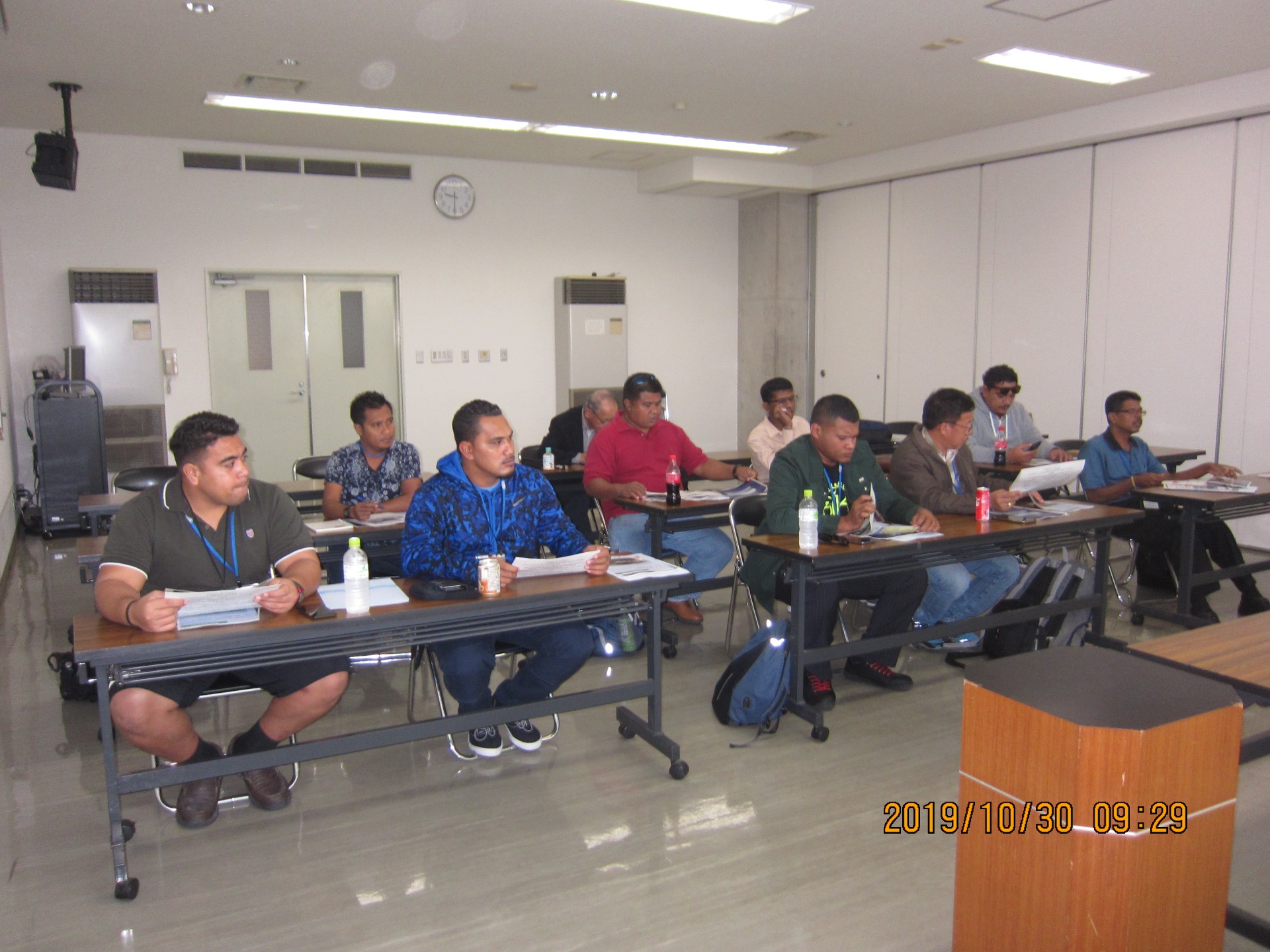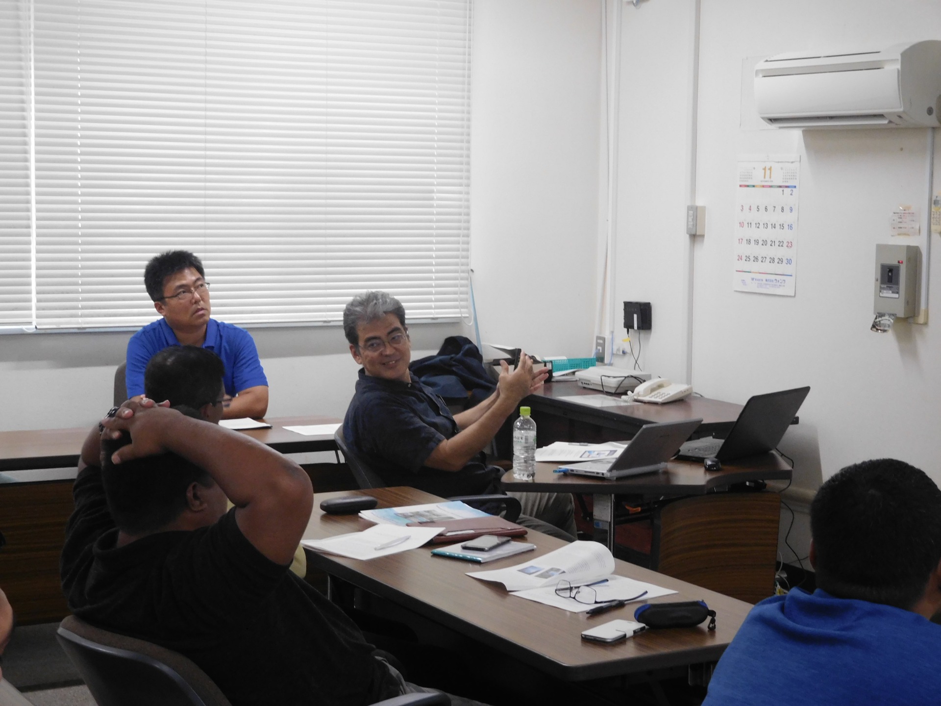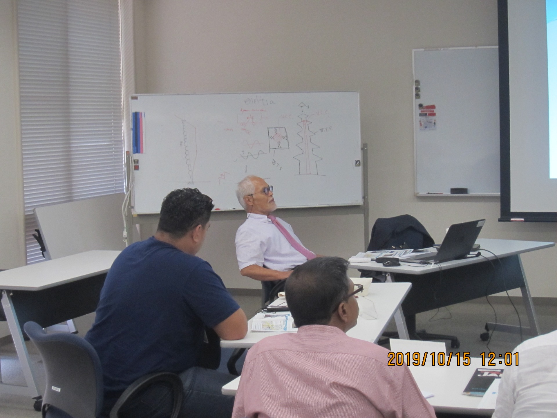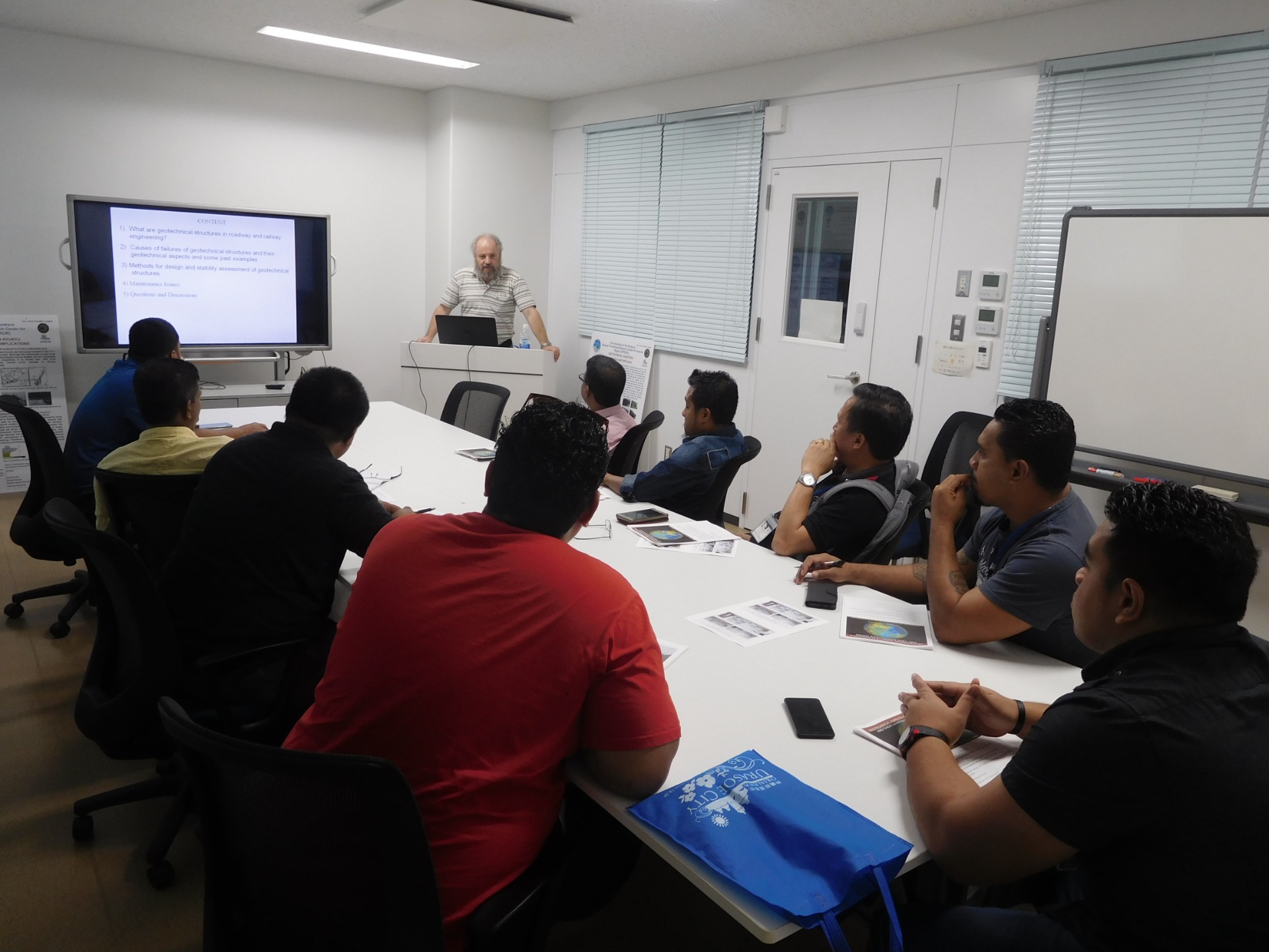 午前は「社会基盤整備概論」のテーマで琉球大学矢吹名誉教授の講義がありました。沖縄の事例(伊良部大橋)やスカイツリーの事例等を取り入れながら、インフラの意義を様々な視点から解説されました。研修生は、その都度、熱心に質問をしていました。最後に研修生らとディスカッションを行いました。