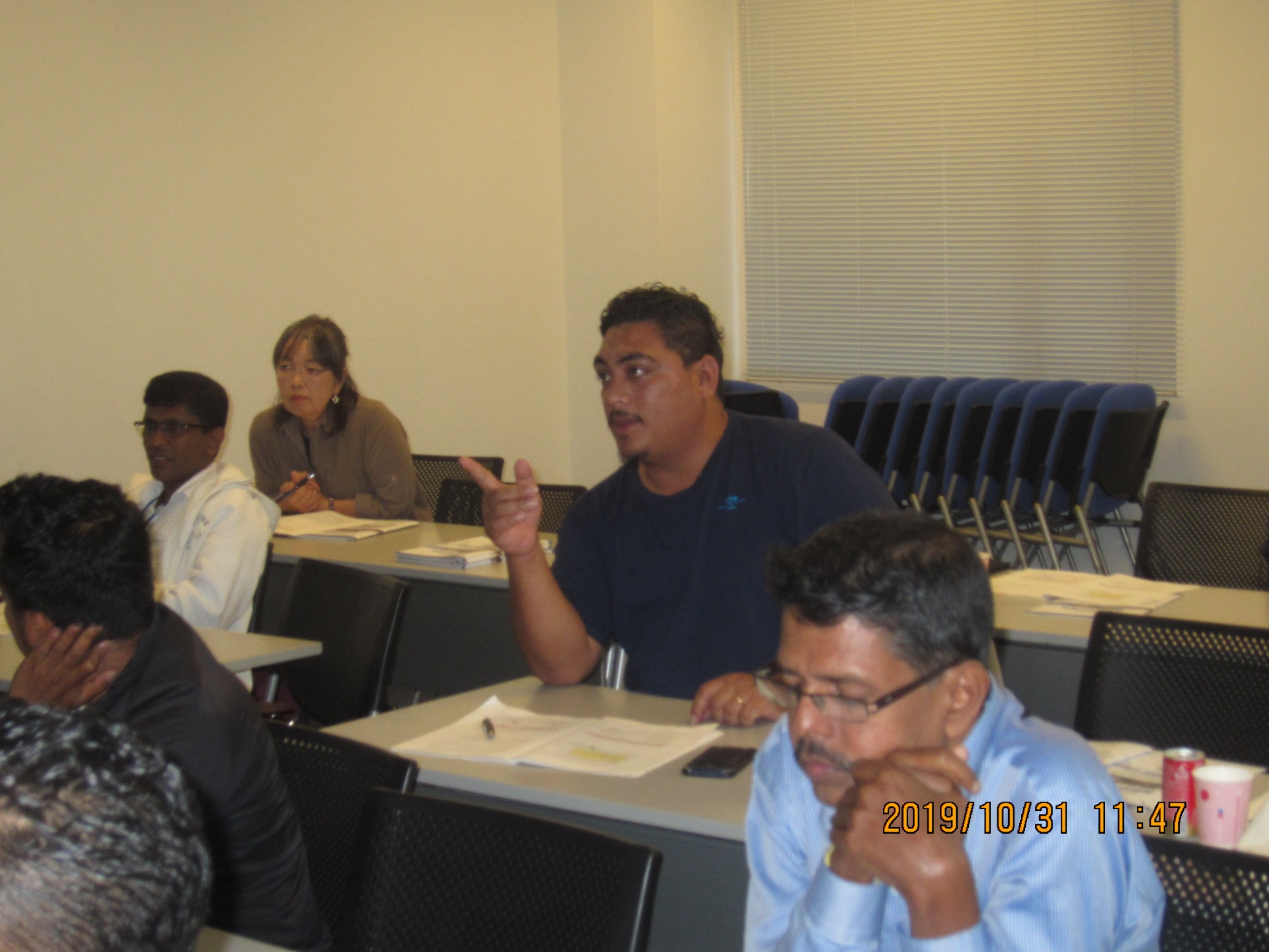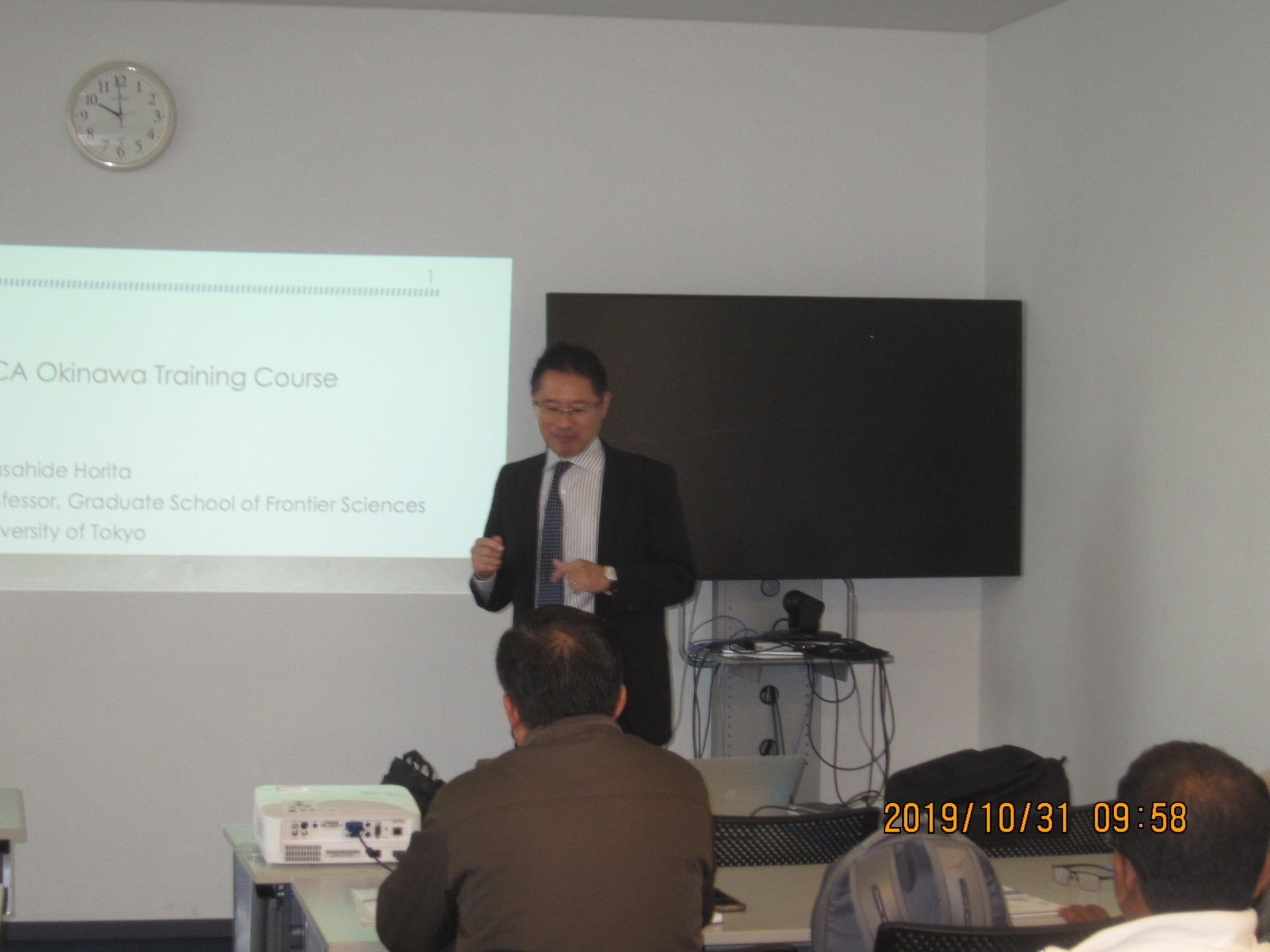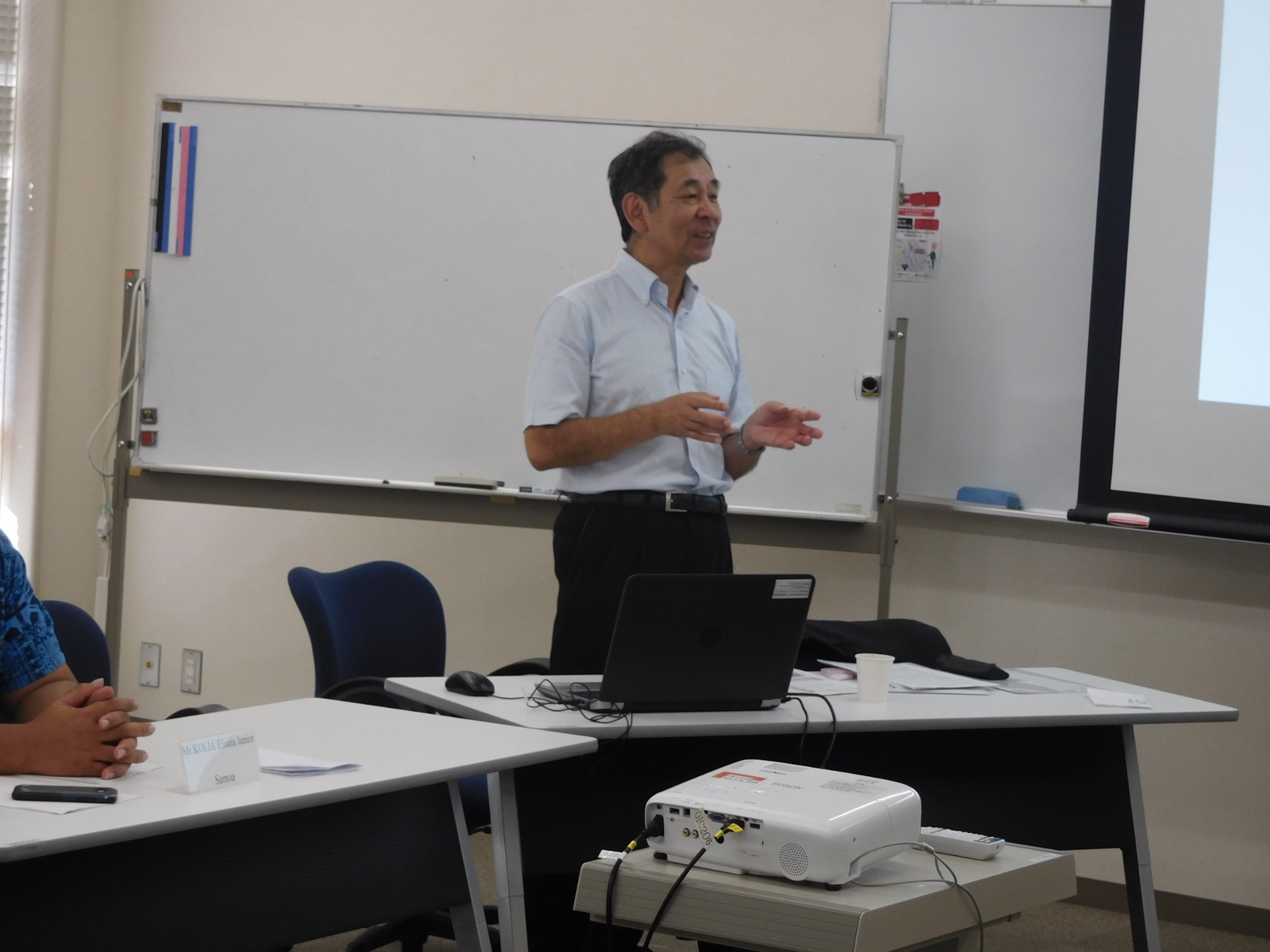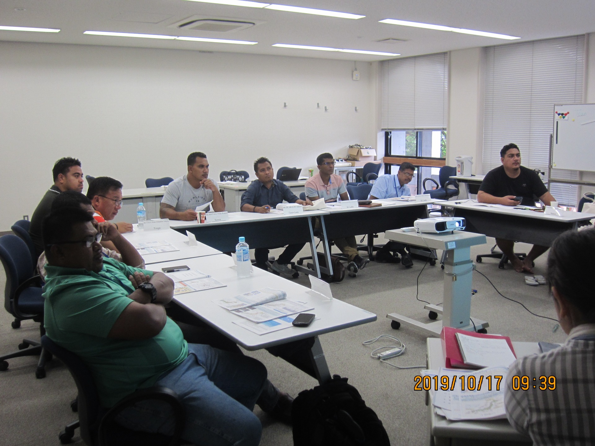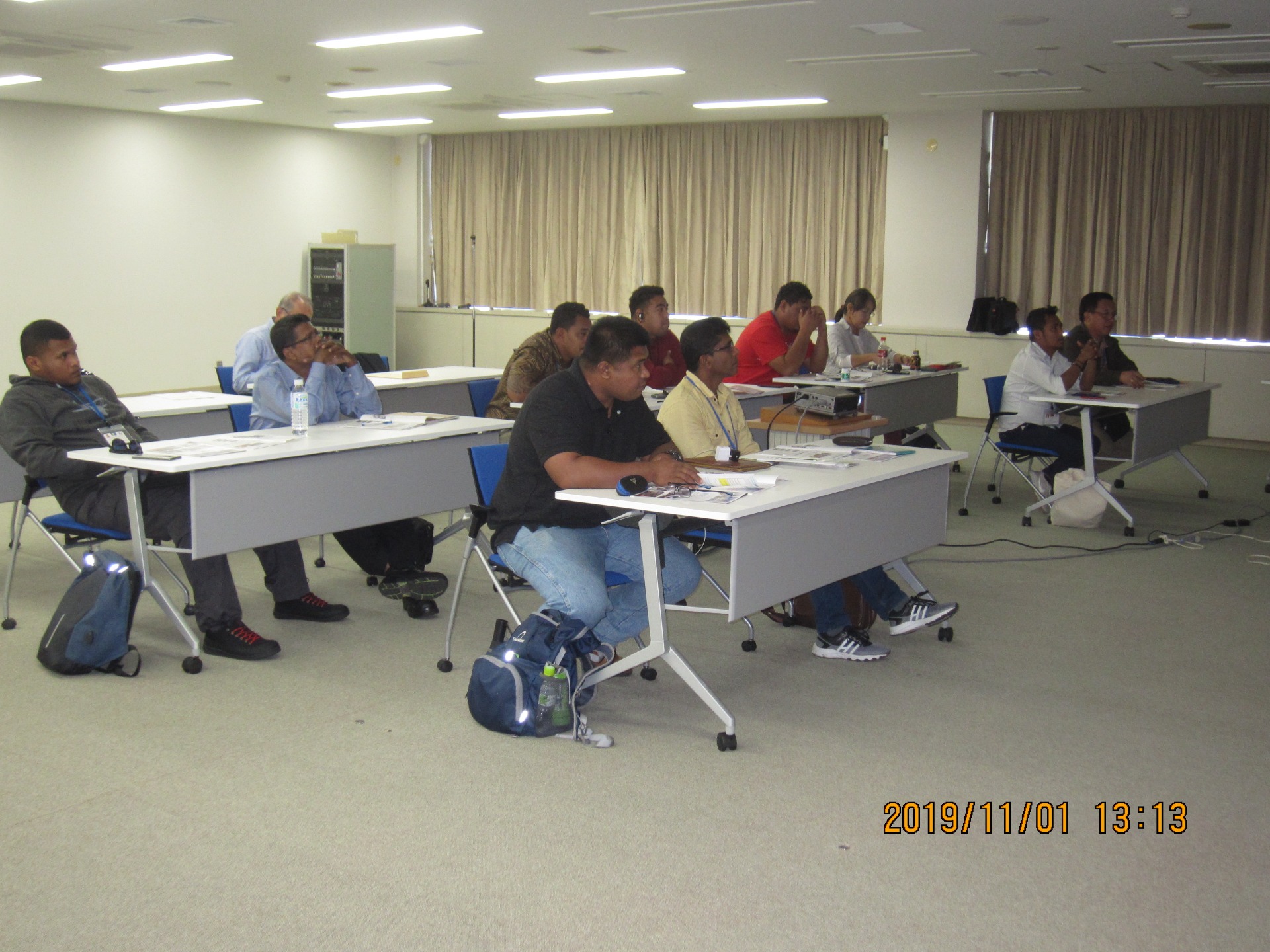 午前は「社会基盤整備概論」のテーマで琉球大学矢吹名誉教授の講義がありました。沖縄の事例(伊良部大橋)やスカイツリーの事例等を取り入れながら、インフラの意義を様々な視点から解説されました。研修生は、その都度、熱心に質問をしていました。最後に研修生らとディスカッションを行いました。