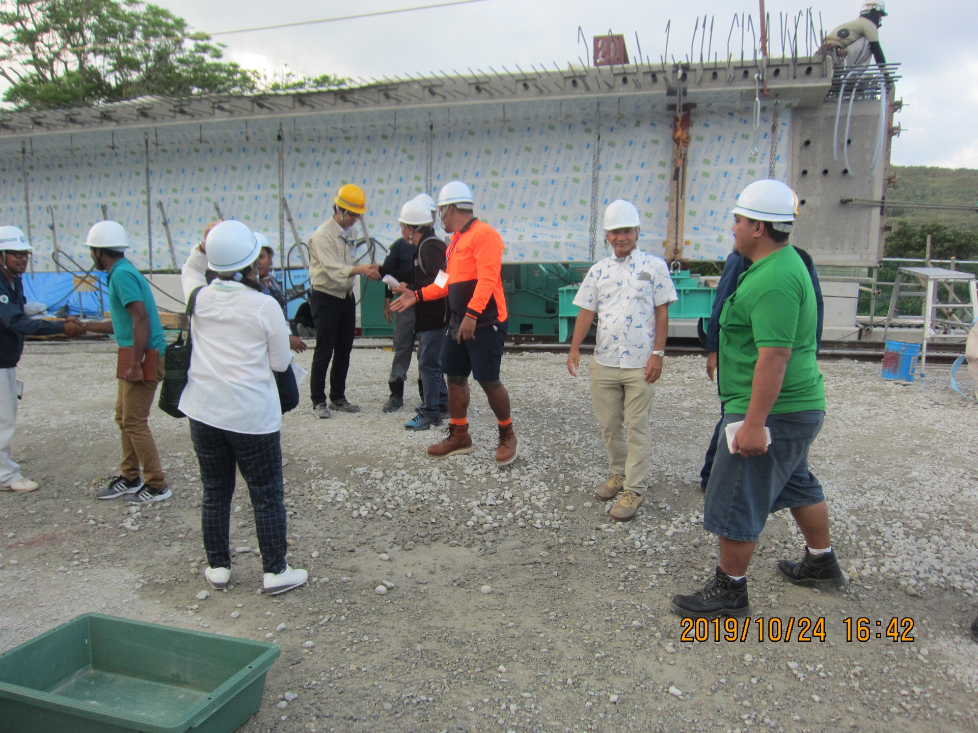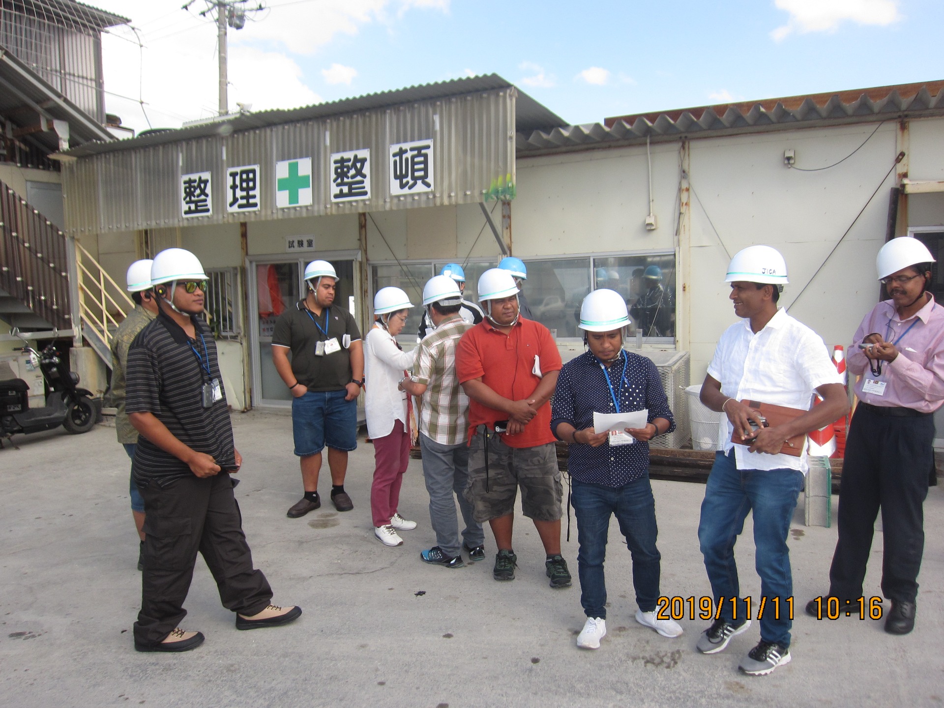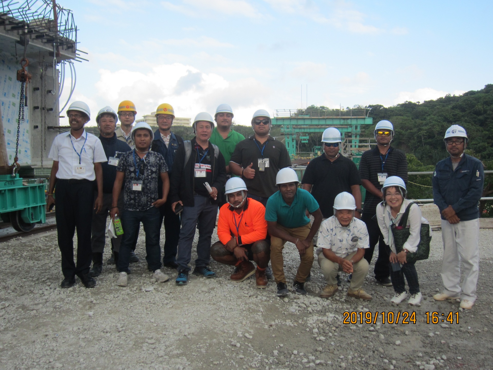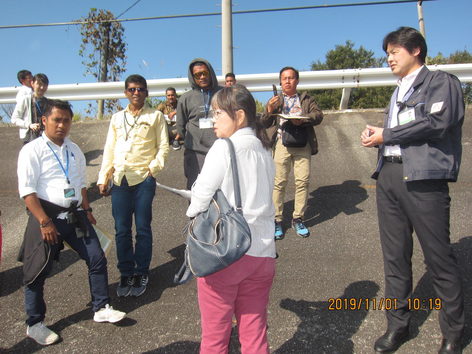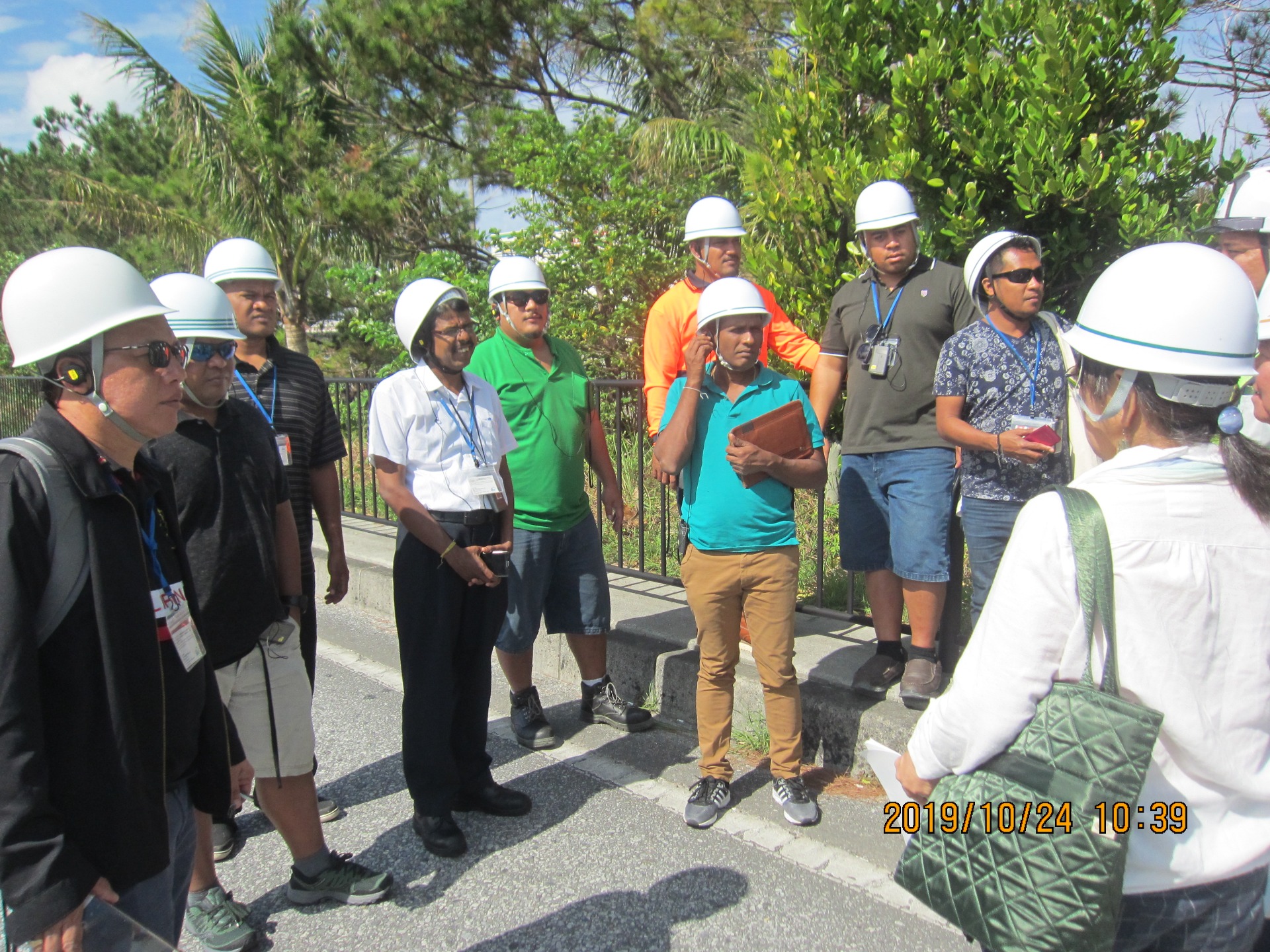In the afternoon, we visited two sites where national government has ordered maintenance and reinforcement works. First site was at Izumizaki intersection where pedestrian bridge was under repair work. Participants asked questions about how actually the repair being done. The second site was at Haebaru elevated bridge where bridge pier was under anti-seismic reinforcement work. Participants were keenly observed the work process.
