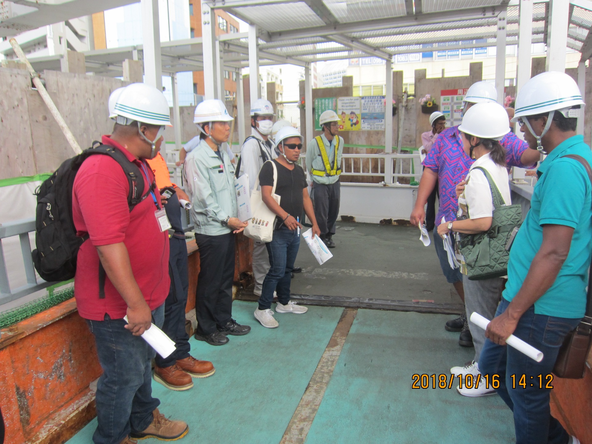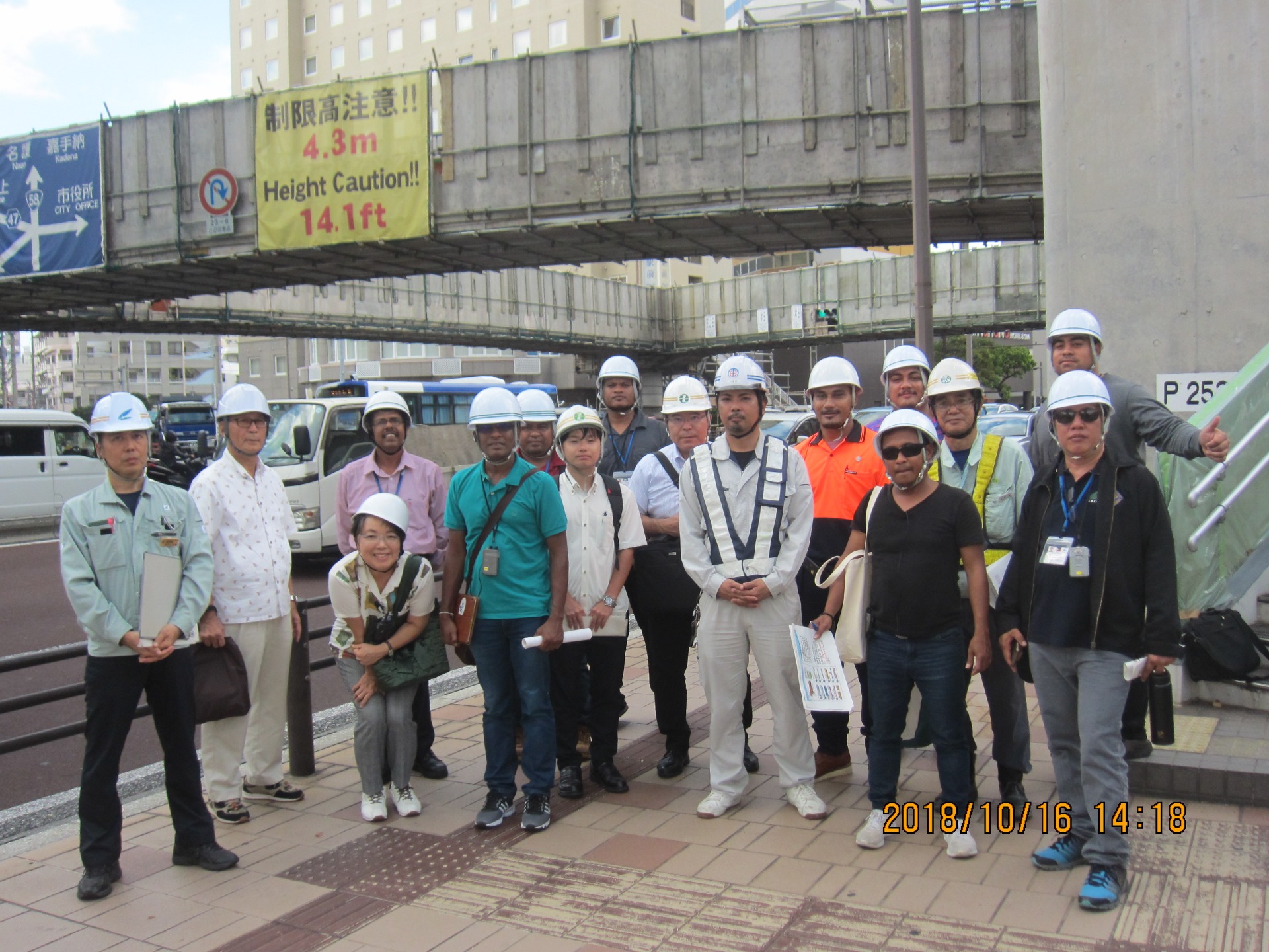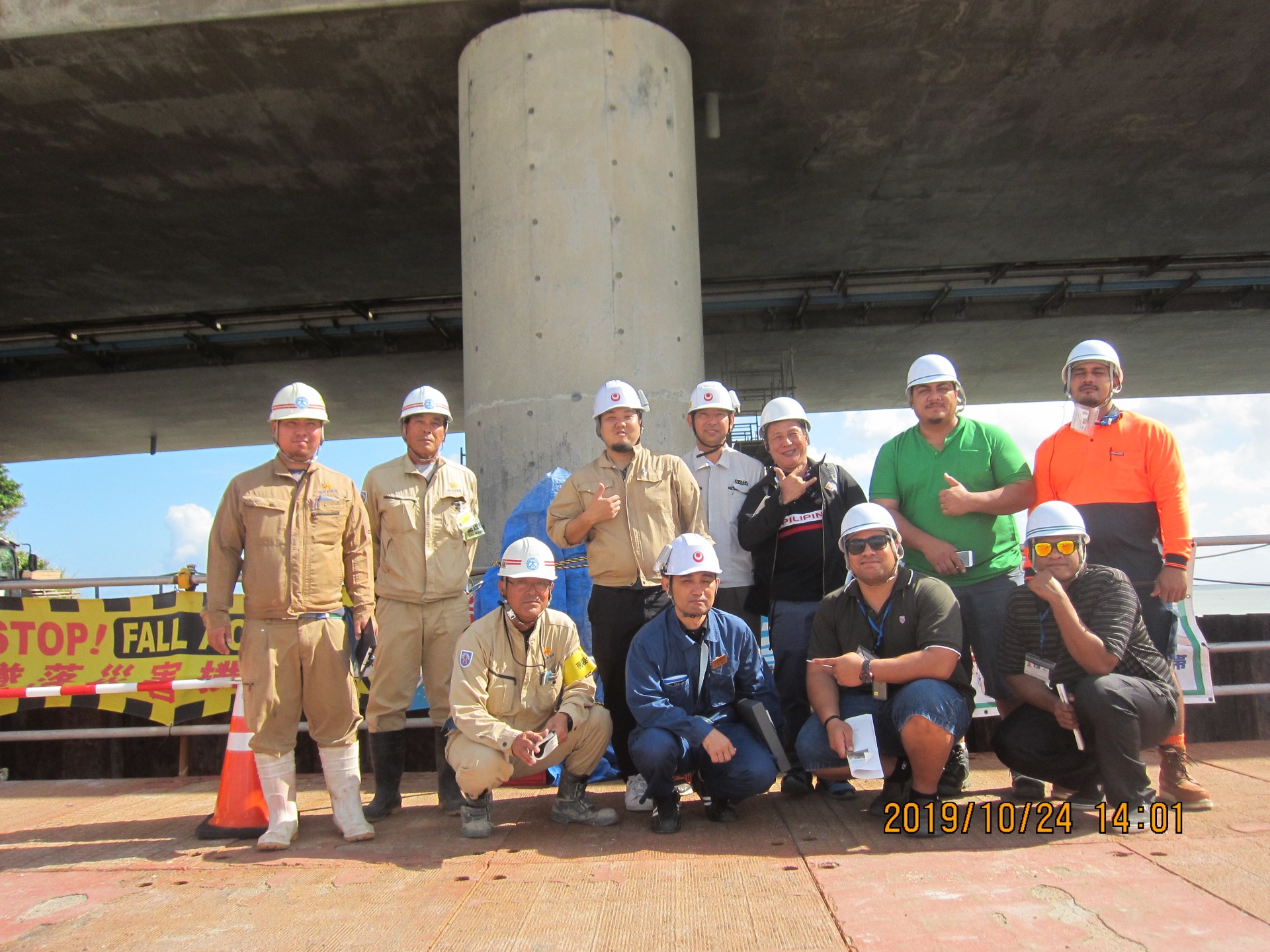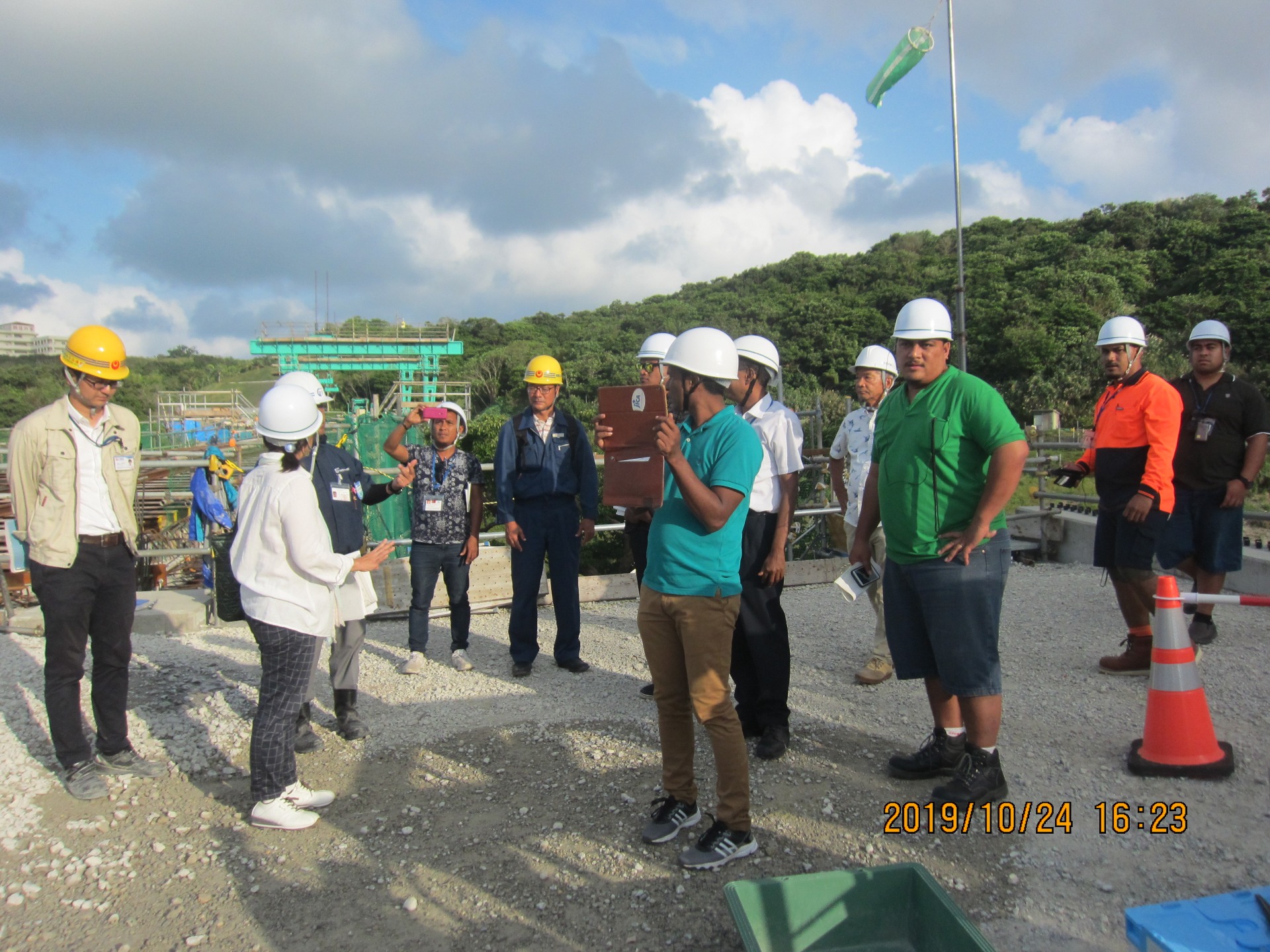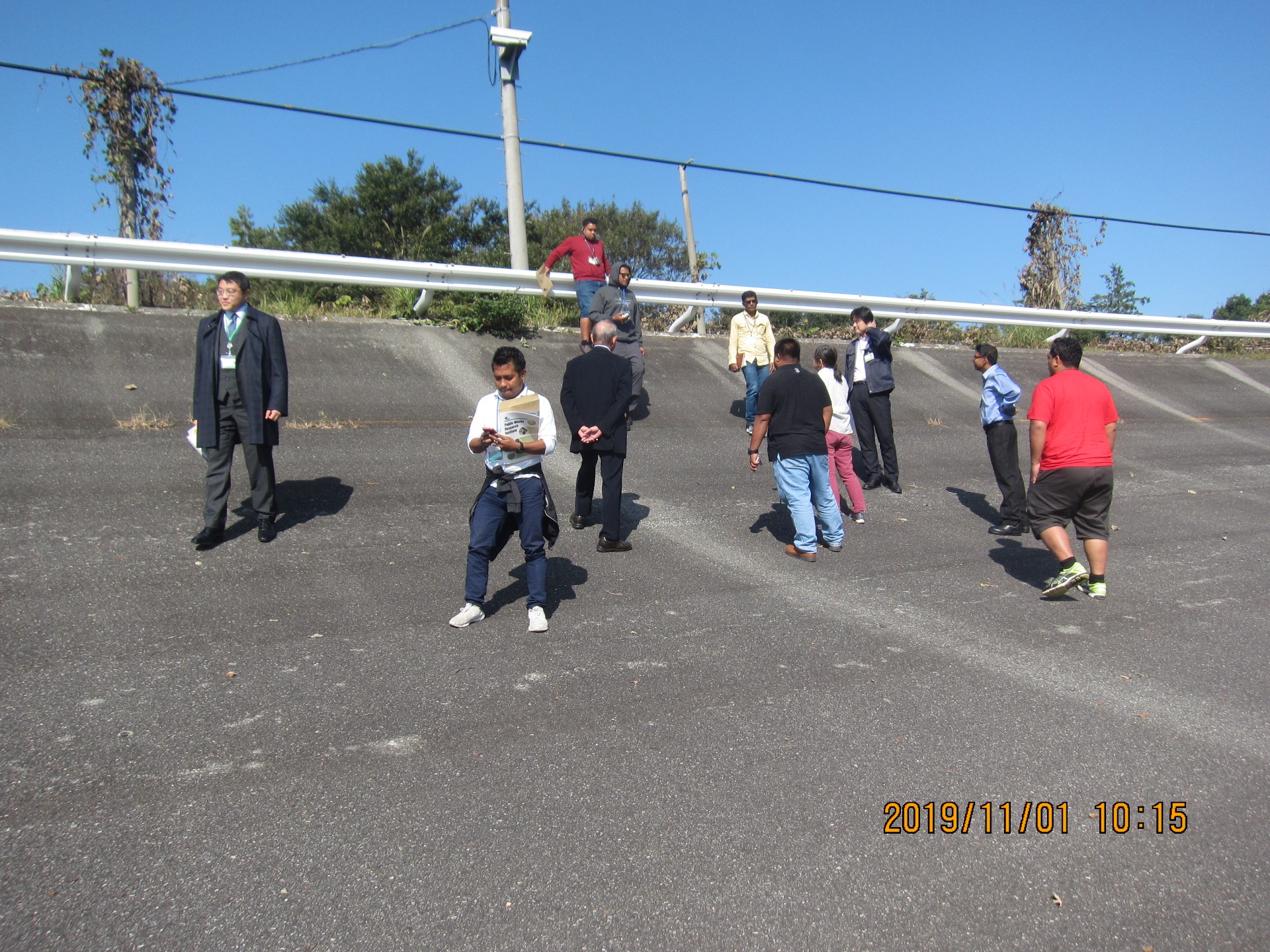 In the afternoon, we visited two sites where national government has ordered maintenance and reinforcement works. First site was at Izumizaki intersection where pedestrian bridge was under repair work. Participants asked questions about how actually the repair being done. The second site was at Haebaru elevated bridge where bridge pier was under anti-seismic reinforcement work. Participants were keenly observed the work process.
