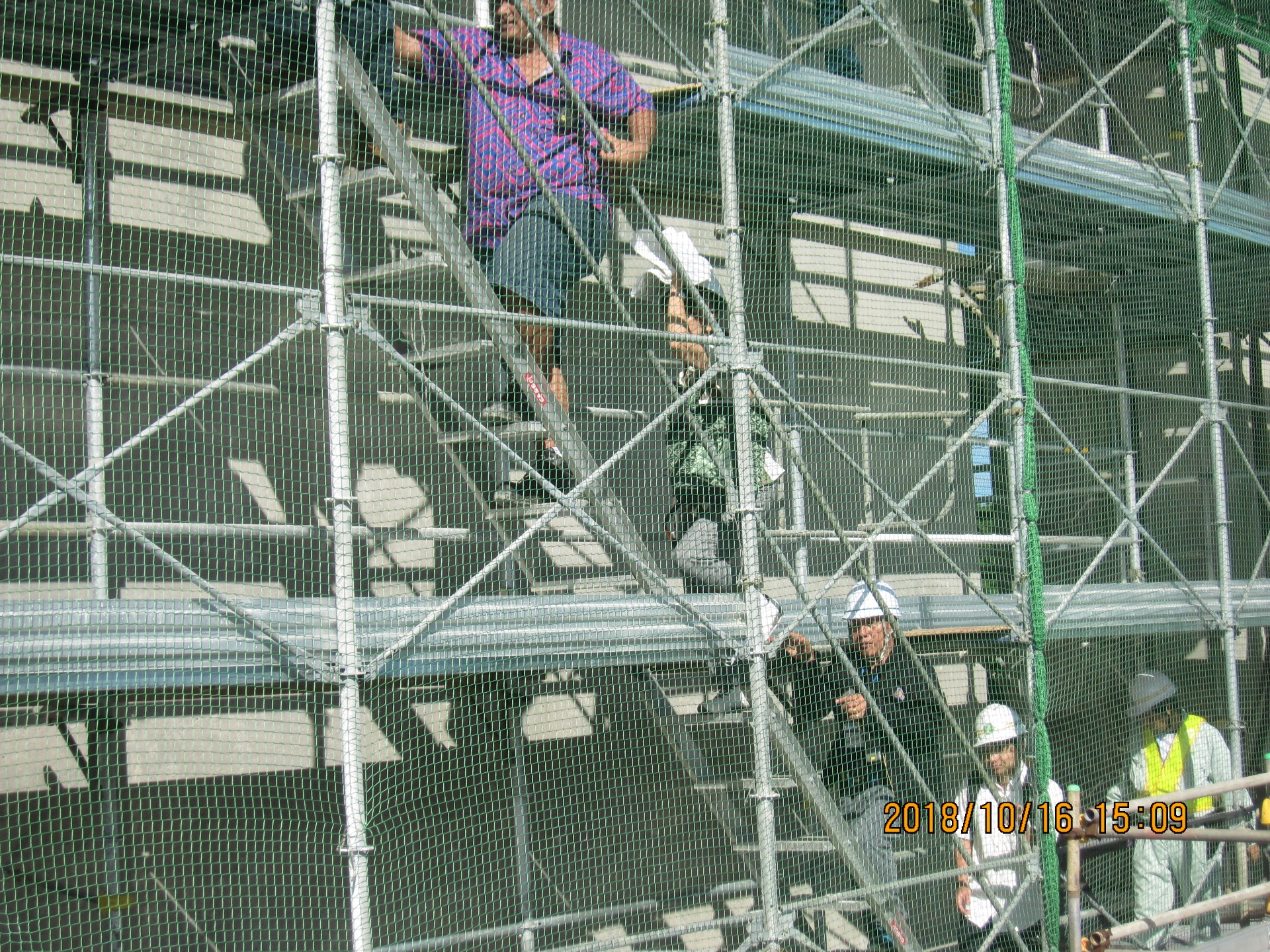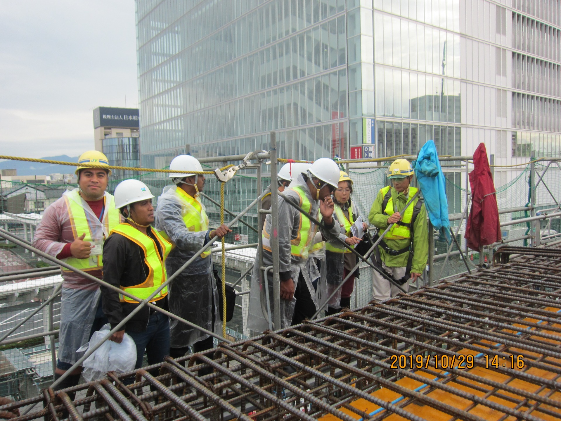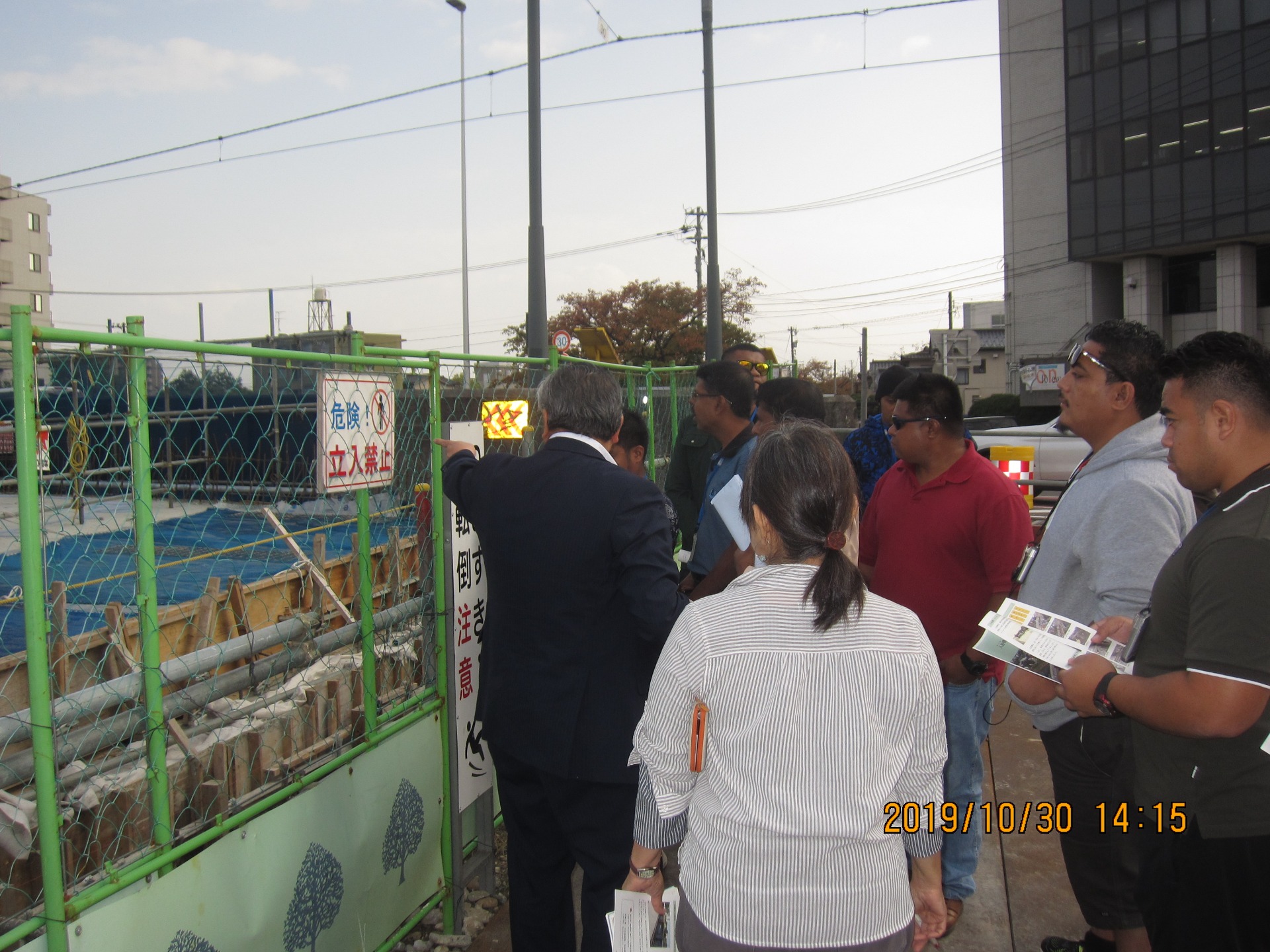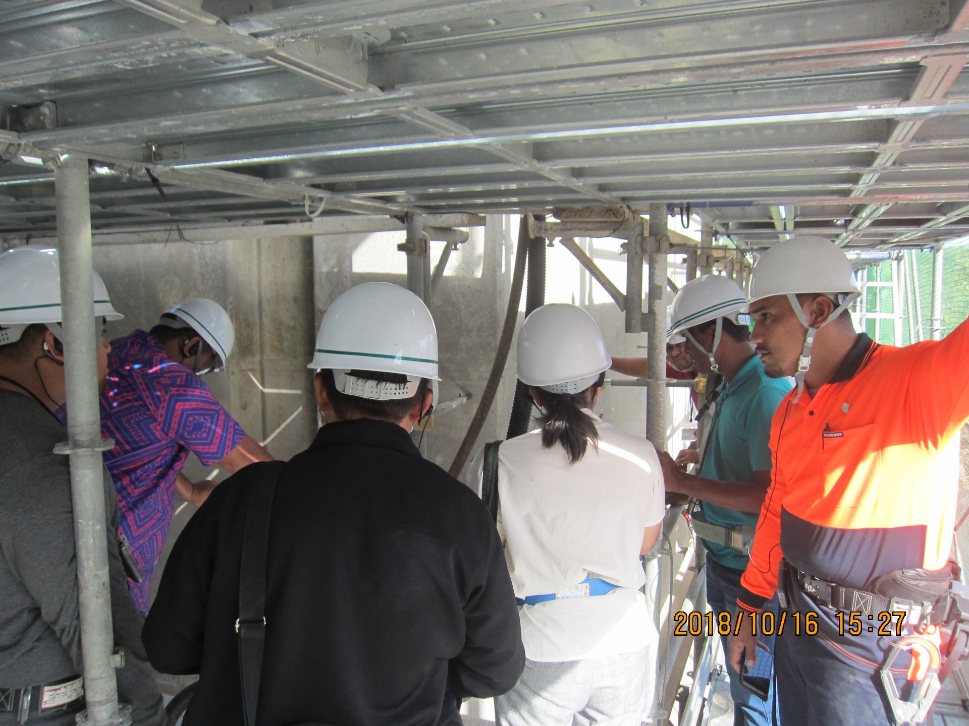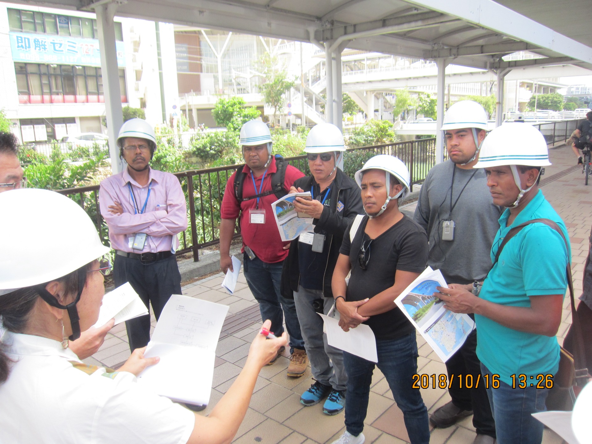 In the afternoon, we visited two sites where national government has ordered maintenance and reinforcement works. First site was at Izumizaki intersection where pedestrian bridge was under repair work. Participants asked questions about how actually the repair being done. The second site was at Haebaru elevated bridge where bridge pier was under anti-seismic reinforcement work. Participants were keenly observed the work process.