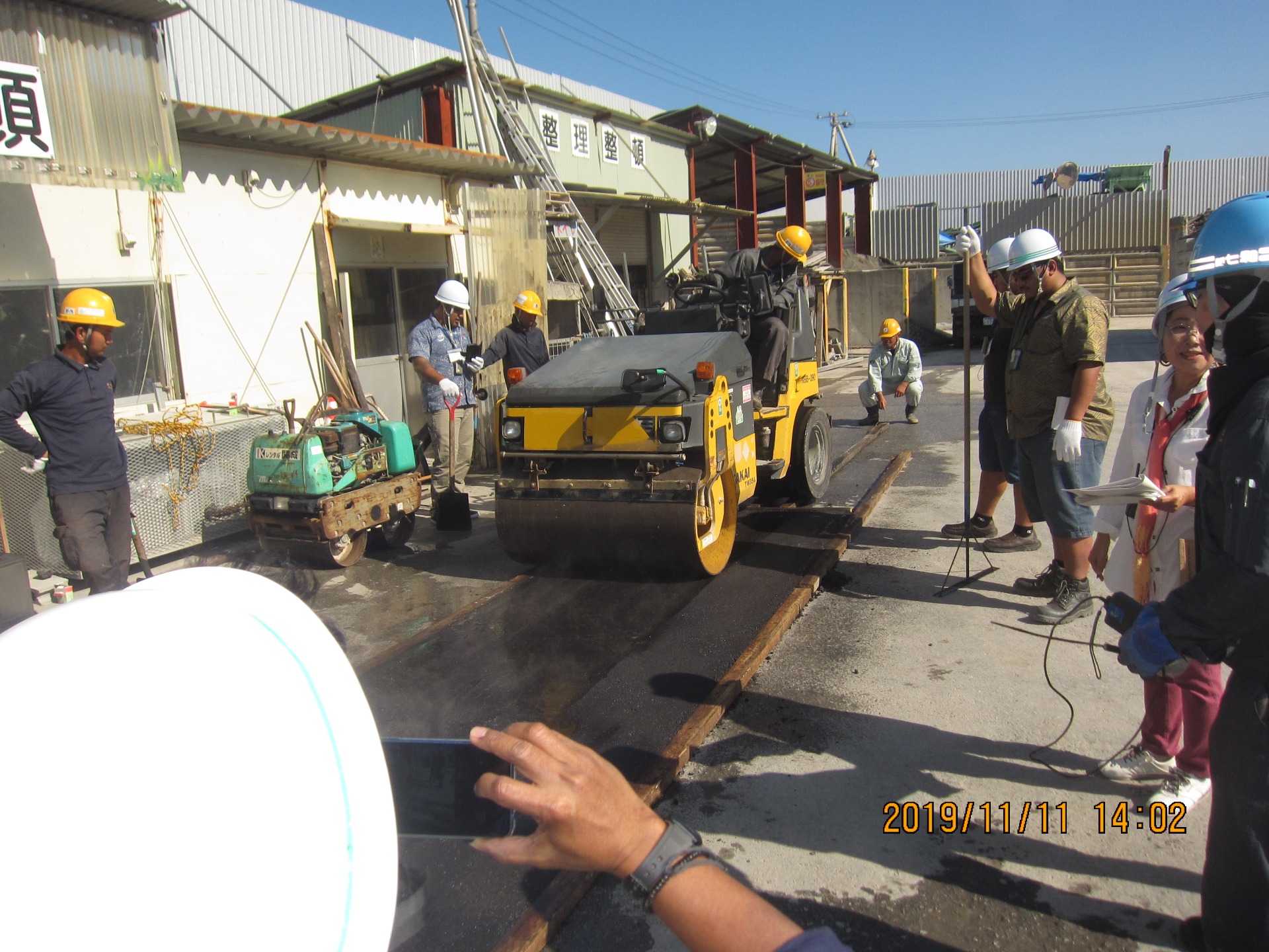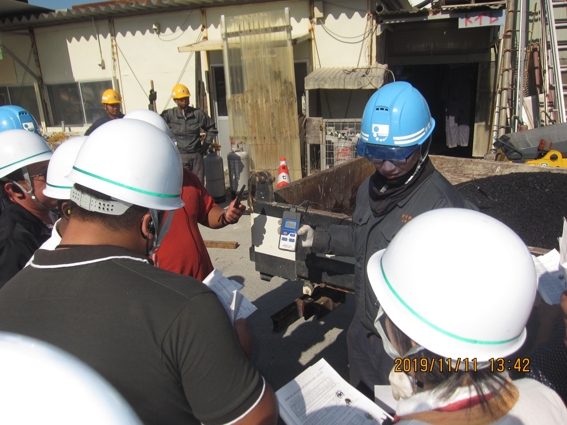 In the afternoon, participants did an exercise of material testing in the plant. Using asphalt material shipped out of the factory, we experienced the actual check of mix, temperature measurement, labeling with rake, and compaction. At the end, we checked the finished surface condition. Participants assessed the evenness, fineness, and cracks by themselves.