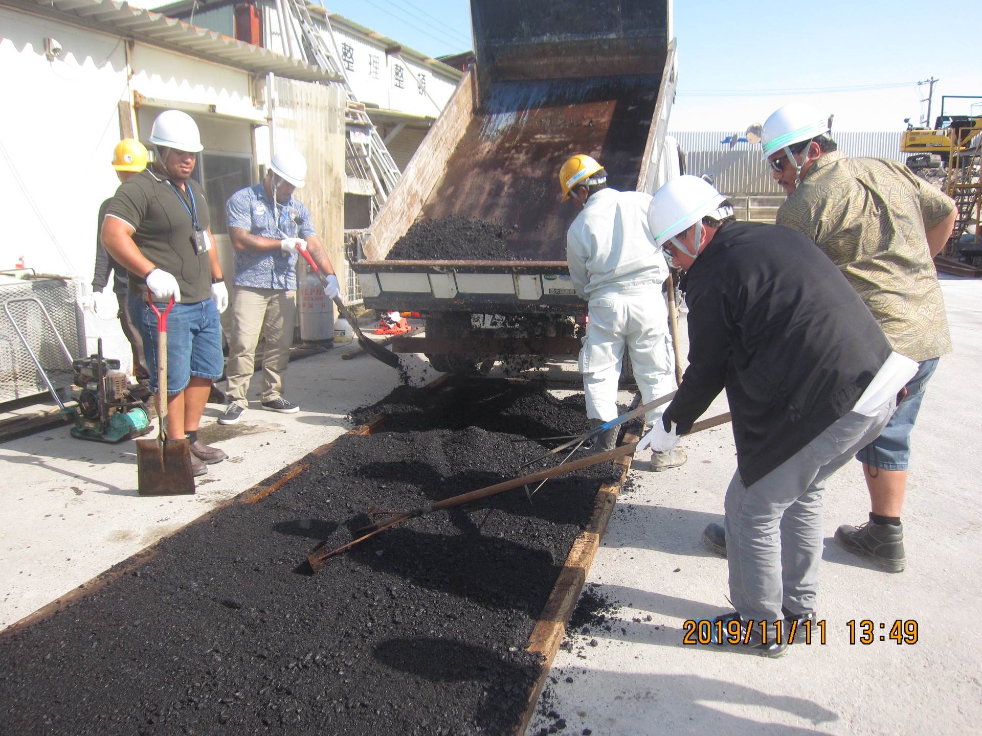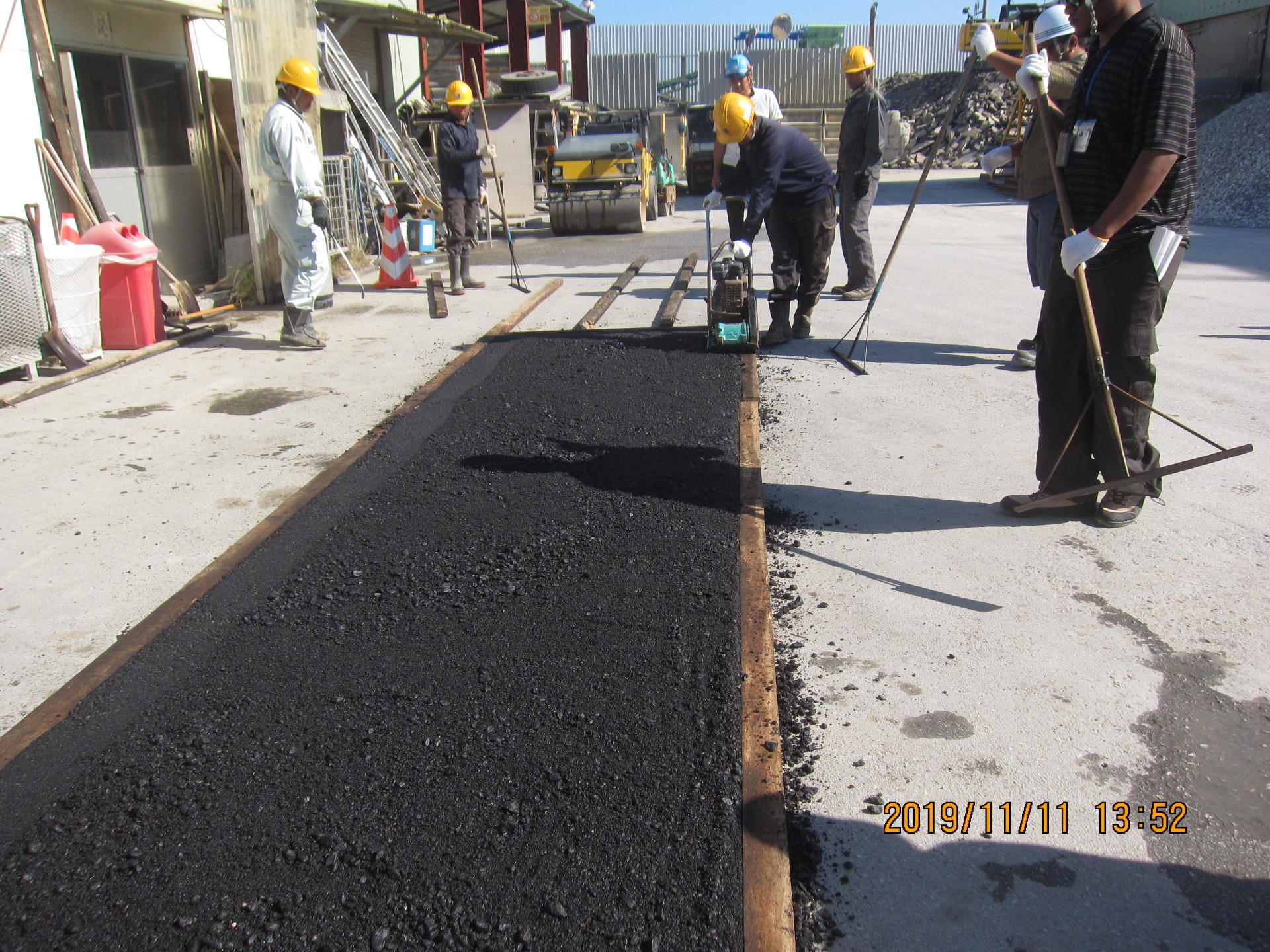 午後からは工場内で試験施工を行い、研修生自らが体験出来ました。工場から出荷された材料を使用して、敷き均しから転圧までを実施工しました。研修生自らで、配合確認、温度測定、レーキ等による敷き均し体験、そして最後に仕上げ面の確認を行いました。研修生は平たん性、きめ、ひび割れ等を自らで評価しました。