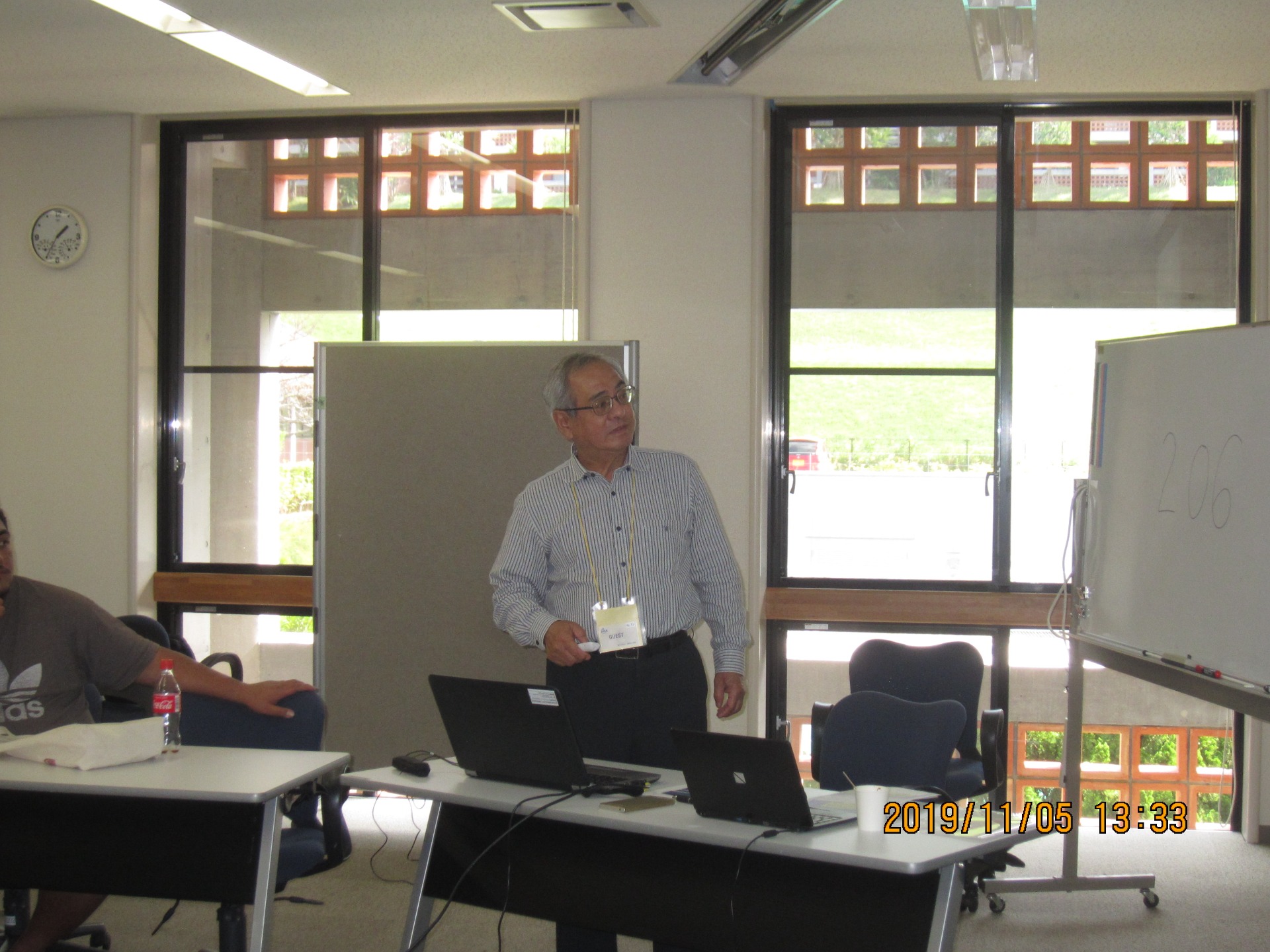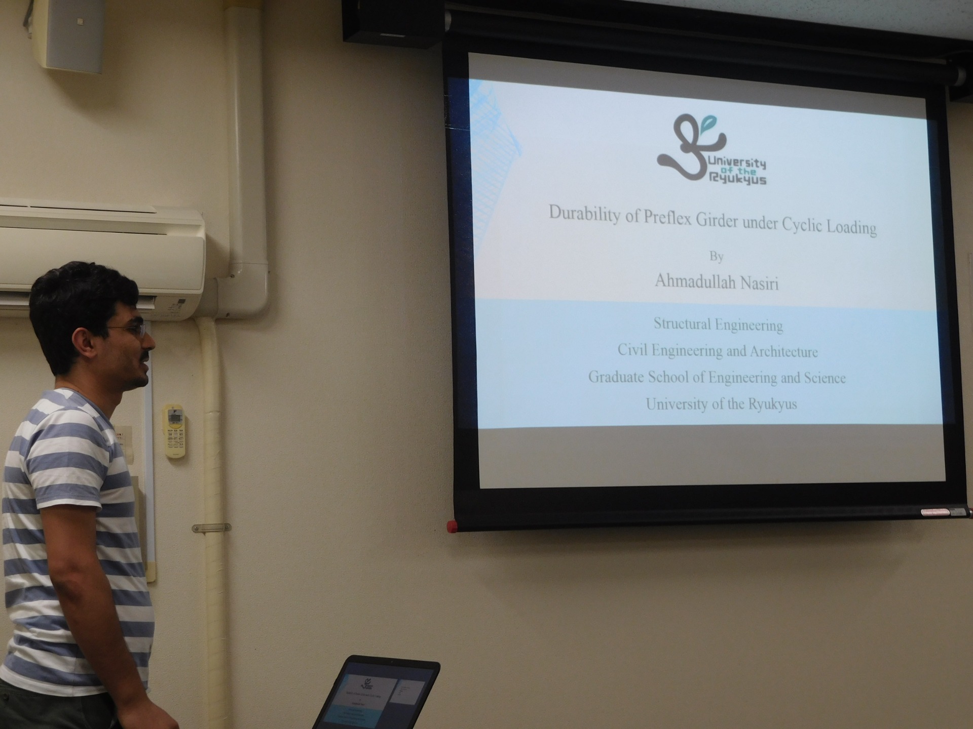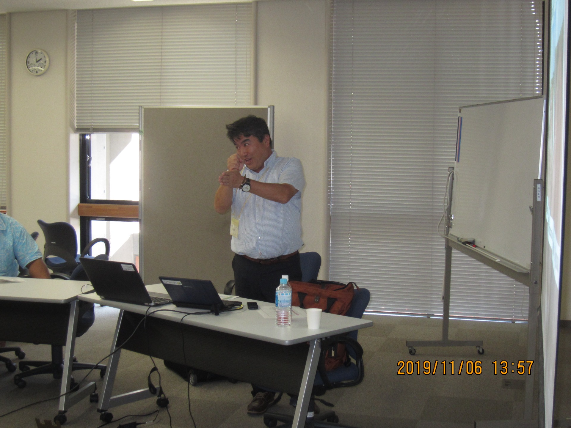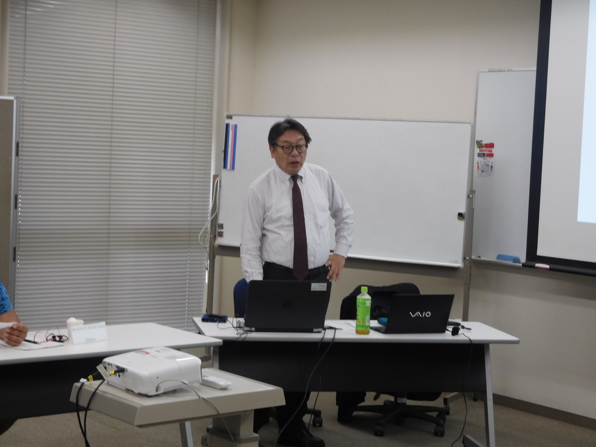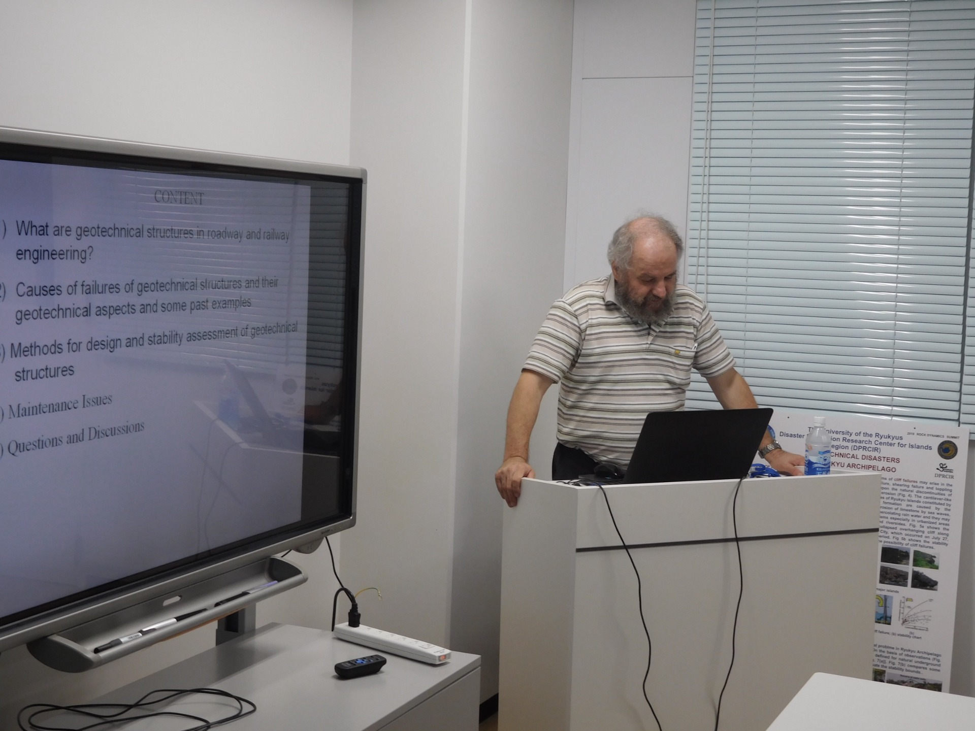 Morning presentation was given by Prof. Aydan, School of Engineering, University of the Ryukyus on geotechnology, and he showed the research equipment in natural disaster simulation laboratory of "Disaster Prevention Research Center for Island Regions". Participants were amazed to see advanced equipment such as tsunami simulation device.