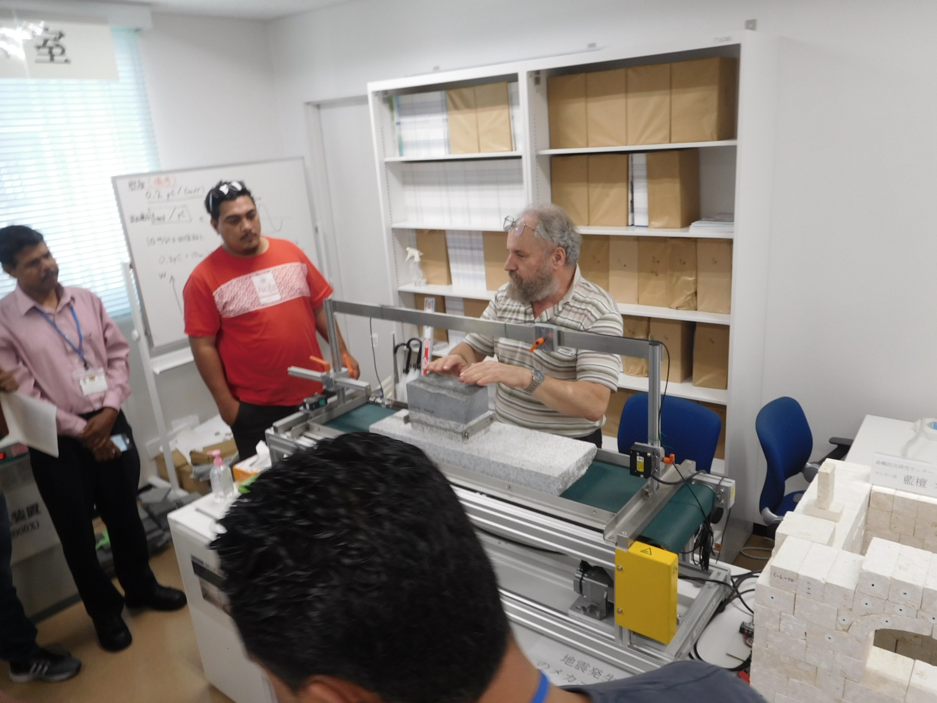 We observed research facilities in Public Works Research Institute (PWRI) and National Institute for Land and Infrastructure Management (NILIM) in the morning. We first experienced running on test run field with our bus and pavement test field where it is inclined by 28 degrees. Then we were shown experimental equipment of structures and dismantled bridge members stored for research purposes. We saw sample beams taken from a collapsed bridge in Okinawa.