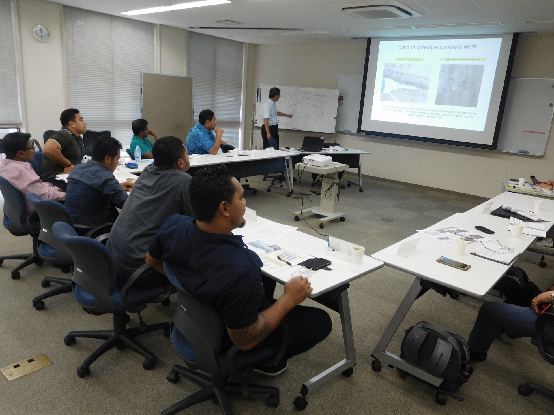 午前は日本コンクリート技術㈱の篠田社長による「塩害とコンクリート構造物の耐久性」と題した講義でした。塩害のしくみやコンクリート舗装等に対し、研修員からは多くの質問がありました。