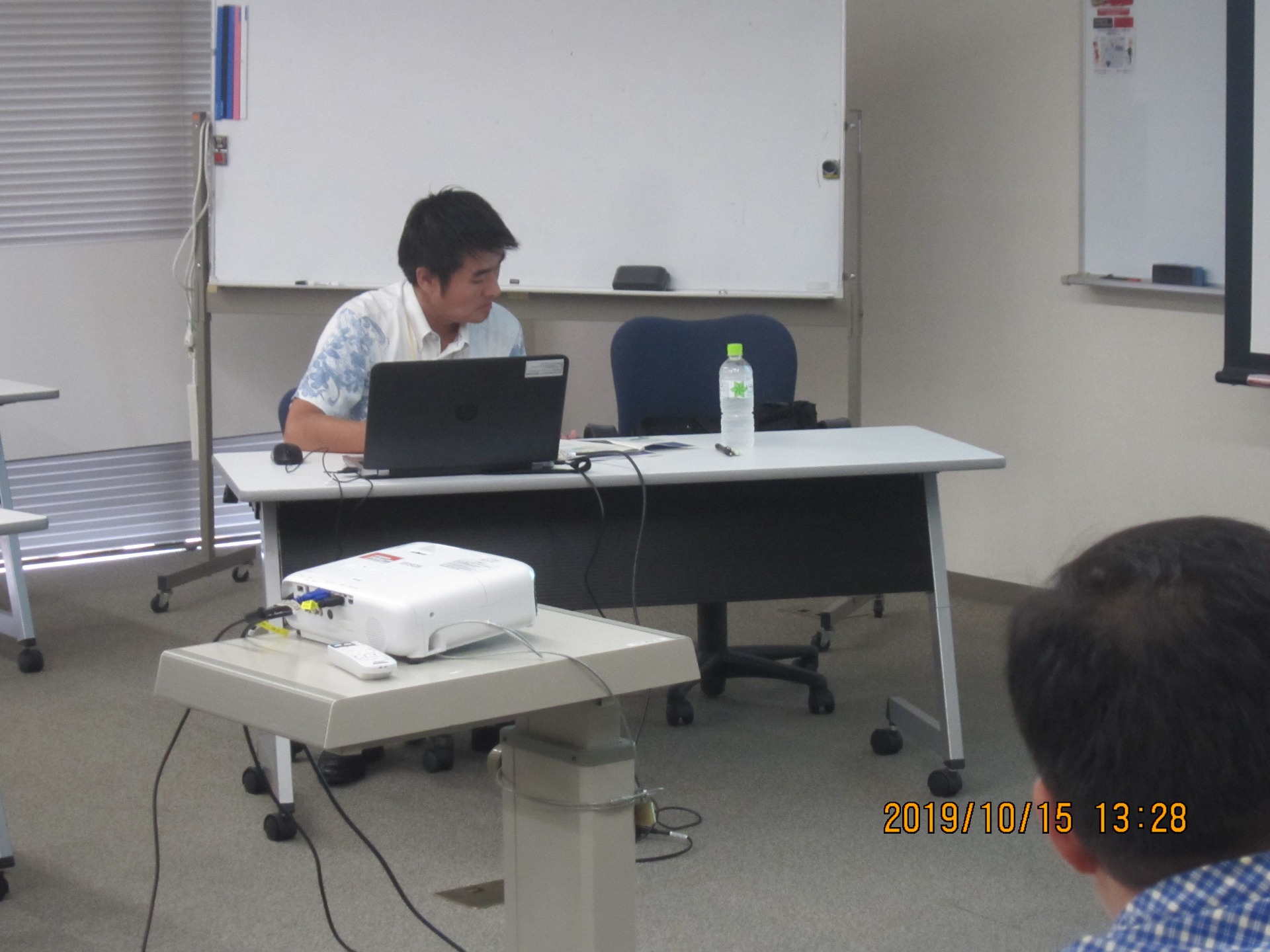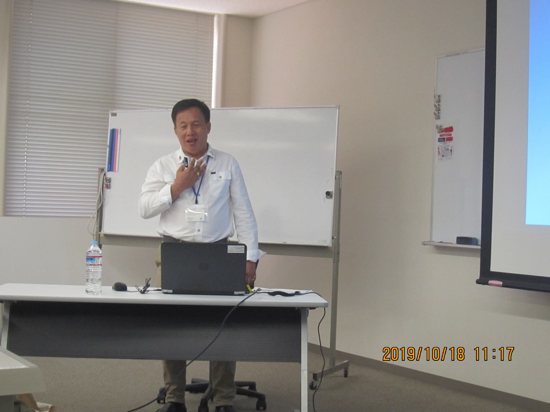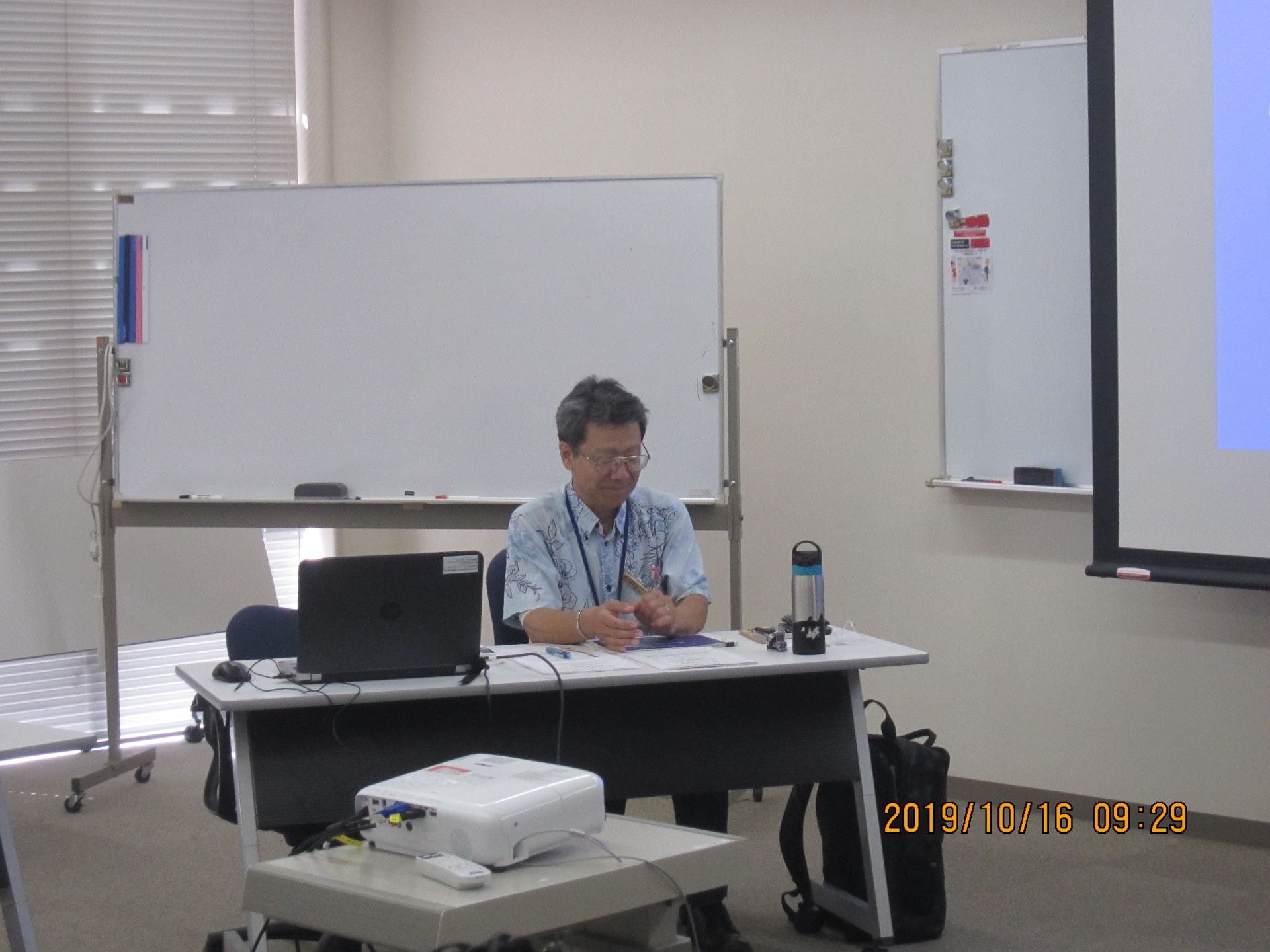 午前は、「国の道路防災対策」をテーマにした沖縄総合事務局開発建設部の防災課の中園課長の講義でした。中園課長は、近々の台風19号の被災状況を具体的な事例として、国の災害発生時等への対応について解説しました。最後に総合事務局の防災対策について解説されました。途中、質疑応答の繰り返しでした。
