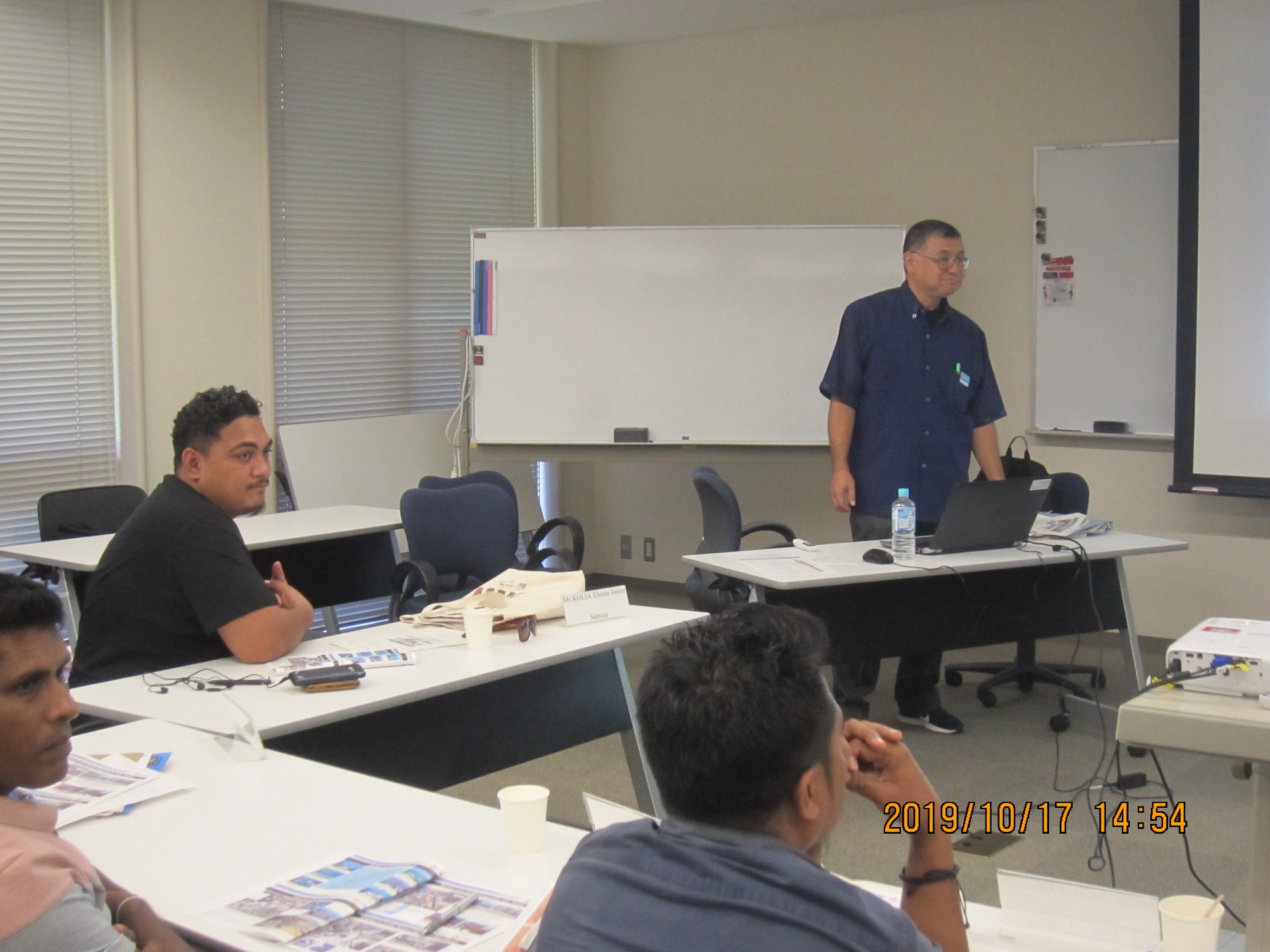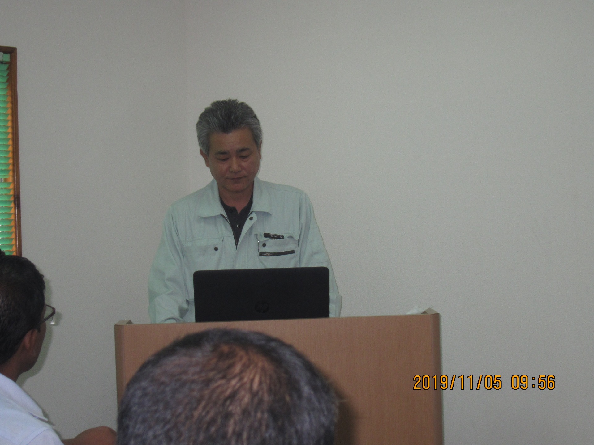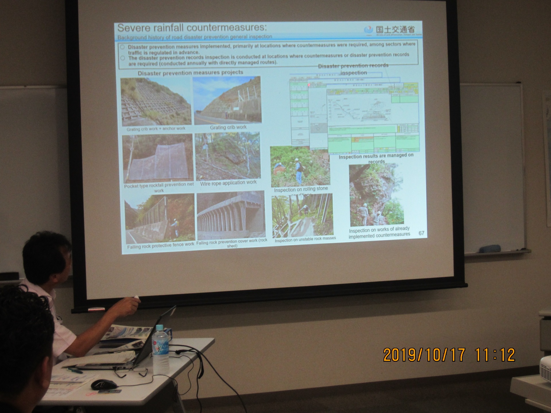 Morning lecture was on "Operating and Maintaining of National Highways" delivered by Mr. Shimoji, Manager of Department of Development and Construction, Okinawa General Bureau. In his lecture, he covered how daily maintenance and disaster response activities are carried out. At the end, he spoked about the duties of Okinawa General Bureau. Then he answered to many questions that are raised.