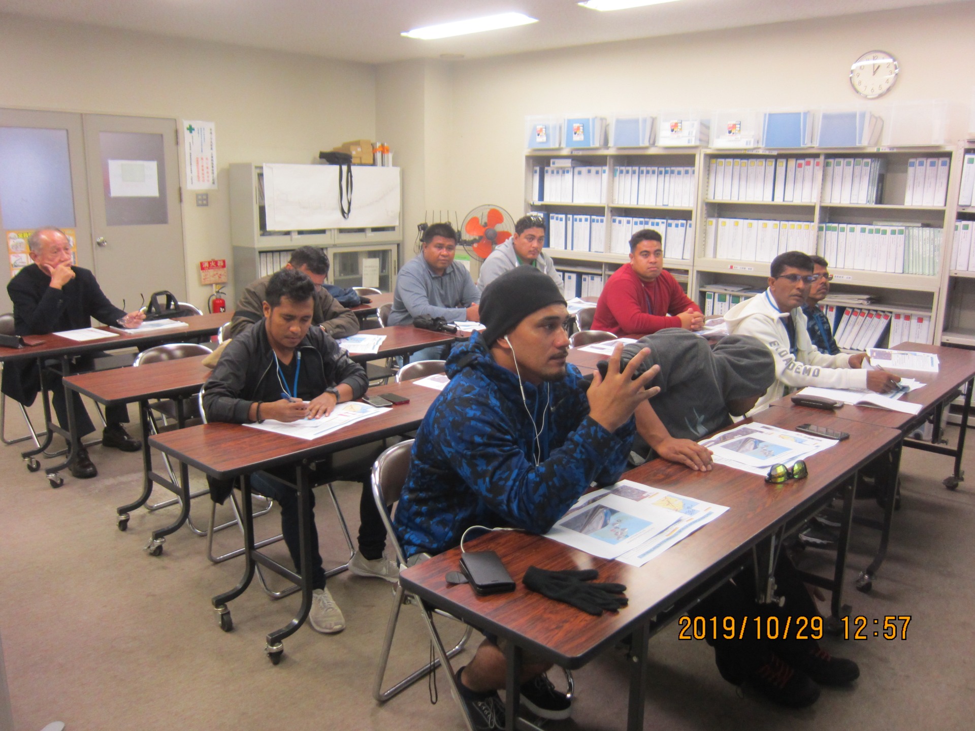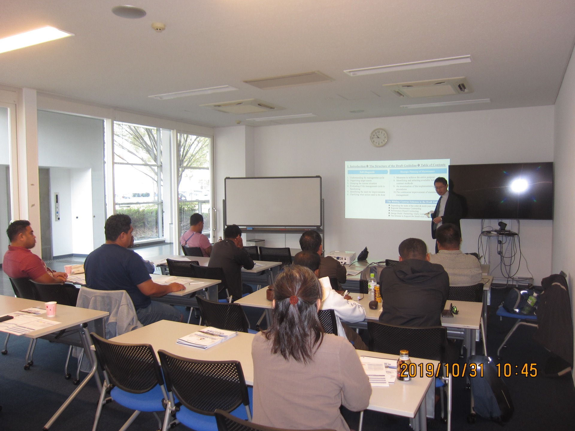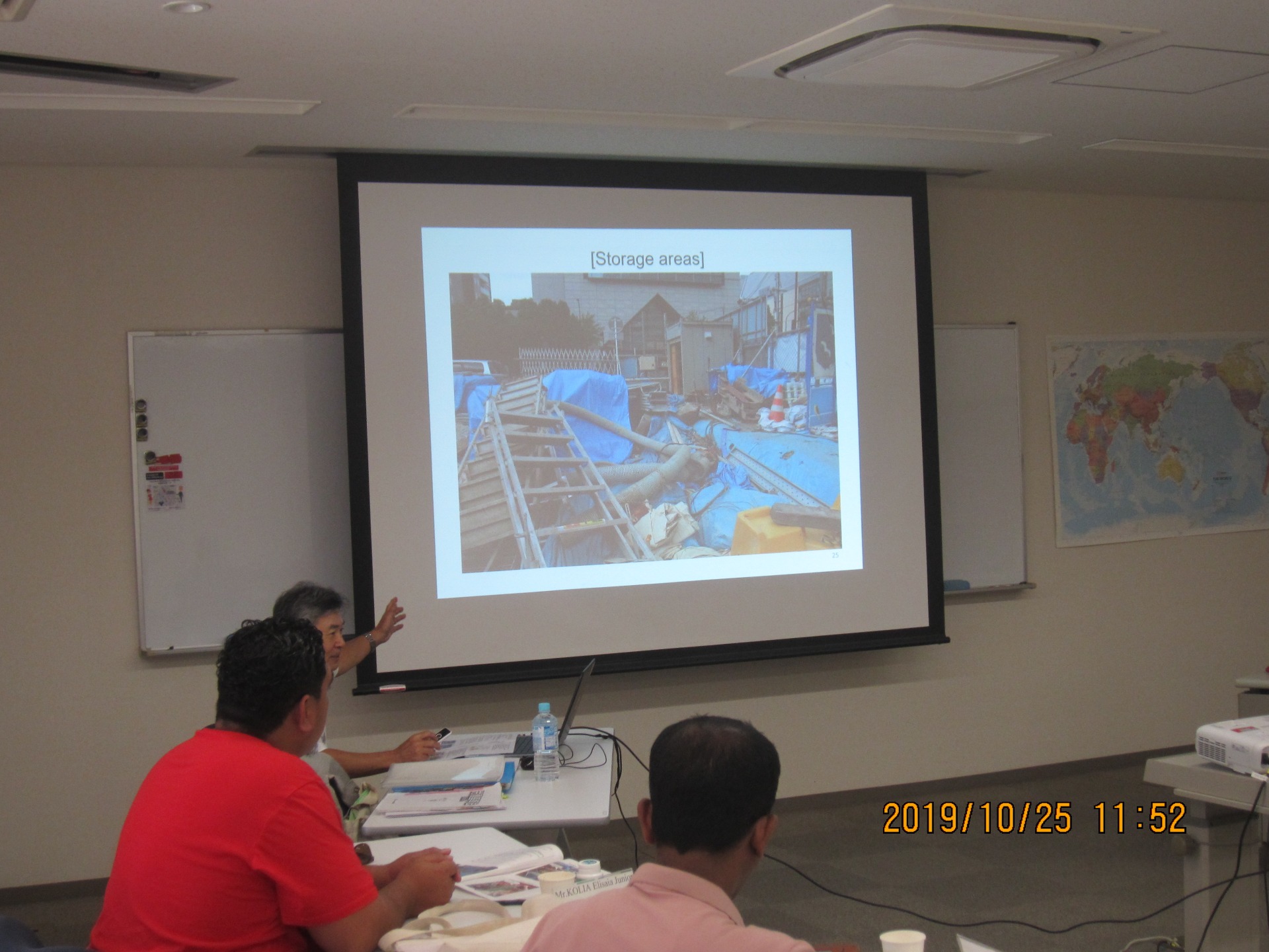 午前は、「日本の安全衛生管理」をテーマにした市川市の福田さんの講義でした。日本国憲法から労働基準法等の法体系を示して、労働安全衛生の基準である「労働安全衛生法」の目的や主な規制内容について解説しました。最後に、工事現場の不適切な写真を示しながら、研修生らと整理整頓について議論しました。