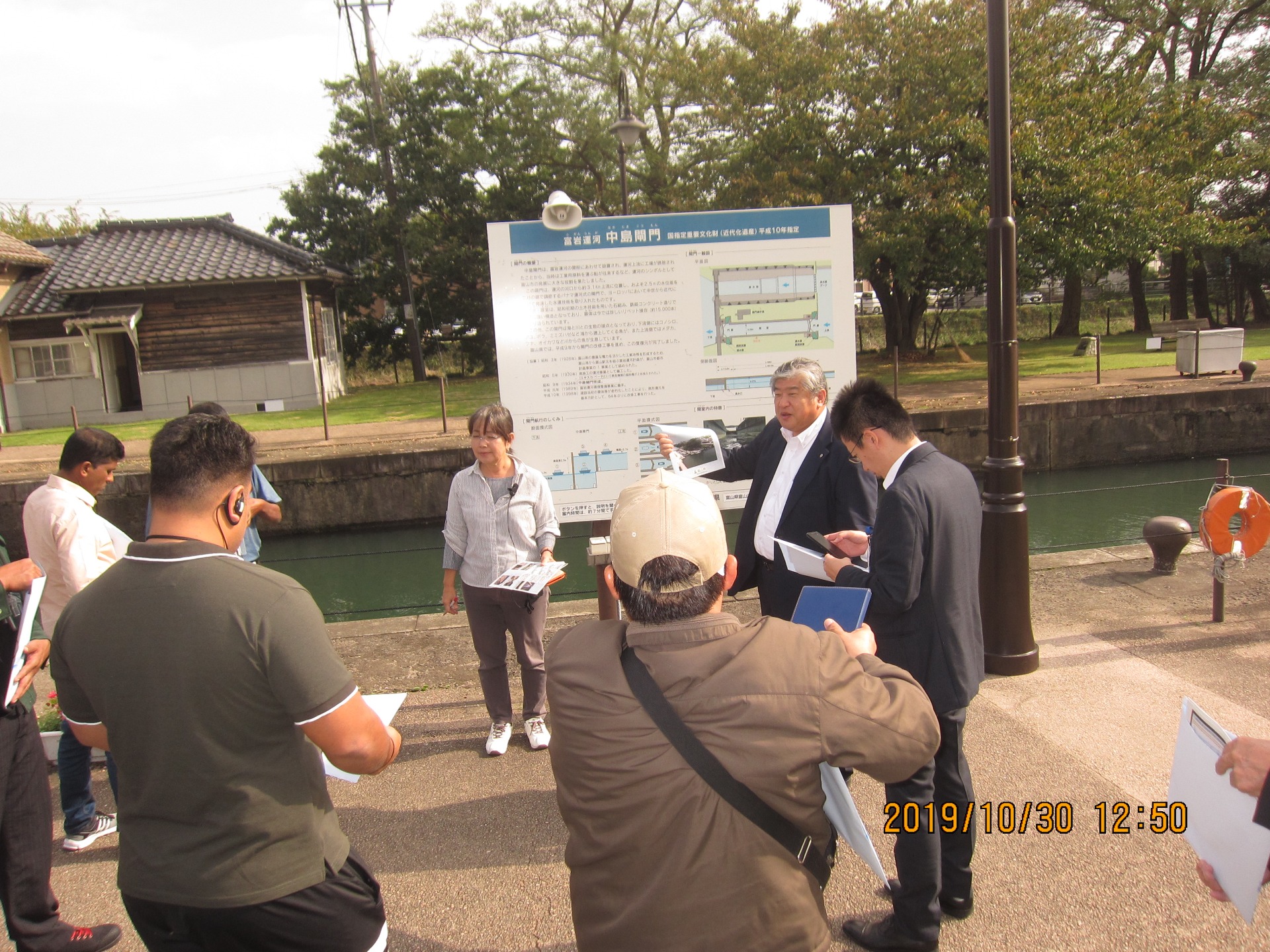 In the afternoon, we visited Nakajima Lock to study its historical role and structure and observed how water level was adjusted so pleasure boat can cruise through this channel. Then we observed two bridges under replacement work including Oshima Bridge and road construction work to connect tram lines of north and south of Toyama Station. We used a minibus owned by the city office and trams as means of transportation. After the observation, we moved to Tokyo by Hokuriku Shinkansen that restarted the operation after a suspension due to the typhoon damage.