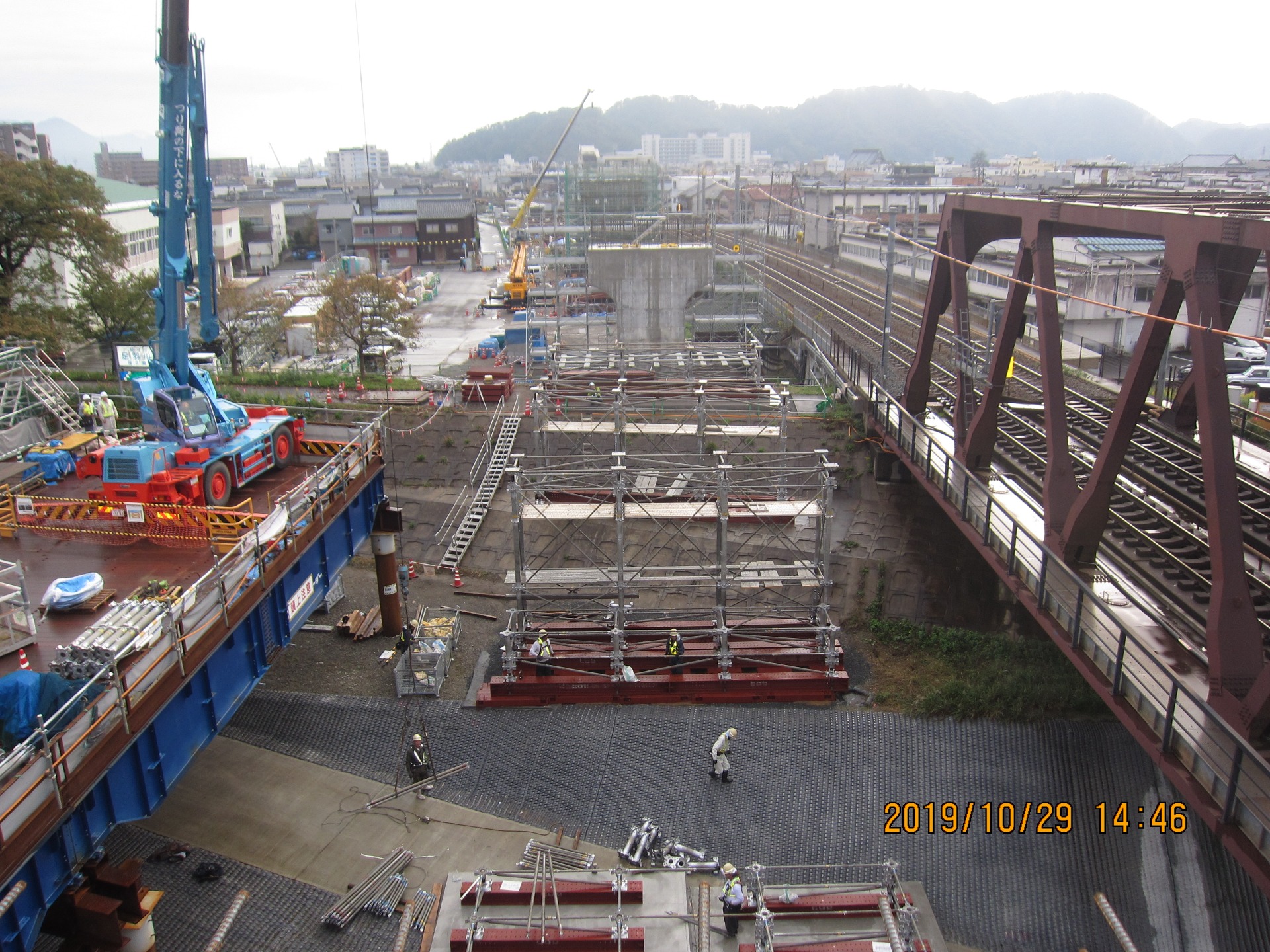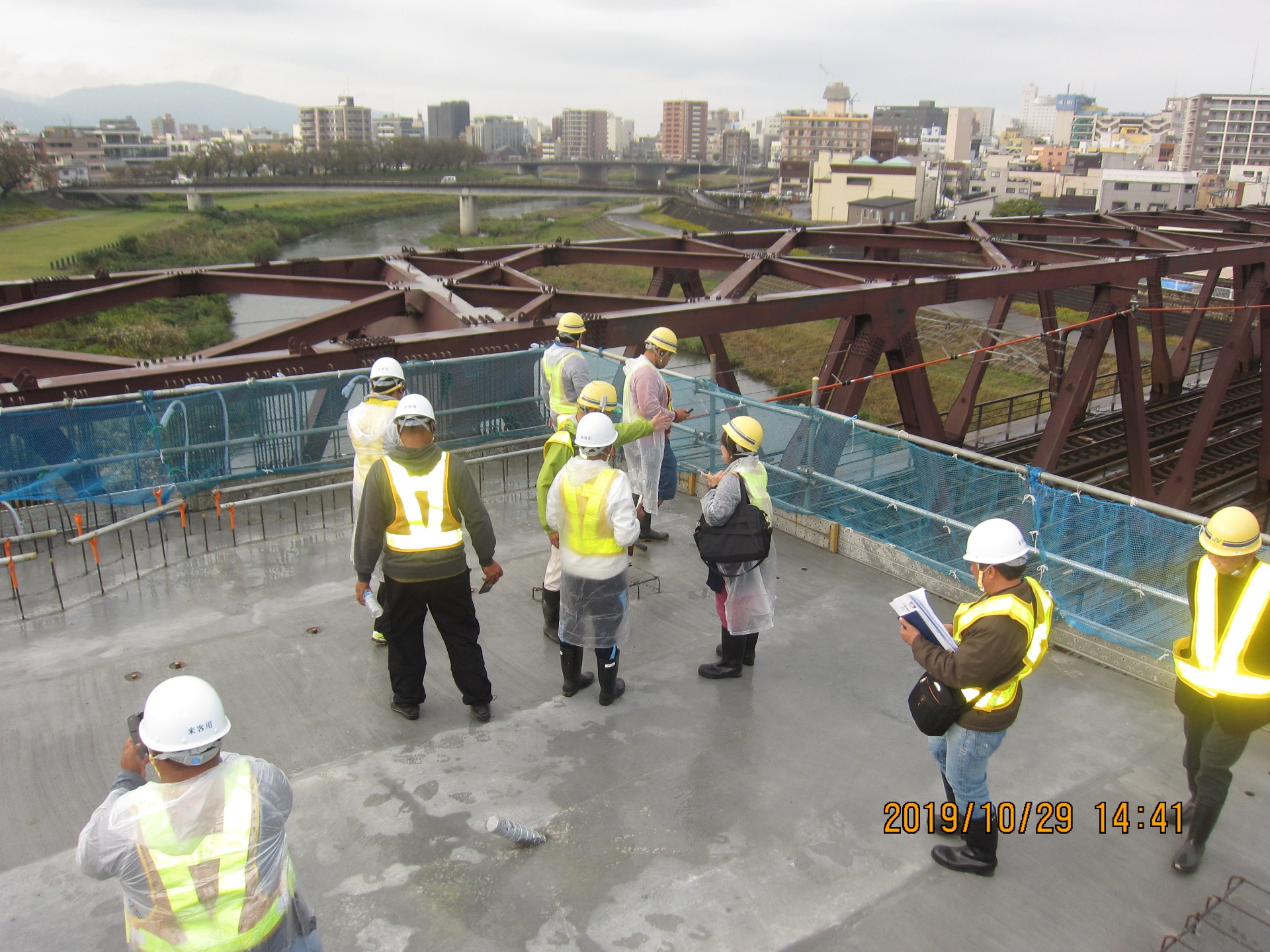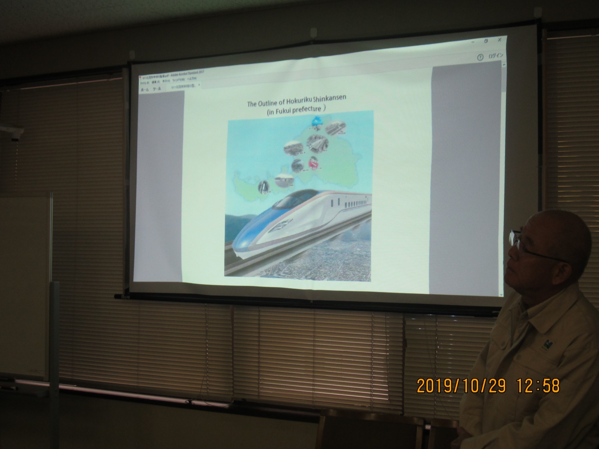 今週から県外視察です。昨夜京都の宿泊し、今朝京都からサンダーバード号で福井に入りました。駅前で施工中の北陸新幹線の現場見学でした。駅前と足羽川までの施工延長も長く、様々な工種がある大規模工事でした。基礎工事は施工済みでしたが、事務所で堀田グループ長、及び益田所長から北陸新幹線、各基礎工法の説明を受け、その後現場で施工状況を視察しました。橋梁施工箇所では、カンチレバー工法の準備中でした。研修生は基礎工事の施工方法等を熱心に聞いて質問をしていました。夕方、特急、新幹線を乗り継いで、富山市に入りました。そして、夜は富山市役所の技術者の方々との居酒屋で懇親会でした。