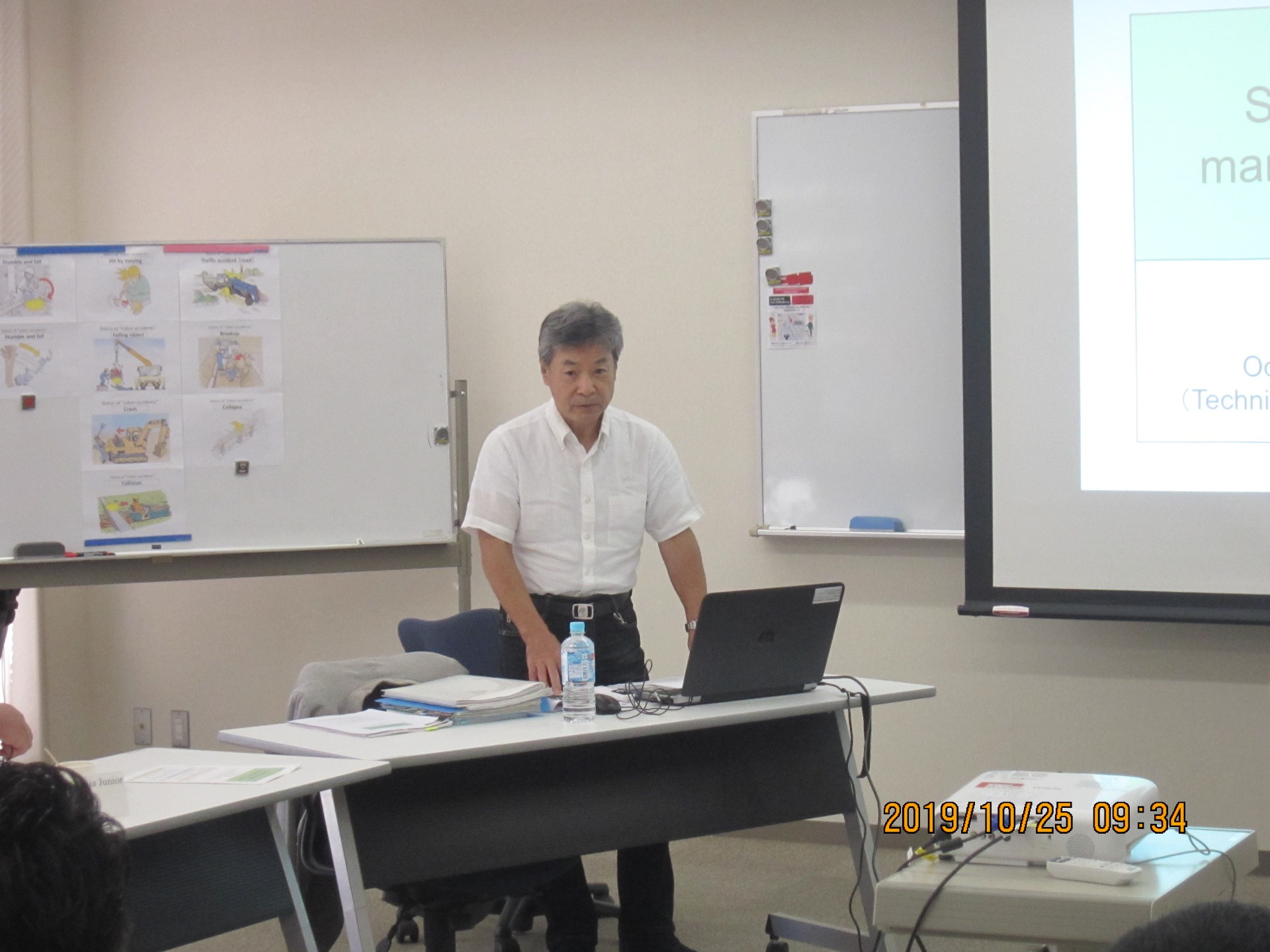 Morning lecture was delivered by Mr. Fukuda, a consultant for Ichikawa City Hall, on "Safety and Health Management in Japan". He explained that Constitution of Japan and Labor Standards Act are the legislations which ensure occupational safety, and introduced Industrial Safety and Health Act, its purpose and what it demands, as this law is the principle of safety and health measures. He showed some pictures of bad examples of construction sites to elucidate the importance of tidiness.