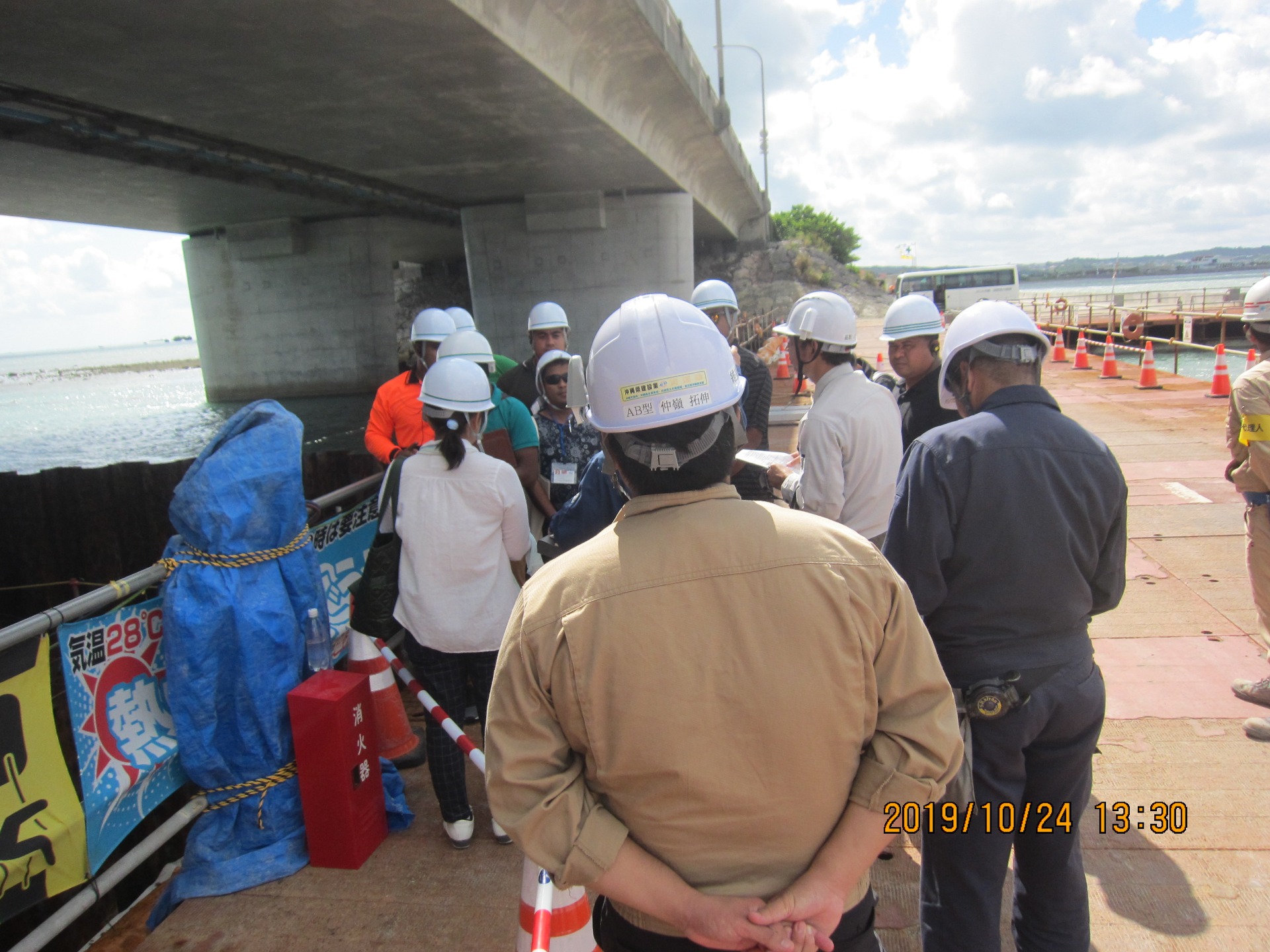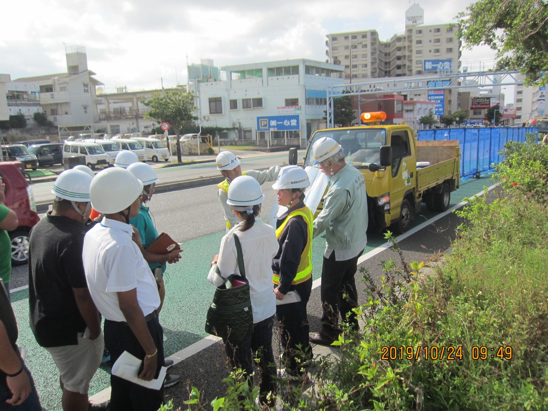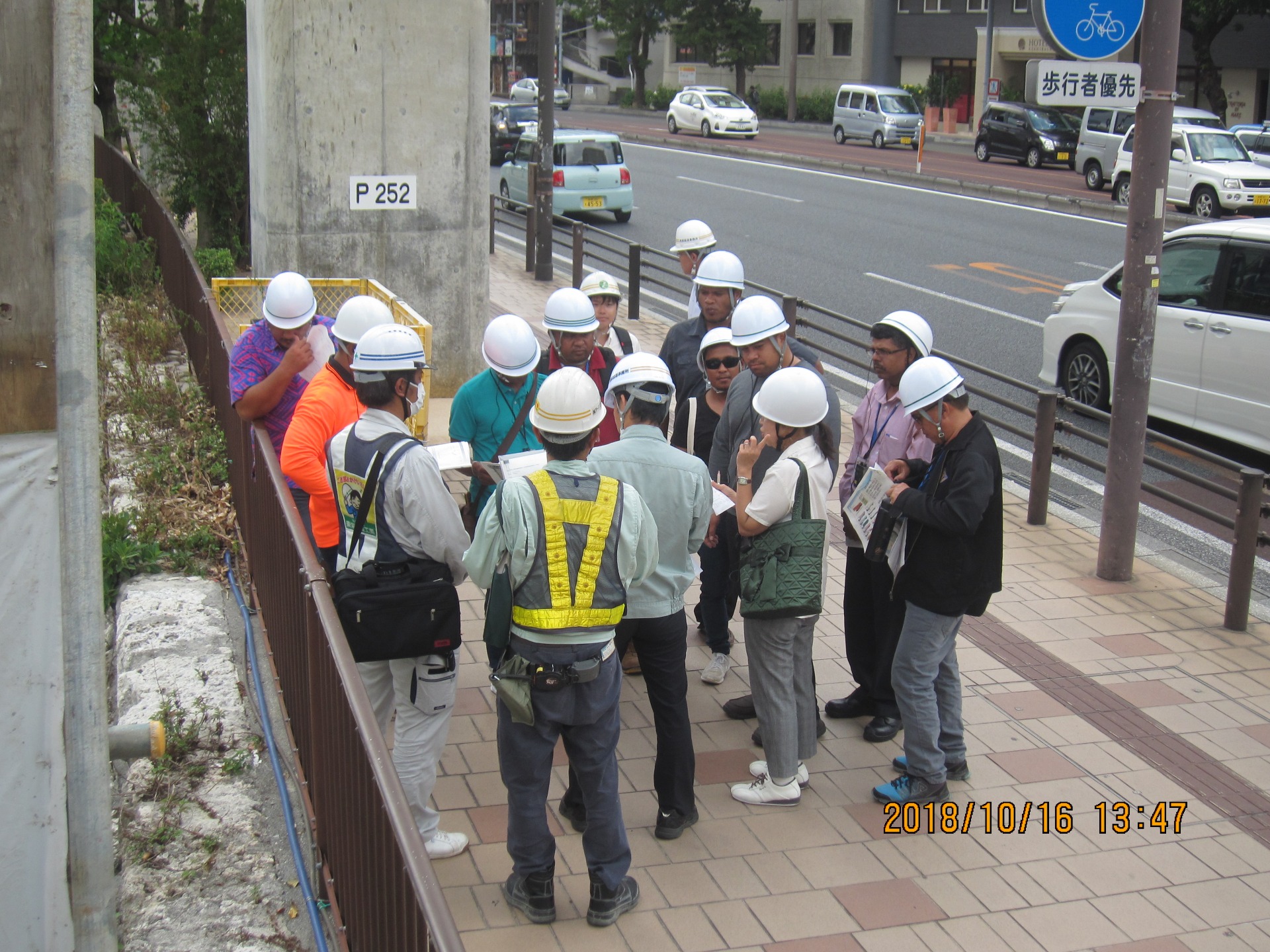 午後は、国の維持補修現場見学でした。最初の泉崎歩道橋現場では、具体的な補修方法への質問が相次いで、次の南風原高架橋耐震補強工事では、実際の施工状況を興味深く観察していました。