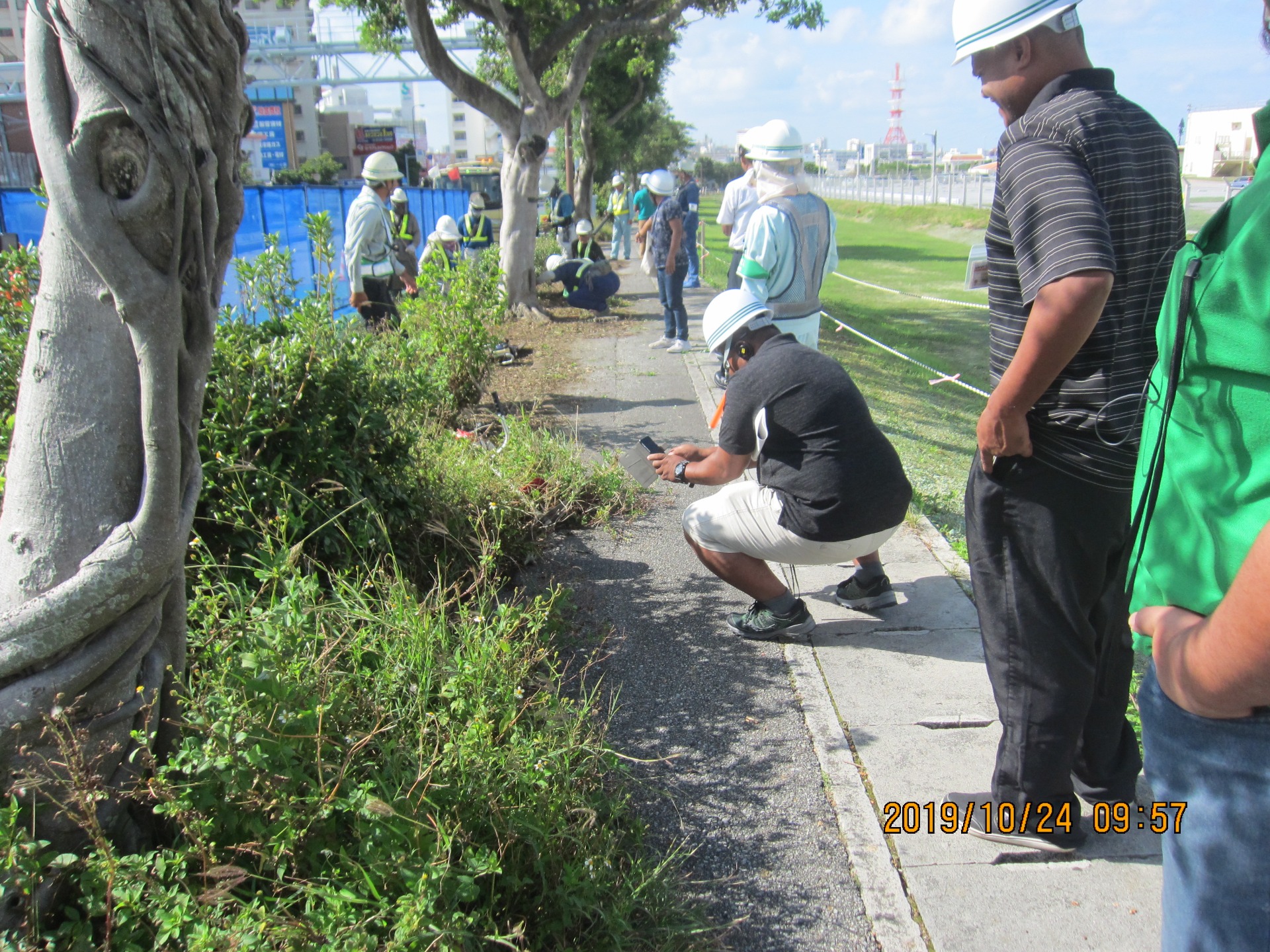 We spent a whole day for site visits, including 2 national road maintenance sites (shrub trimming/weeding work of route 58 in Urasoe and drain cleaning of Ginowan bypass line) in the morning and 2 construction sites of the structures ordered by Okinawa prefectural government in the afternoon. In the morning, participants showed keen interest and asked questions about the equipment in use such as grass cutter and vacuum cleaner.