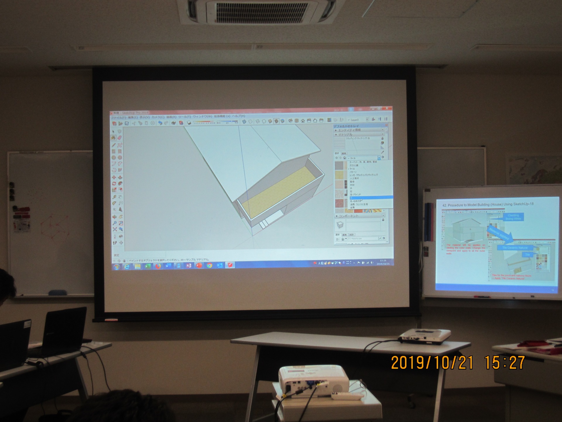 Afternoon lecture was on "Drone and 3D-CAD" presented by Mr. Suzuki, Director of Strategy Section of Okabe Maintenance Co. Ltd. First half of his lecture covered drone aerial photography and procedure of 3D image generation. In the later half, he explained procedure of modeling in SketchUp. He made it easy for participants to understand by showing examples. Participants asked many questions as they would try to draw modeling with this technique in their own time.