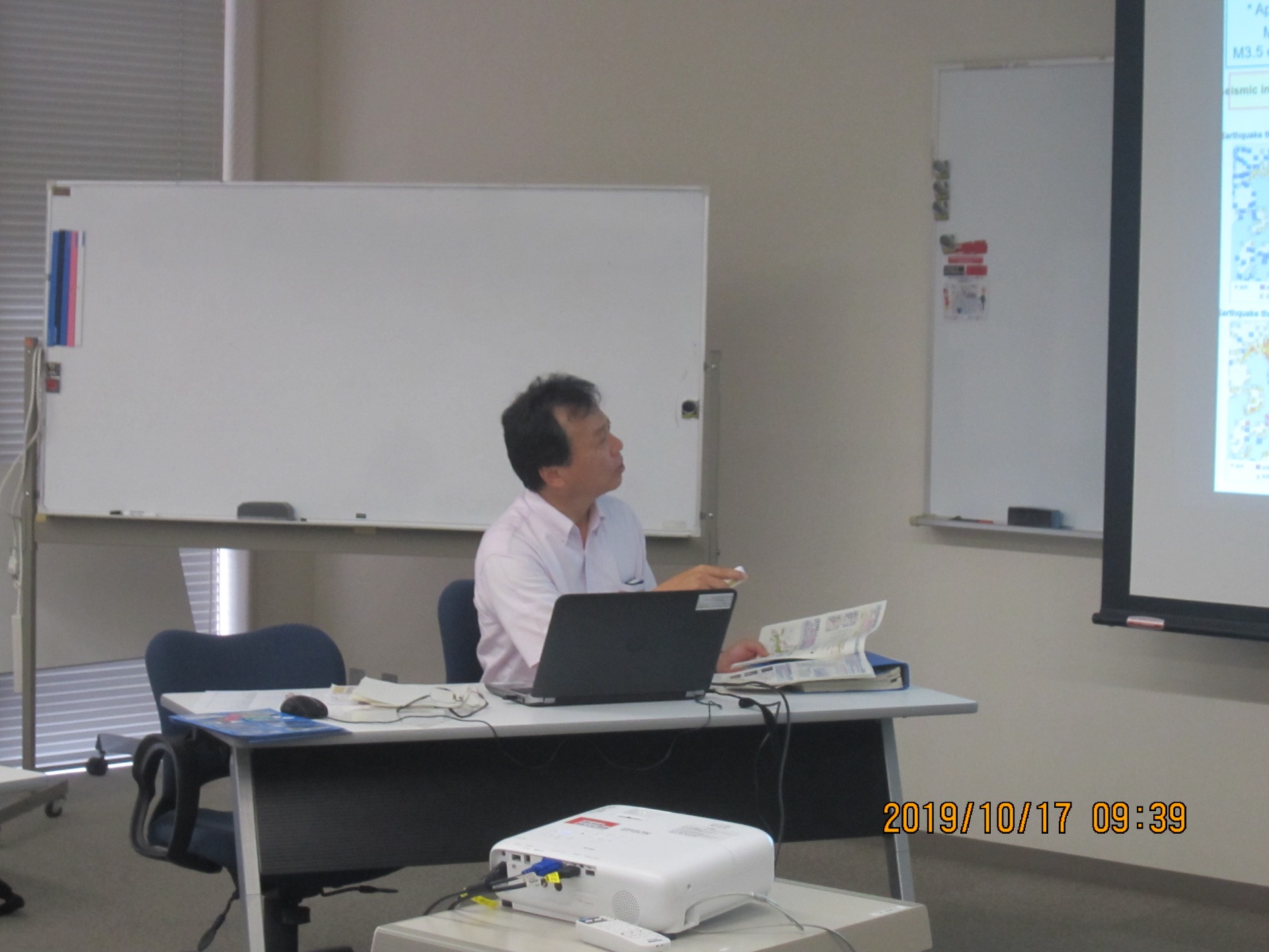 Morning lecture was presented by Mr.Nakazono, Disaster Prevention Section, Department of Development and Construction, Okinawa General Bureau on "Road Disaster Prevention Measures". He used actual example of Typhoon no. 19 to explain how national government responds at the time of disaster. At the end, he briefed on disaster response activities of Okinawa General Bureau, and answered to a lot of questions.