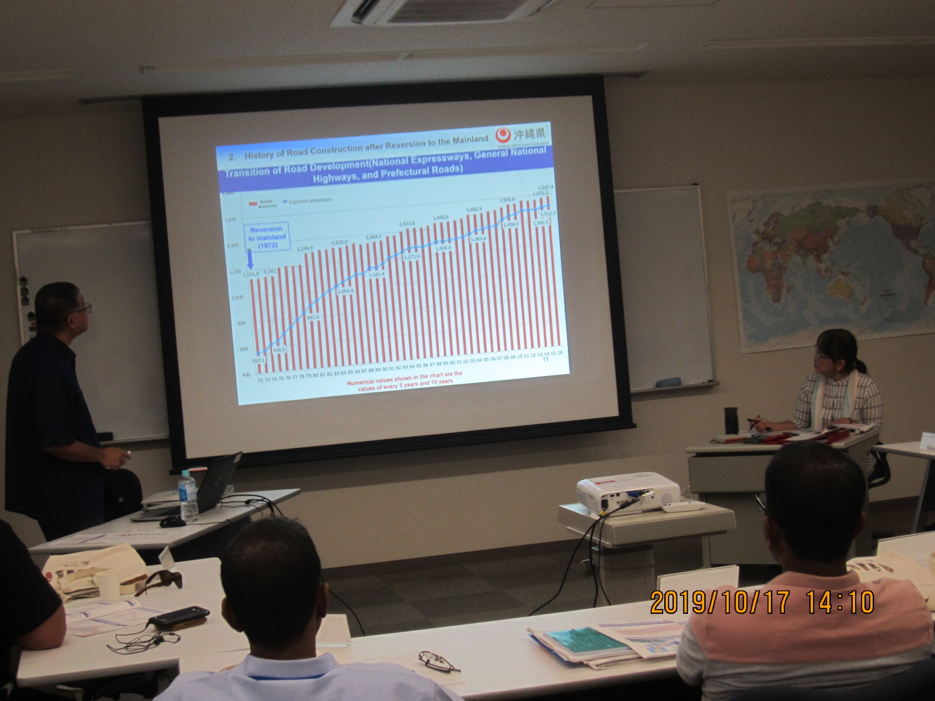We had a lecture given by the officers from Road Management Division, Department of Civil Engineering and Construction, Okinawa Prefectural Government, on "Road Maintenance by Okinawa Prefectural Government". They explained how and what kinds of road maintenance activities are carried out. Participants asked many questions about regulatory systems and selection of contractors.